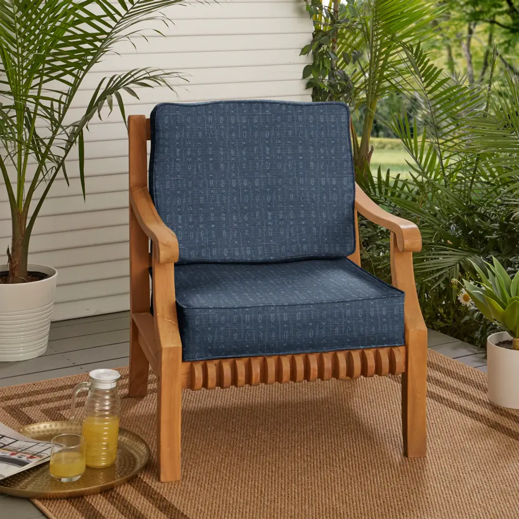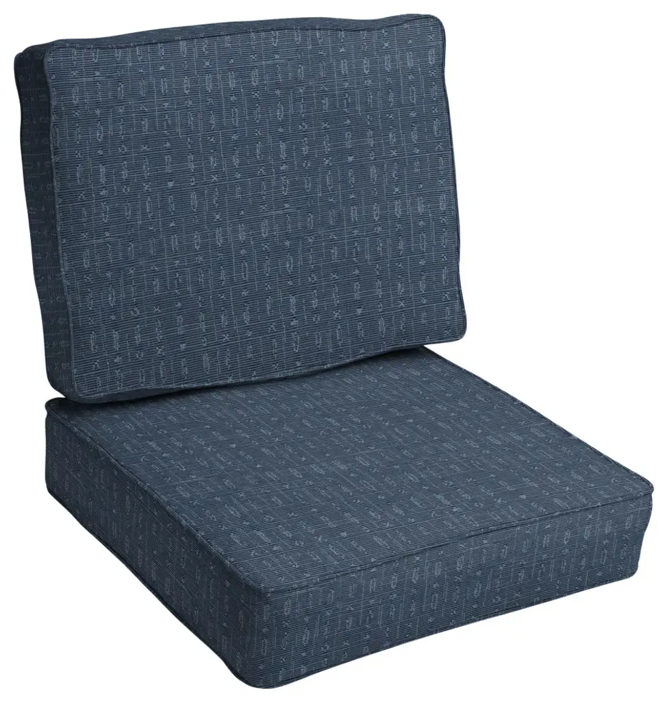 Slow down and take a breath of fresh air with the help of this luxurious chair cushion set! Featuring a gorgeous boho fabric in a rich, blue hue, this cushion set will update your outdoor space and give you that place of relaxation you desperately need! Crafted out of a performance material right here in North America, this chair cushion set is built to withstand sun, stains, and all other outdoor elements. Sunbrella is founded on the belief that fabrics should be both beautiful and functional. We began in the 1960s with the challenge of creating an awning canvas with a substantially longer lifespan than cotton. Sunbrella has become widely adopted for shade structures, marine canvas and upholstery fabric for both outdoor and indoor applications.Our textiles are made with close attention to design detail, and engineered with robust performance characteristics that provide resistance to fading and degradation from sunlight and chemical exposure. The fabric is tactile yet durable, has industry-leading environmental characteristics, is easy to care for and offers long life wherever it''s used.No Sunbrella manufacturing facility in the world sends waste to landfills. A result of our focus on efficiency, this monumental achievement allows Sunbrella to lead by example, putting sustainability into practice every day across the globe. Our unique coloring process not only makes Sunbrella fabrics fade-resistant, it also conserves more water than conventional dyeing processes. At Sunbrella we believe it''s important to preserve the environment around our facilities. We work to conserve the plant and animal life that is native to the area and encourage our employees to plant gardens designed to provide fresh food and nourish local wildlife.We stand behind our fabrics with a guarantee that''s the best in the industry: a 5-year limited warranty for upholstery. This warranty protects the original purchaser of Sunbrella fabric. This warranty protects against Sunbrella fabric becoming unserviceable due to color or strength loss from normal usage and exposure conditions, including sunlight, mildew and atmospheric chemicals.• Ideal for casual indoor and outdoor use• Includes one (1) back cushion and one (1) seat cushion• Cushion cover can be removed for easy cleaning• Available in a variety of sizes and colors to ensure that you find the perfect match for your furniture• Cushions only. Furniture not included.• • Made in North America•
