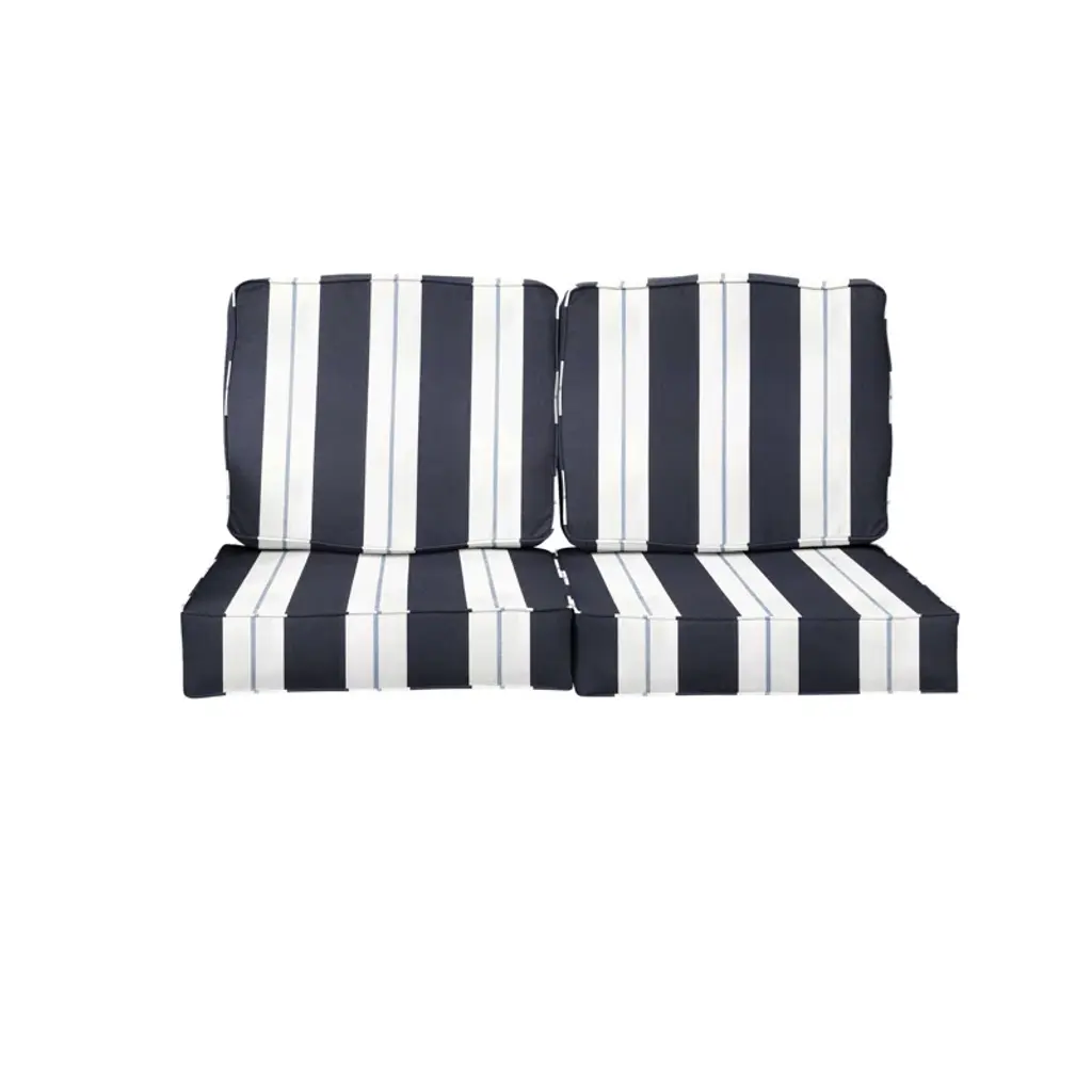 Enjoy nature with friends and family this season with the help of this luxurious loveseat cushion set! Featuring a classic stripe fabric in a rich, blue hue, this cushion set will create the perfect setting on your porch or patio for all of your outdoor get-togethers! Crafted out of a performance material right here in North America, this loveseat cushion set is built to withstand sun, stains and all other outdoor elements. Sunbrella is founded on the belief that fabrics should be both beautiful and functional. We began in the 1960s with the challenge of creating an awning canvas with a substantially longer lifespan than cotton. Sunbrella has become widely adopted for shade structures, marine canvas and upholstery fabric for both outdoor and indoor applications.Our textiles are made with close attention to design detail, and engineered with robust performance characteristics that provide resistance to fading and degradation from sunlight and chemical exposure. The fabric is tactile yet durable, has industry-leading environmental characteristics, is easy to care for and offers long life - wherever it''s used.No Sunbrella manufacturing facility in the world sends waste to landfills. A result of our focus on efficiency, this monumental achievement allows Sunbrella to lead by example, putting sustainability into practice every day across the globe. Our unique coloring process not only makes Sunbrella fabrics fade-resistant, it also conserves more water than conventional dyeing processes. At Sunbrella we believe it''s important to preserve the environment around our facilities. We work to conserve the plant and animal life that is native to the area and encourage our employees to plant gardens designed to provide fresh food and nourish local wildlife.We stand behind our fabrics with a guarantee that''s the best in the industry: a 5-year limited warranty for upholstery. This warranty protects the original purchaser of Sunbrella fabric. This warranty protects against Sunbrella fabric becoming unserviceable due to color or strength loss from normal usage and exposure conditions, including sunlight, mildew and atmospheric chemicals.• Ideal for casual indoor and outdoor use• Includes two (2) back cushions and two (2) seat cushions• Cushion covers can be removed for easy cleaning• Available in a variety of colors to ensure that you find the perfect match for your decor style• Cushions only. Furniture not included.• • Made in North America•