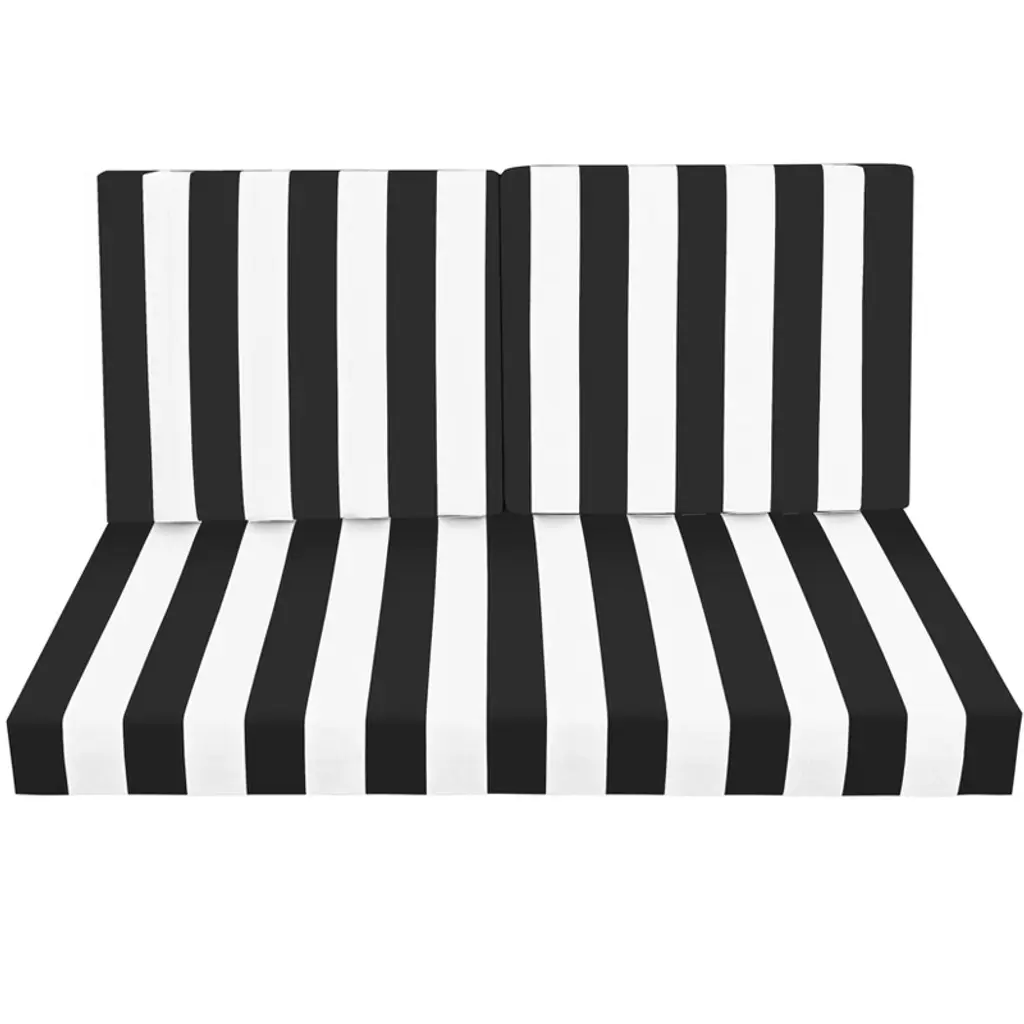 Soak in the sunshine on your porch or patio with the help of this cozy loveseat pillow and cushion set! Featuring a timeless stripe fabric in a rich, black hue, this pillow set is sure to add style to your space and make you enjoy the outdoors so much more! Crafted out of a performance material right here in North America, these pillows are built to withstand sun, stains and weather so that you can enjoy them worry-free! Sunbrella is founded on the belief that fabrics should be both beautiful and functional. We began in the 1960s with the challenge of creating an awning canvas with a substantially longer lifespan than cotton. Sunbrella has become widely adopted for shade structures, marine canvas and upholstery fabric for both outdoor and indoor applications.Our textiles are made with close attention to design detail, and engineered with robust performance characteristics that provide resistance to fading and degradation from sunlight and chemical exposure. The fabric is tactile yet durable, has industry-leading environmental characteristics, is easy to care for and offers long life - wherever it''s used.No Sunbrella manufacturing facility in the world sends waste to landfills. A result of our focus on efficiency, this monumental achievement allows Sunbrella to lead by example, putting sustainability into practice every day across the globe. Our unique coloring process not only makes Sunbrella fabrics fade-resistant, it also conserves more water than conventional dyeing processes. At Sunbrella we believe it''s important to preserve the environment around our facilities. We work to conserve the plant and animal life that is native to the area and encourage our employees to plant gardens designed to provide fresh food and nourish local wildlife.We stand behind our fabrics with a guarantee that''s the best in the industry: a 5-year limited warranty for upholstery. This warranty protects the original purchaser of Sunbrella fabric. This warranty protects against Sunbrella fabric becoming unserviceable due to color or strength loss from normal usage and exposure conditions, including sunlight, mildew and atmospheric chemicals.• Ideal for casual indoor and outdoor use• Includes two (2) back pillows and two (2) seat cushions• Cushion cover can be removed for easy cleaning. Pillow cover is not removable.• Available in a variety of sizes and colors to ensure that you find the perfect match for your furniture• Pillows and cushions only. Furniture not included.• • Made in North America•