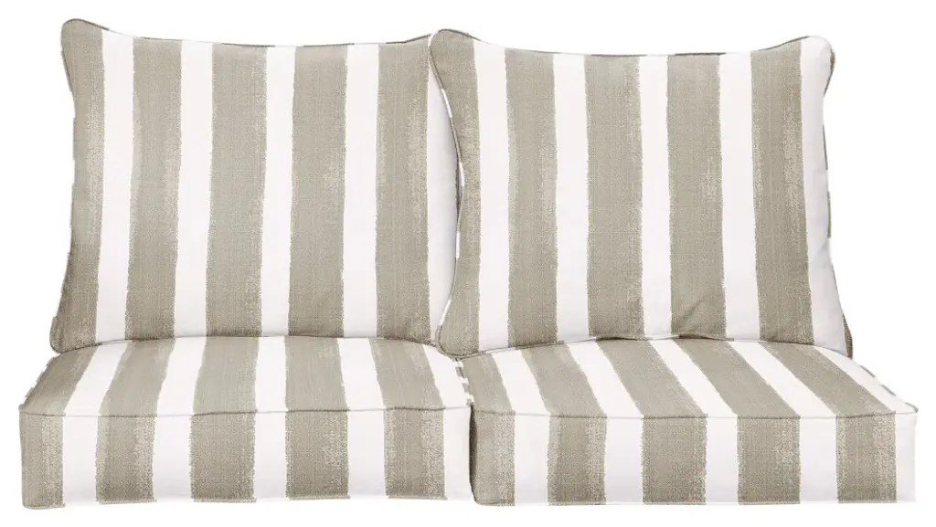 Soak in the sunshine on your porch or patio with the help of this cozy loveseat pillow and cushion set! Featuring a timeless stripe fabric in a rich, red hue, this pillow set is sure to add style to your space and make you enjoy the outdoors so much more! Crafted out of a performance material right here in North America, these pillows are built to withstand sun, stains and weather so that you can enjoy them worry-free! Sunbrella is founded on the belief that fabrics should be both beautiful and functional. We began in the 1960s with the challenge of creating an awning canvas with a substantially longer lifespan than cotton. Sunbrella has become widely adopted for shade structures, marine canvas and upholstery fabric for both outdoor and indoor applications.Our textiles are made with close attention to design detail, and engineered with robust performance characteristics that provide resistance to fading and degradation from sunlight and chemical exposure. The fabric is tactile yet durable, has industry-leading environmental characteristics, is easy to care for and offers long life - wherever it''s used.No Sunbrella manufacturing facility in the world sends waste to landfills. A result of our focus on efficiency, this monumental achievement allows Sunbrella to lead by example, putting sustainability into practice every day across the globe. Our unique coloring process not only makes Sunbrella fabrics fade-resistant, it also conserves more water than conventional dyeing processes. At Sunbrella we believe it''s important to preserve the environment around our facilities. We work to conserve the plant and animal life that is native to the area and encourage our employees to plant gardens designed to provide fresh food and nourish local wildlife.We stand behind our fabrics with a guarantee that''s the best in the industry: a 5-year limited warranty for upholstery. This warranty protects the original purchaser of Sunbrella fabric. This warranty protects against Sunbrella fabric becoming unserviceable due to color or strength loss from normal usage and exposure conditions, including sunlight, mildew and atmospheric chemicals.• Ideal for casual indoor and outdoor use• Includes two (2) back pillows and two (2) seat cushions• Cushion cover can be removed for easy cleaning. Pillow cover is not removable.• Available in a variety of sizes and colors to ensure that you find the perfect match for your furniture• Pillows and cushions only. Furniture not included.• • Made in North America•
