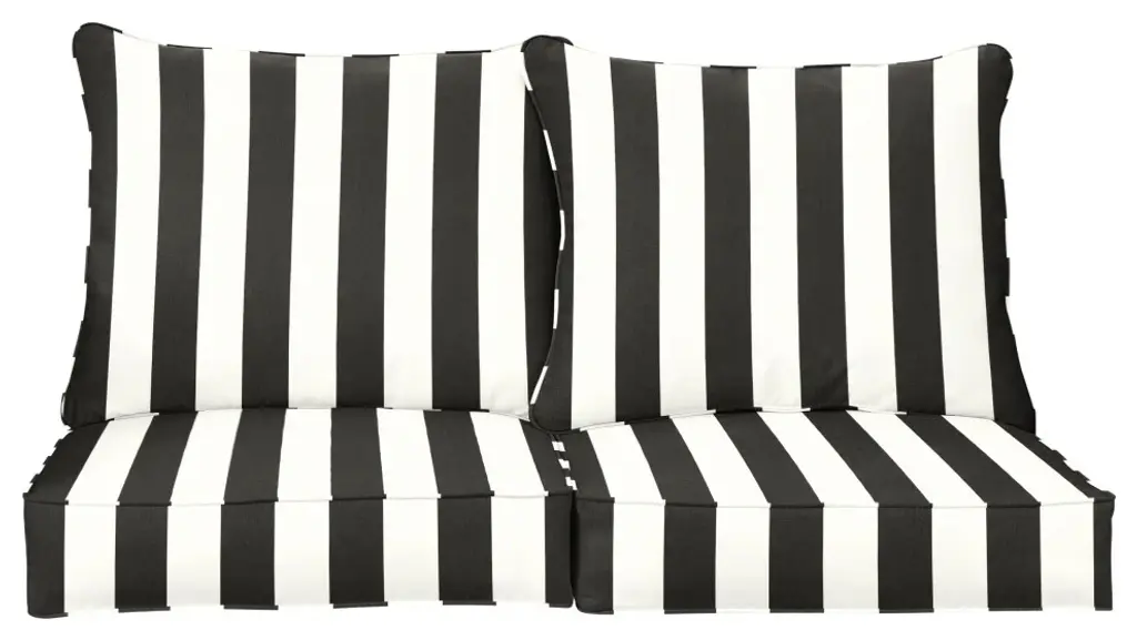 Soak in the sunshine on your porch or patio with the help of this cozy loveseat pillow and cushion set! Featuring a timeless stripe fabric in a rich, black hue, this pillow set is sure to add style to your space and make you enjoy the outdoors so much more! Crafted out of a performance material right here in North America, these pillows are built to withstand sun, stains and weather so that you can enjoy them worry-free! Sunbrella is founded on the belief that fabrics should be both beautiful and functional. We began in the 1960s with the challenge of creating an awning canvas with a substantially longer lifespan than cotton. Sunbrella has become widely adopted for shade structures, marine canvas and upholstery fabric for both outdoor and indoor applications.Our textiles are made with close attention to design detail, and engineered with robust performance characteristics that provide resistance to fading and degradation from sunlight and chemical exposure. The fabric is tactile yet durable, has industry-leading environmental characteristics, is easy to care for and offers long life - wherever it''s used.No Sunbrella manufacturing facility in the world sends waste to landfills. A result of our focus on efficiency, this monumental achievement allows Sunbrella to lead by example, putting sustainability into practice every day across the globe. Our unique coloring process not only makes Sunbrella fabrics fade-resistant, it also conserves more water than conventional dyeing processes. At Sunbrella we believe it''s important to preserve the environment around our facilities. We work to conserve the plant and animal life that is native to the area and encourage our employees to plant gardens designed to provide fresh food and nourish local wildlife.We stand behind our fabrics with a guarantee that''s the best in the industry: a 5-year limited warranty for upholstery. This warranty protects the original purchaser of Sunbrella fabric. This warranty protects against Sunbrella fabric becoming unserviceable due to color or strength loss from normal usage and exposure conditions, including sunlight, mildew and atmospheric chemicals.• Ideal for casual indoor and outdoor use• Includes two (2) back pillows and two (2) seat cushions• Cushion cover can be removed for easy cleaning. Pillow cover is not removable.• Available in a variety of sizes and colors to ensure that you find the perfect match for your furniture• Pillows and cushions only. Furniture not included.• • Made in North America•