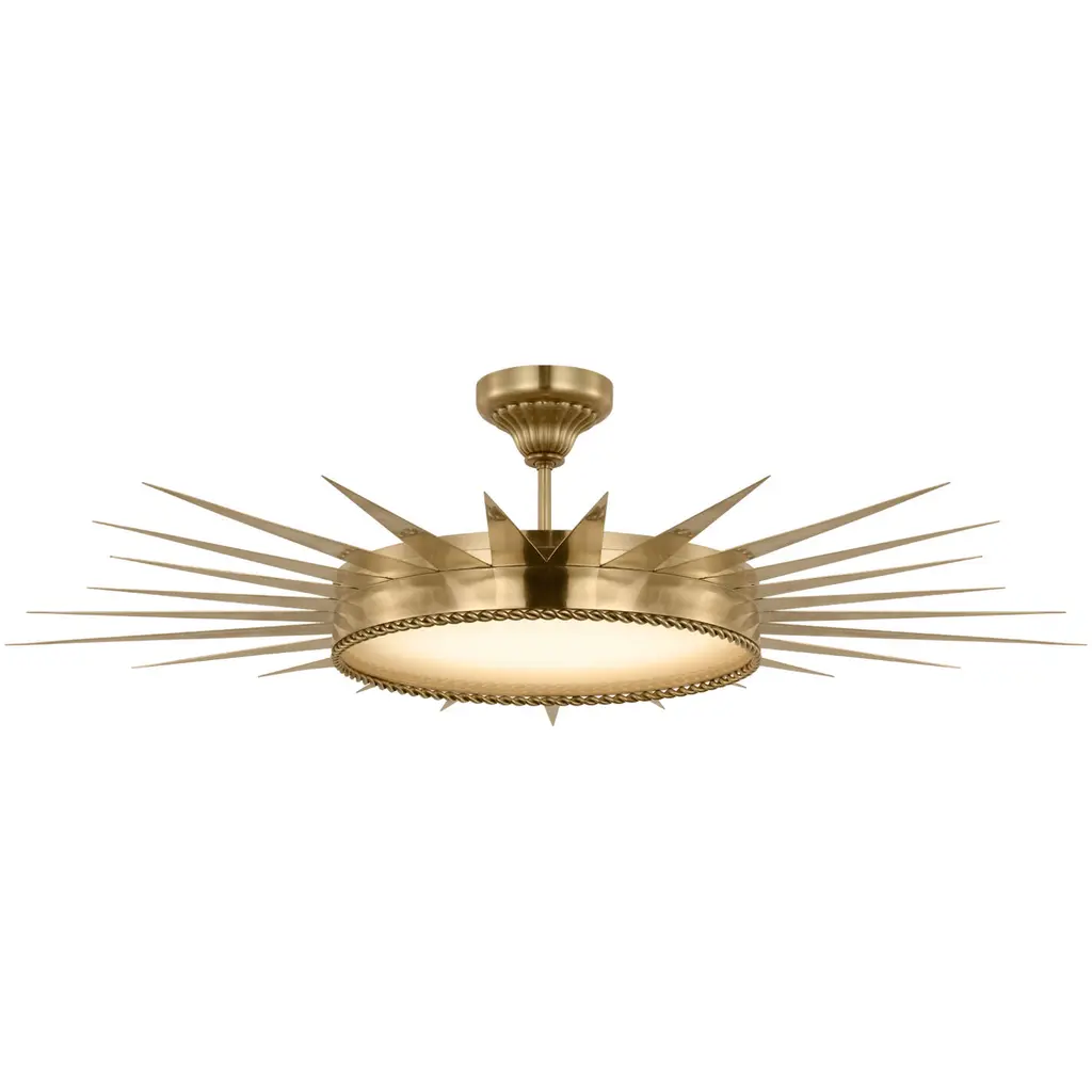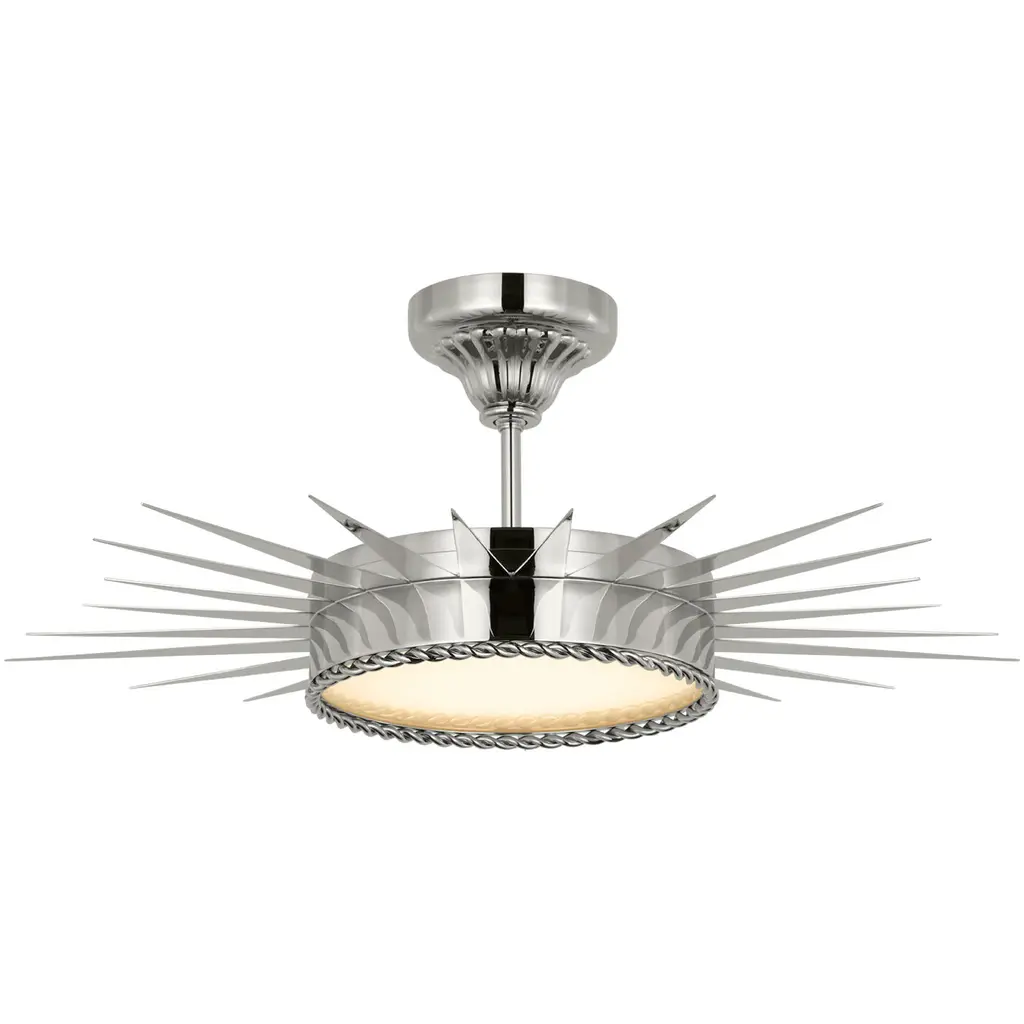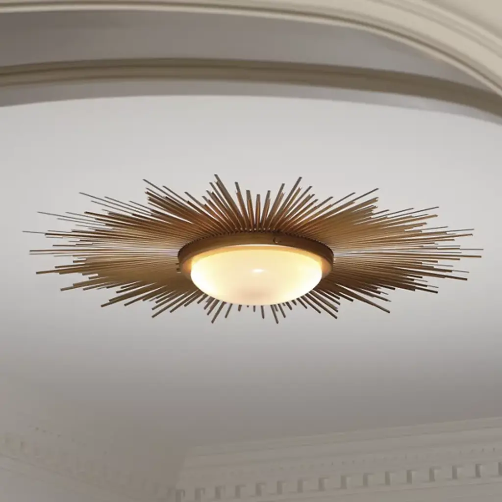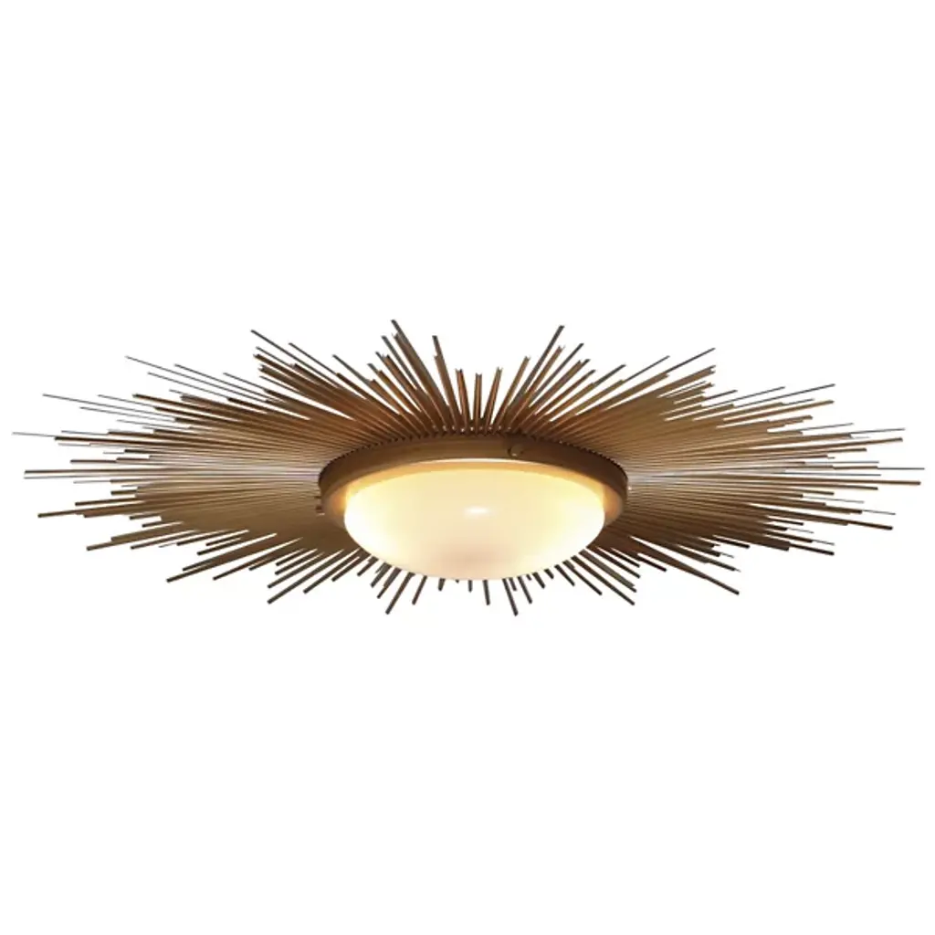 Let the sunshine in. And keep it there. Evocative of the mid-century decorative wall sculptures of C. Jere, the Global Views Sunburst Flushmount is all about the points of light. Thin shards of metallic rays surround a solar center of frosted convex glass, the variable spired extensions radiating outward to create an overhead fixture with a sunny disposition.