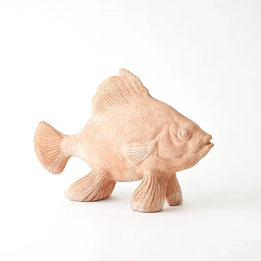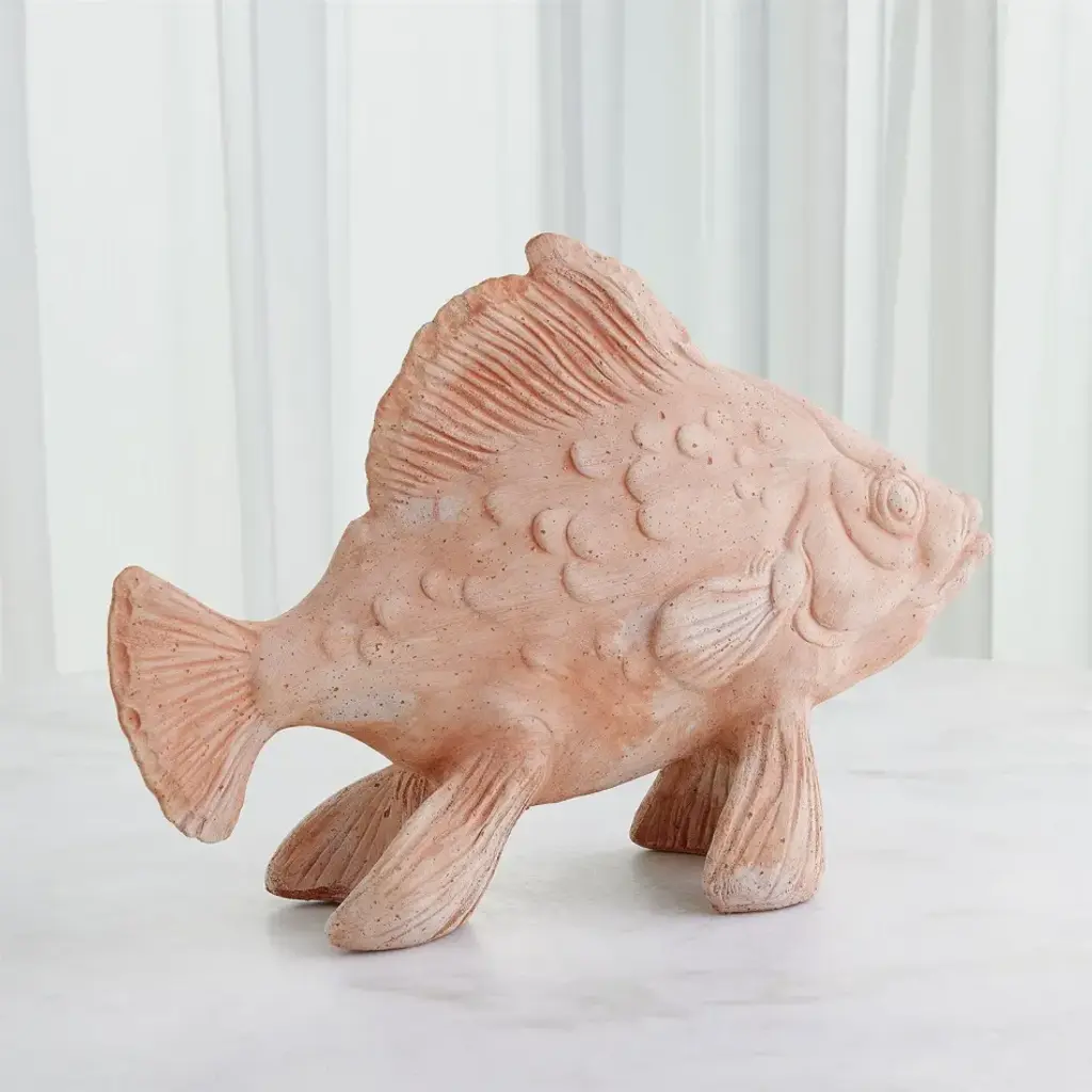 The Sunfish Sculpture is meticulously crafted from Italian terracotta clay. Artisans hand-pack the clay into molds through a process called Calco. Each mold is then left to dry for 2-3 days, during which the clay naturally shrinks, making it easy to remove the mold. The sculpture is then transferred to a kiln and fired at 950 degrees, resulting in a stunning piece that can grace your space both indoors and outdoors. From a fashion forward perspective, Global Views offers accessories, furniture, statement lighting, and an assortment of rugs and mirrors to add beauty and joy to your home.
