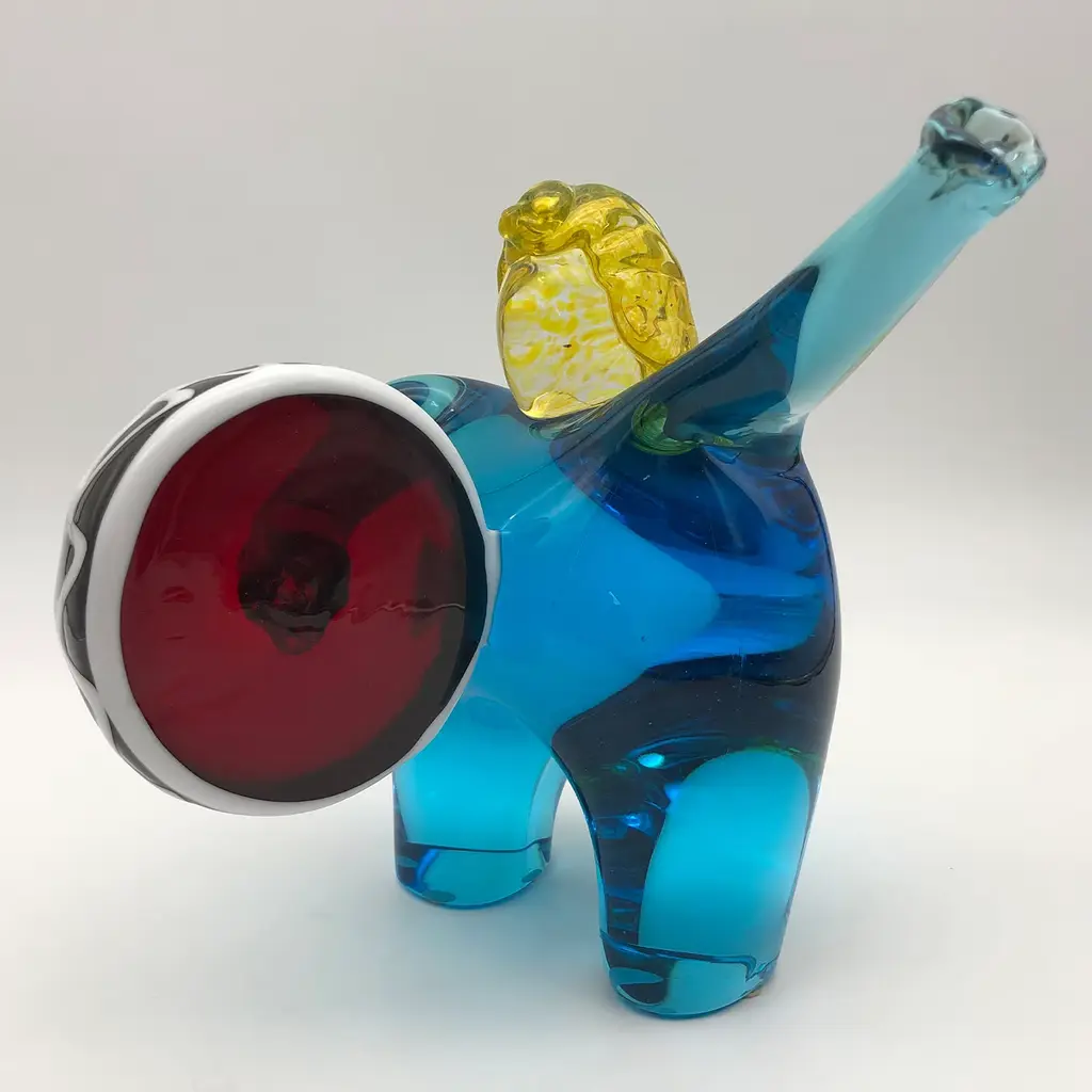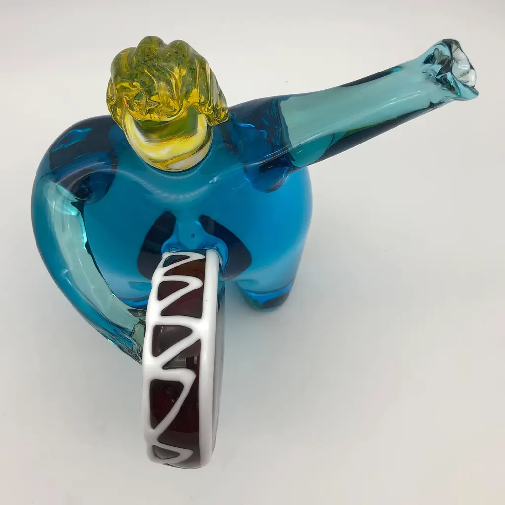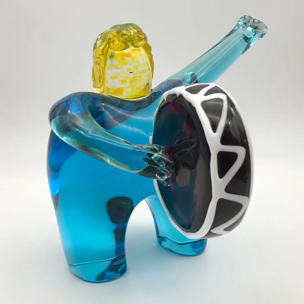 A deft showcase of craftsmanship, this exceptional small sculpture belongs to a refined series of designs uniquely handmade by Ars Murano. Defined by a transparent aquamarine color, it depicts a drum player distinguished by a clear yellow head, holding a brown and white drum. Effortlessly elevating any decor, it will be a creative housewarming gift for friends or loved ones.