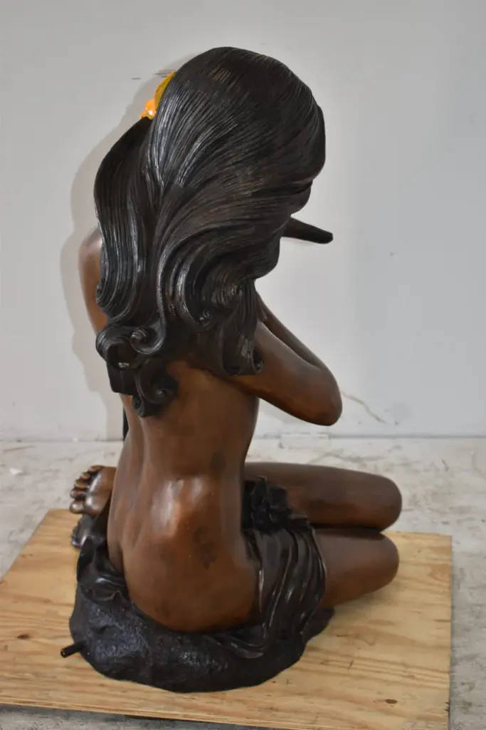 A beautiful looking young girl sitting by the beach listening to a shell bronze statue, fountain. Water spills from the shell with the help of a water pump (pump is not included). Our impressive, statue is expertly finished with a hand-applied, classic bronze patina accented by a yellow flower and antiqued tone of brown patinas. This bronze statue is museum quality, hand-cast with pure bronze using the Lost Wax Process of bronze casting. Size: 21"L x 20"W x 31"H. Weight is: 53Lb