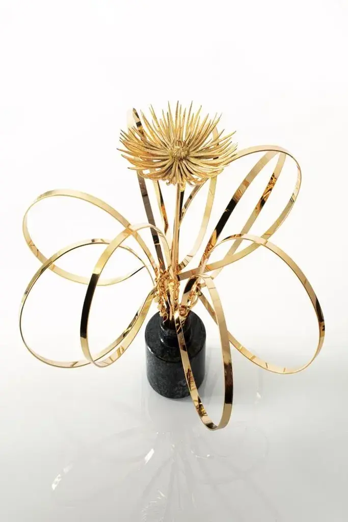 Marcella Trimarchi was inspired by the beauty of nature, reproducing in brass of the compositions that initially made with fresh flowers and leaves. The long leaves folded by hand find themselves in a casual and harmonious frame for a single flower in the center of the arrangement. The sculpture creates a set of full and empty in space in an absolute lightness and an infinite shadow game suggesting the movement of the leaves moved by the wind. The flower, made with the lost wax technique, is subsequently remodeled by hand to give more depth and movement to the petals. Brass is 24K gold plated. The base is in marble turned by hand-colored Green Guatemala. Stamped by Maker