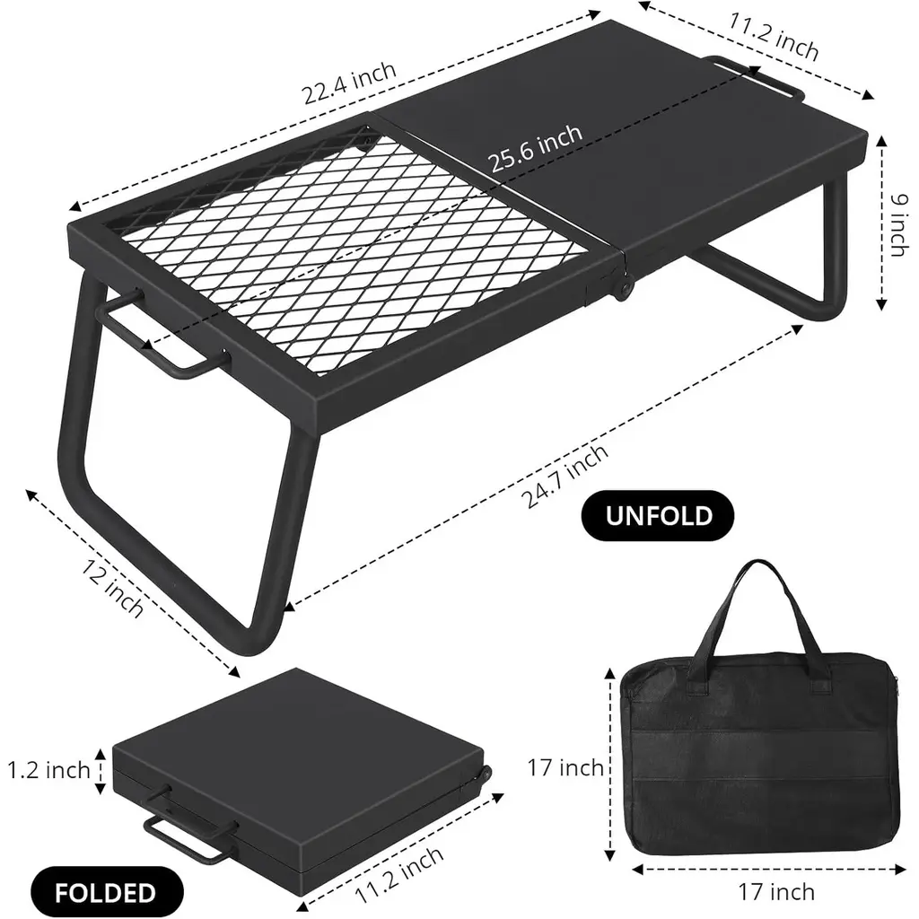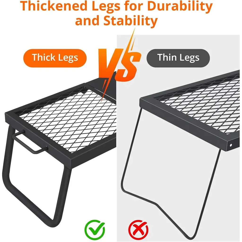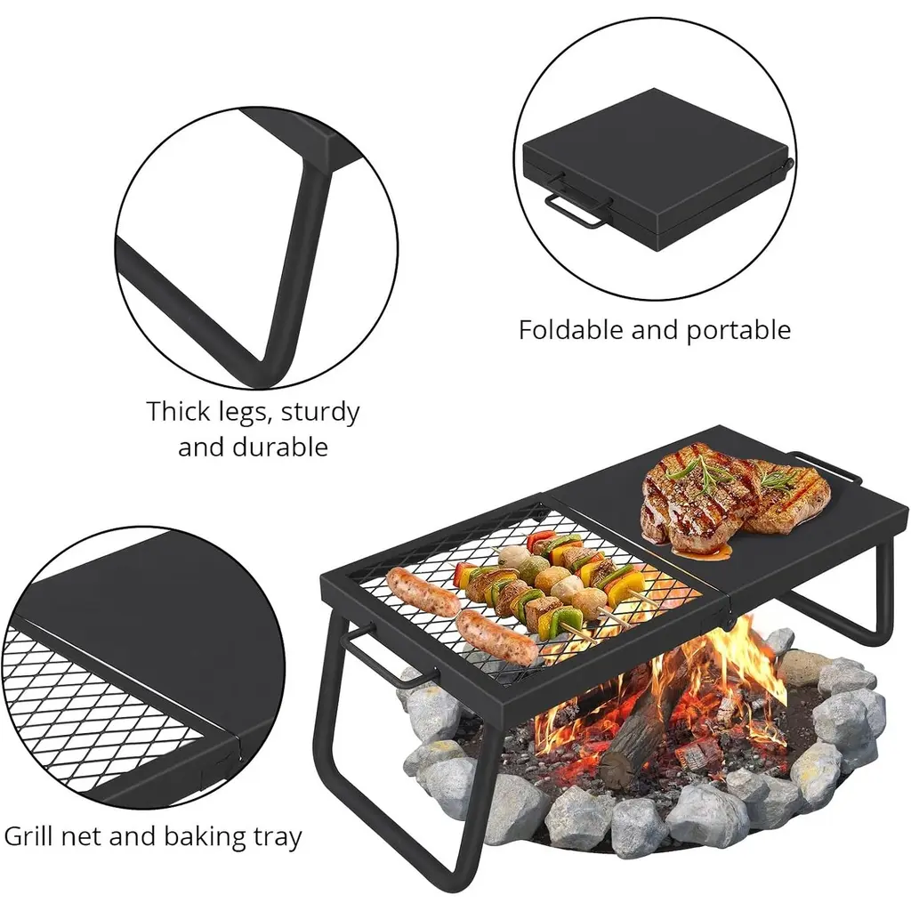 Durable Heavy-Duty Construction: Crafted from robust steel with a protective surface coating, this fire pit grate is not only durable but also resistant to rust and capable of withstanding high temperatures. A reliable choice for long-lasting outdoor cooking experiences. High-Quality Steel: The fire pit grate is made of heavy-duty steel with a coat of paint on the surface, which is durable, food-grade, rust-proof, and high-temperature heat resistant. It can stand temperatures up to 1112℉ / 600℃ without deformation and cracking. Efficient Heat Distribution: Our foldable grill grate features a diamond mesh design that ensures efficient heat transfer and even cooking. Say goodbye to unevenly cooked food and enjoy perfectly grilled steaks, fish, pizza and vegetables without having to worry about food falling off. User-Friendly and Convenient: Designed with foldable functionality and equipped with handles on both sides, this Outdoor Portable Campfire Grill is easy to carry and store. Set it up in seconds for your next outdoor adventure or backyard BBQ. Larger Cooking Area: The larger cooking area makes our fire pit grate perfect for family or friend gatherings. It can hold up to 25 pounds of food to feed 8 people. It can be placed directly over the fire with no assembly required, allowing you to grill steaks, fish, kebabs, ribs, pizza, sausages, oysters, and a variety of vegetables.