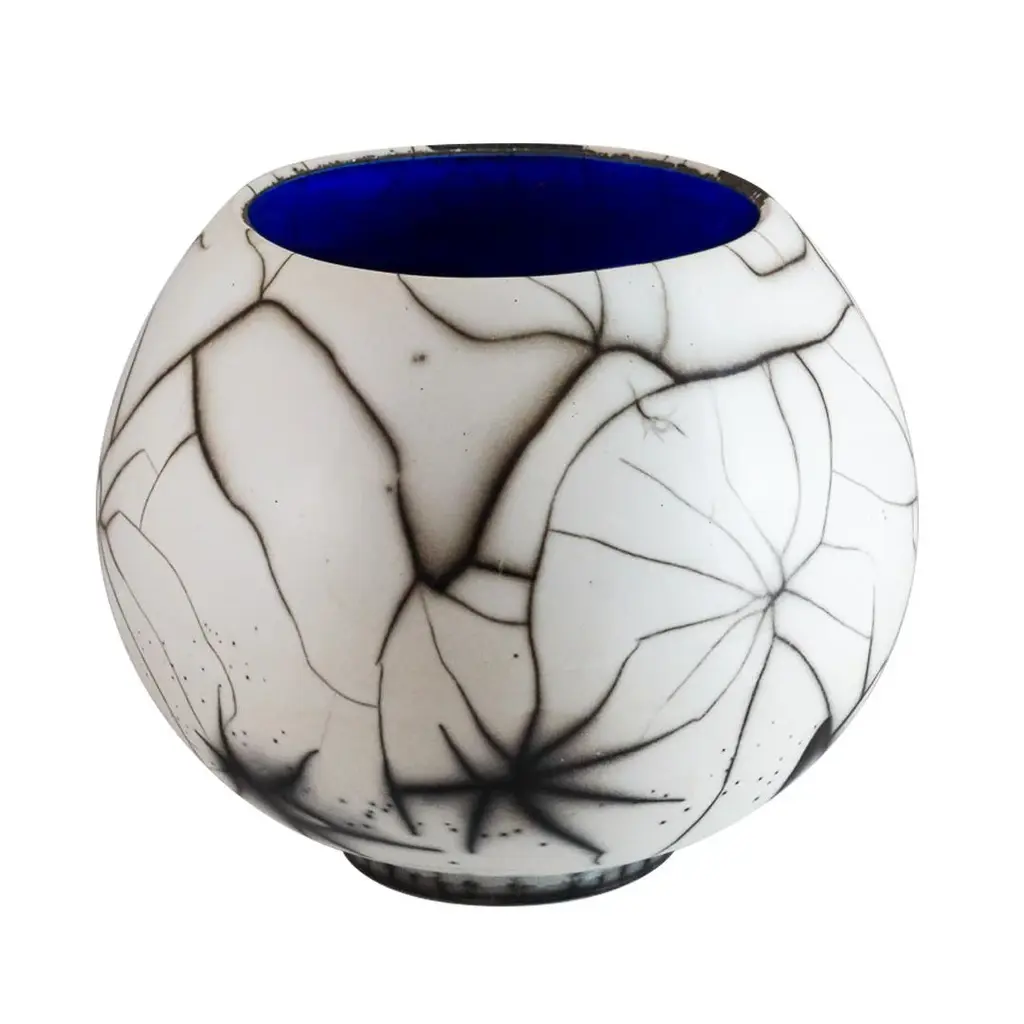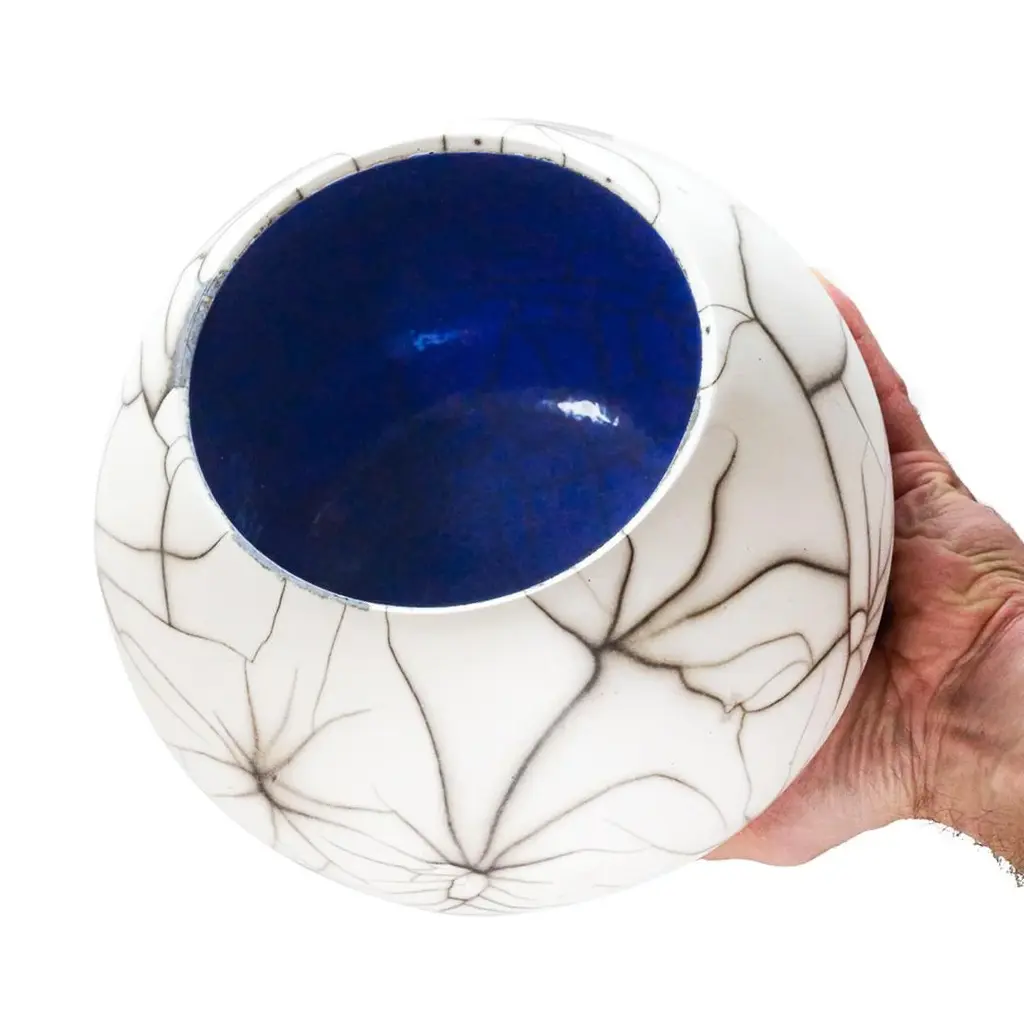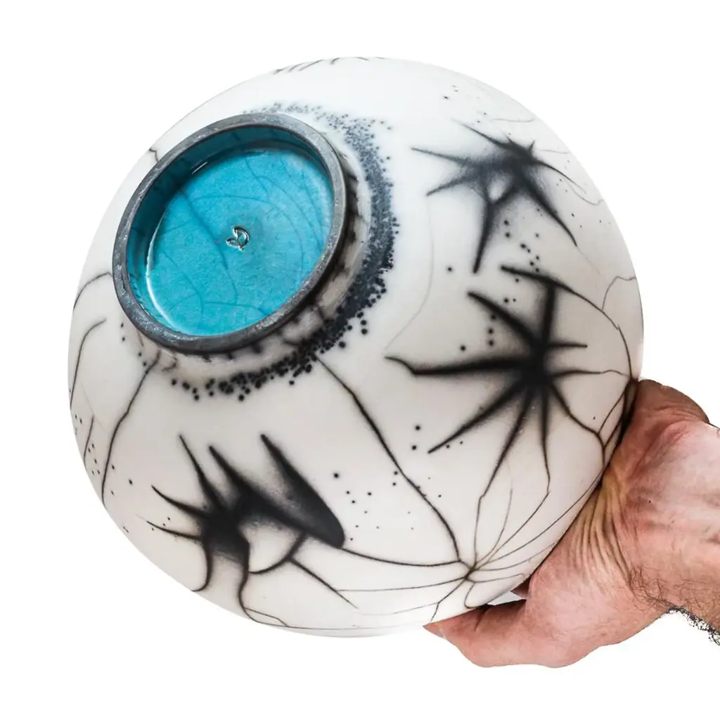 Bowl L is made of ceramic using the Naked Raku and Raku technique. The Bowl is created entirely by hand and is finished on the potter's wheel to give it a nice, smooth appearance. Three layers of sealed earth are applied to the surface to increase its luminosity. Each Bowl is fired twice, the first time called a "cookie" and the second time on the Raku kiln. A blue Crystalline crackle is applied to the inside of the Bowl. The outer surface is unglazed to ensure a natural and elegant appearance. A turquoise raku crystalline is applied to the foot. The contrast between the shiny interior and the matte exterior gives this sculpture a unique character. Stamped by Maker
