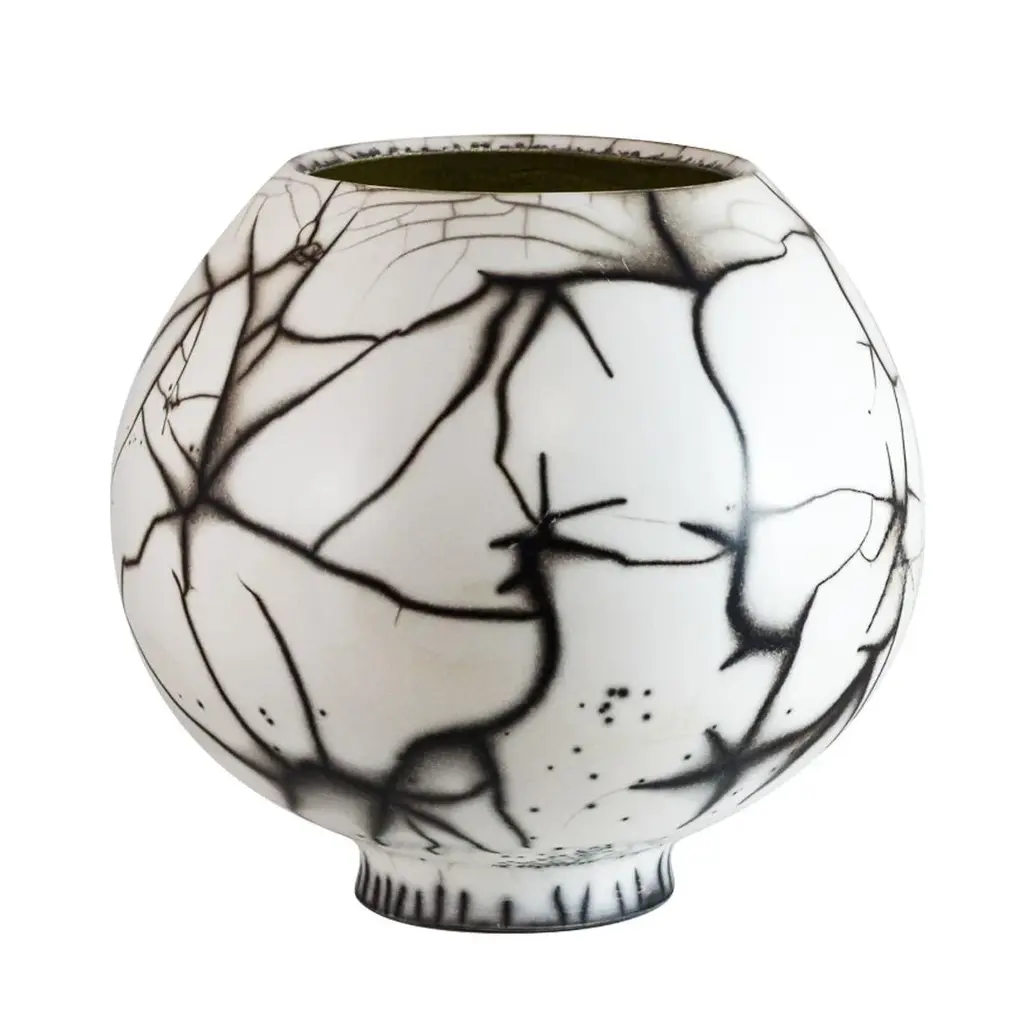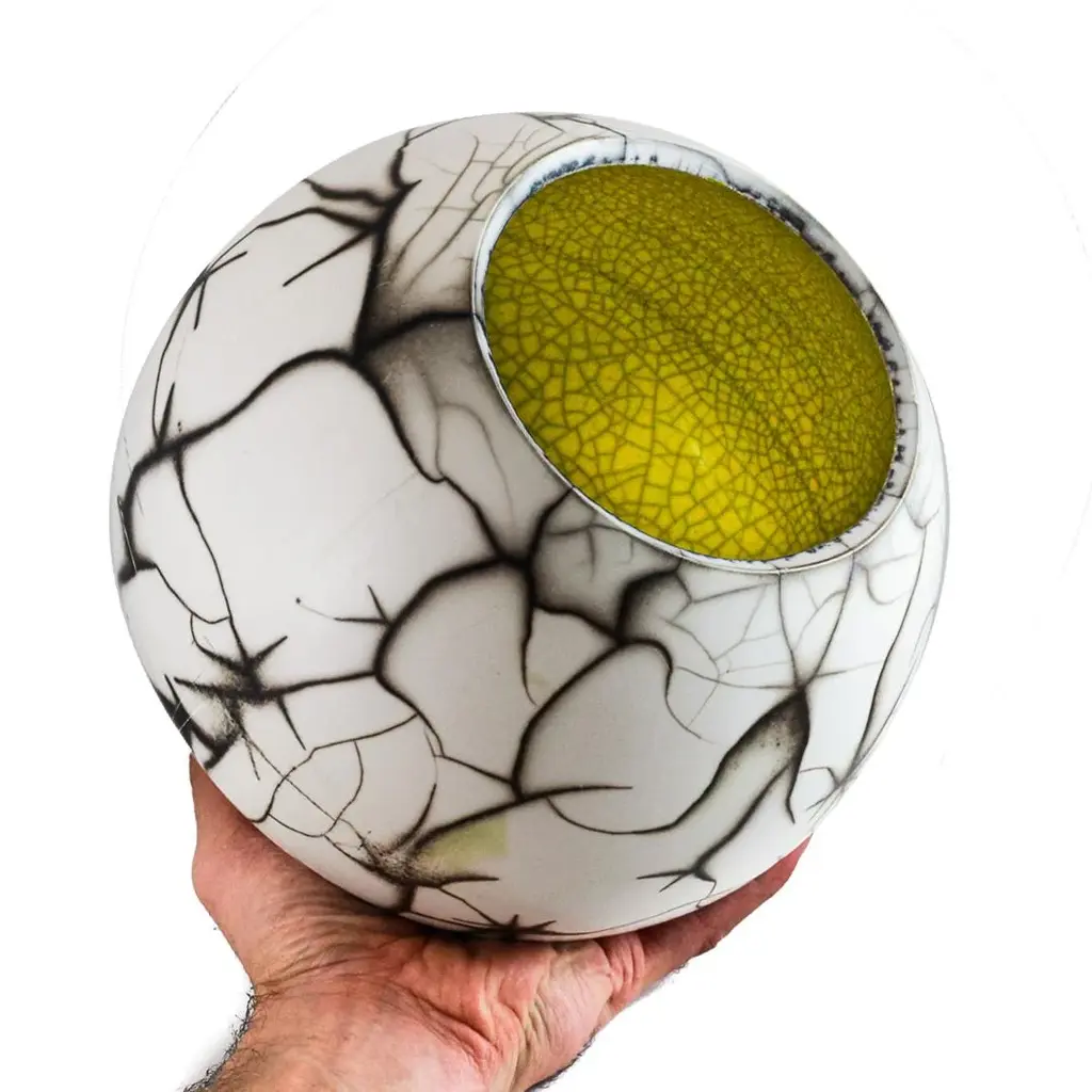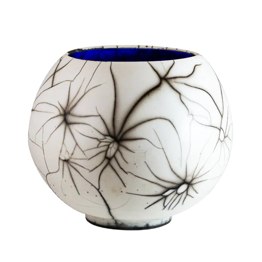 Bowl L is made of ceramic using the Naked Raku and Raku technique. The Bowl is created entirely by hand and is finished on the potter's wheel to give it a nice, smooth appearance. Three layers of sealed earth are applied to the surface to increase its luminosity. Each Bowl is fired twice, the first time called a "cookie" and the second time on the Raku kiln. A blue Crystalline crackle is applied to the inside of the Bowl. The outer surface is unglazed to ensure a natural and elegant appearance. A turquoise raku crystalline is applied to the foot. The contrast between the shiny interior and the matte exterior gives this sculpture a unique character. Stamped by Maker