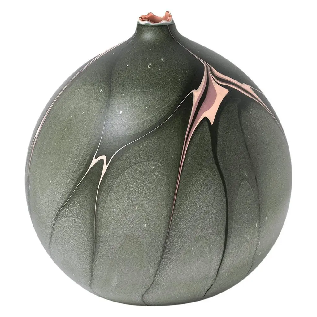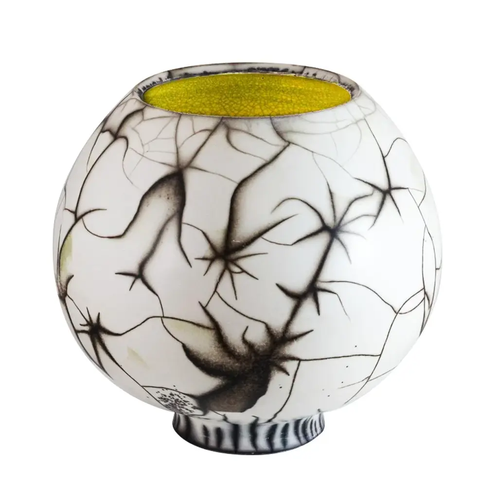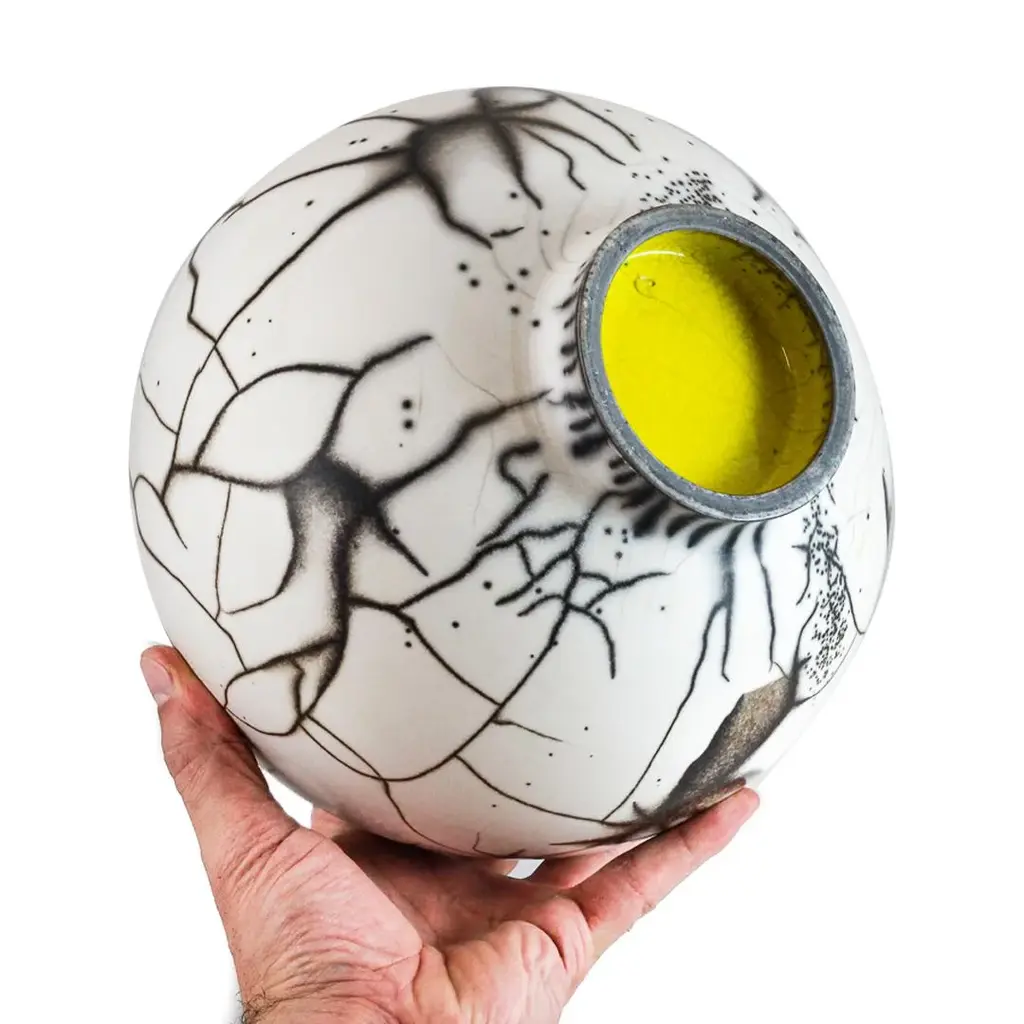 Bowl L is made of ceramic using the Naked Raku and Raku technique. The Bowl is created entirely by hand and is finished on the potter's wheel to give it a nice, smooth appearance. Three layers of sealed earth are applied to the surface to increase its luminosity. Each Bowl is fired twice, the first time called a "cookie" and the second time on the Raku kiln. A blue Crystalline crackle is applied to the inside of the Bowl. The outer surface is unglazed to ensure a natural and elegant appearance. A turquoise raku crystalline is applied to the foot. The contrast between the shiny interior and the matte exterior gives this sculpture a unique character. Stamped by Maker