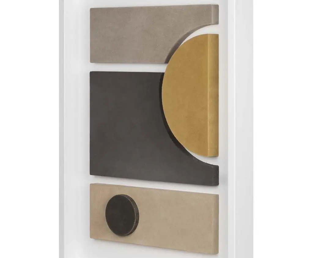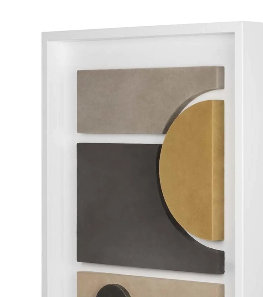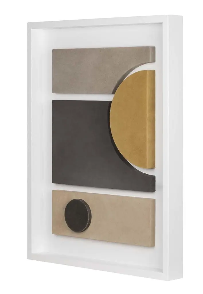 A true piece of art that will make a statement in a contemporary interior, this wall sculpture is masterfully crafted of leather from an Exclusive Design by Gio Bagnara. Creating the perfect interaction between geometric shapes and colors, this decorative piece features a rectangular frame crafted of white nappa leather and an abstract-inspired design fashioned entirely of soft suede. An ocher demilune element intersects three rectangles (sand, brown, and ivory from the top) accented with a small brown circle, for a stunning visual impact.