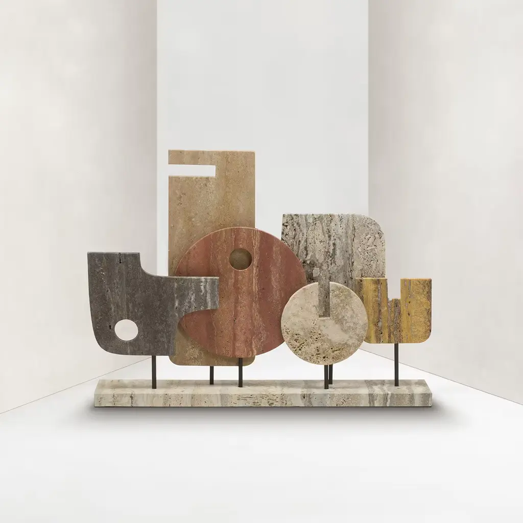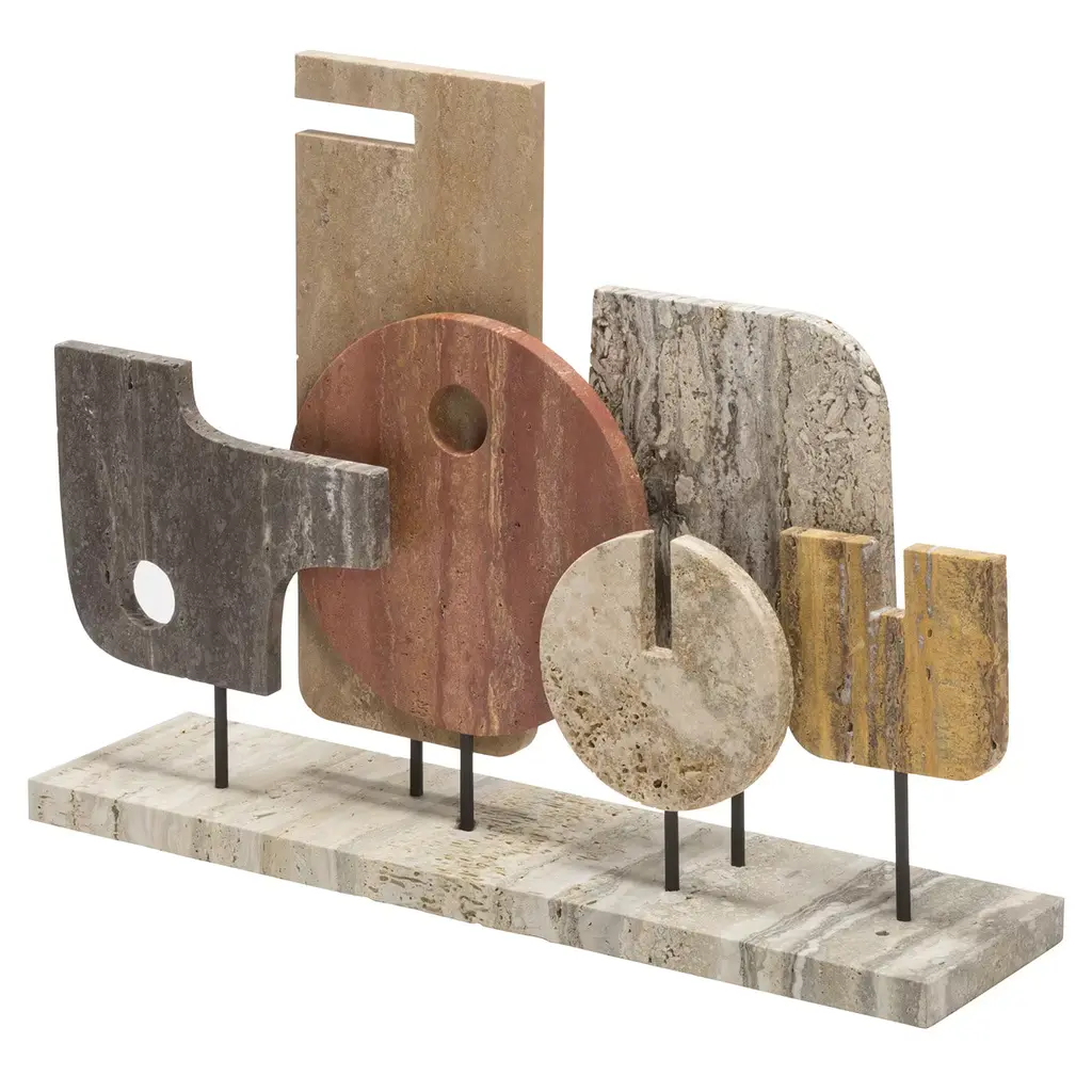 Providing any room of a contemporary or minimalist interior with a balanced and plush presence, this floor sculpture is part of an exclusive series by Giobagnara, inspired by atomic-age design and tribal art. Resting on six bronze stems rising from a marble base, it comprises six different types of Travertine marble shaped in abstract and extremely original silhouettes that merge creating a one-of-a-kind visually striking composition.