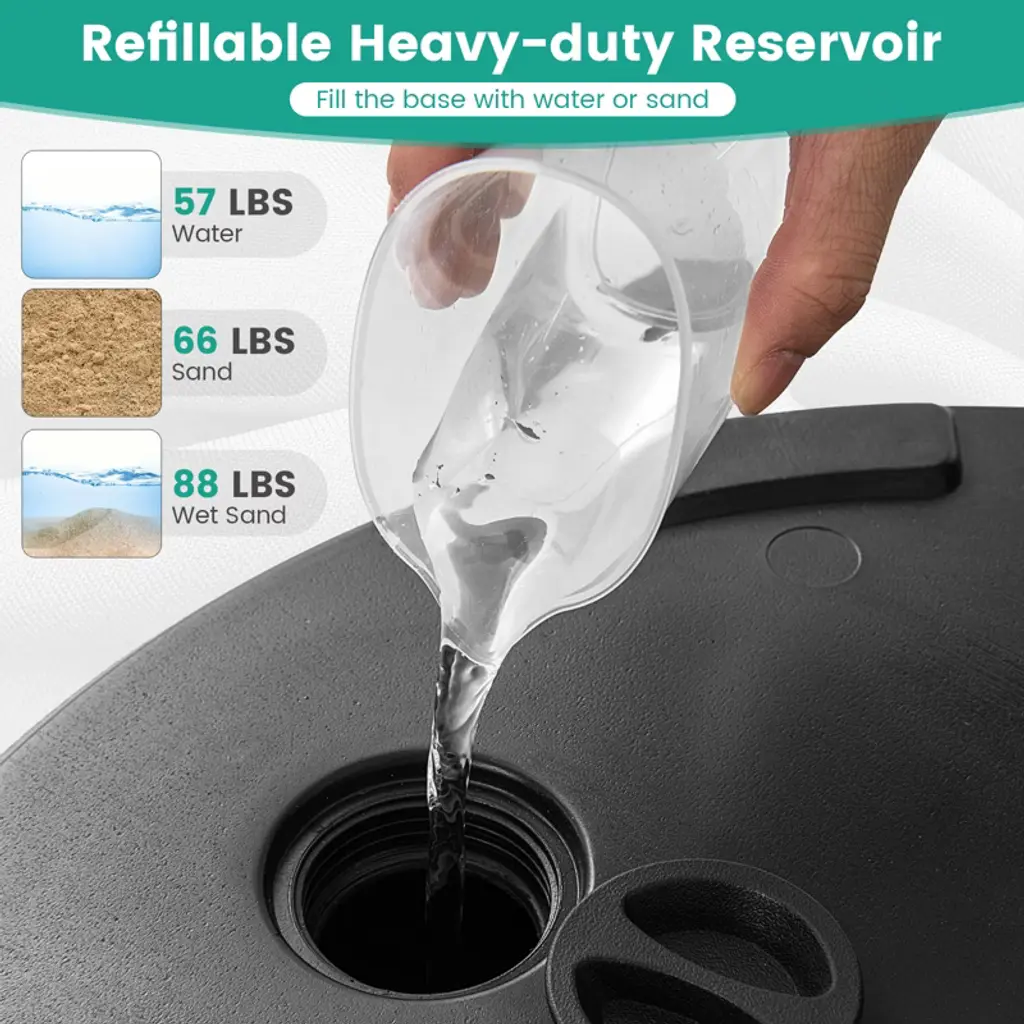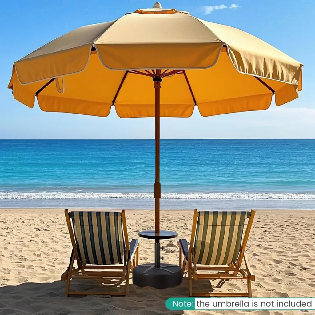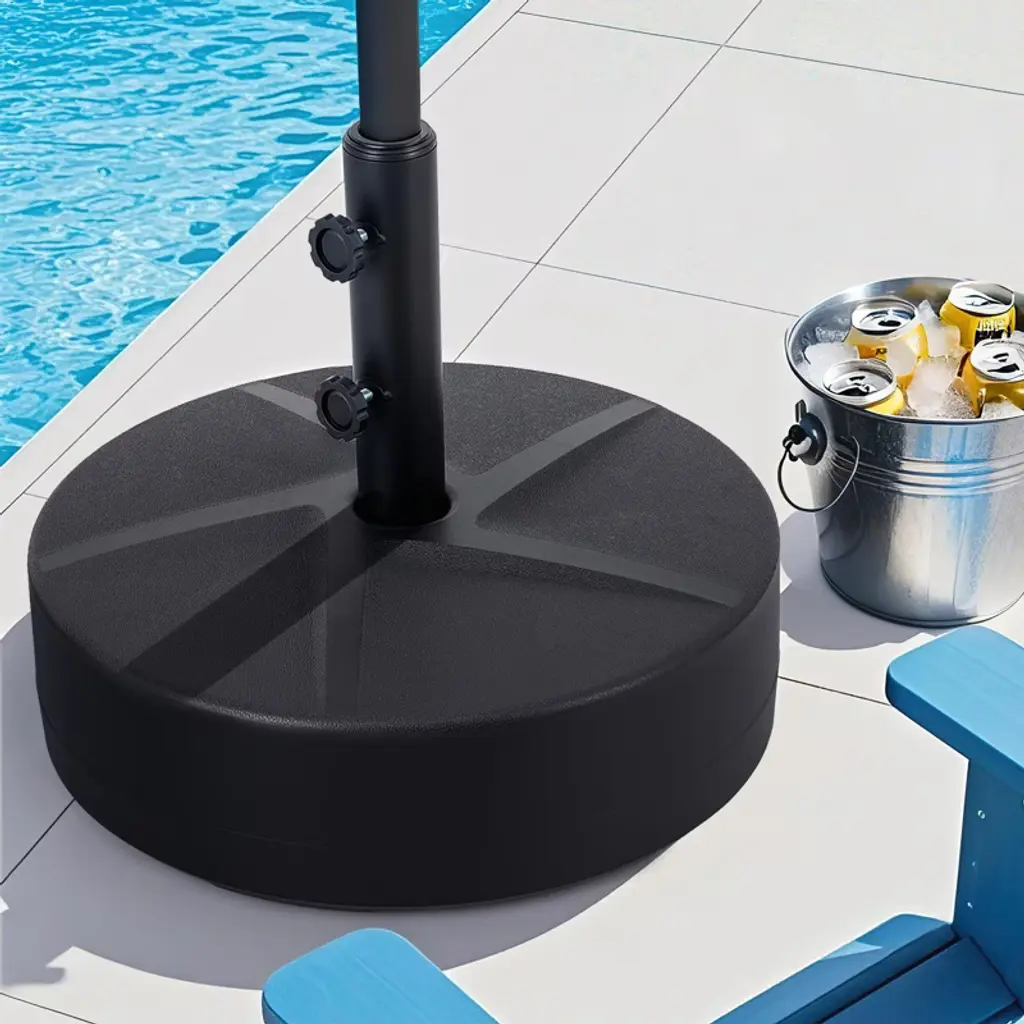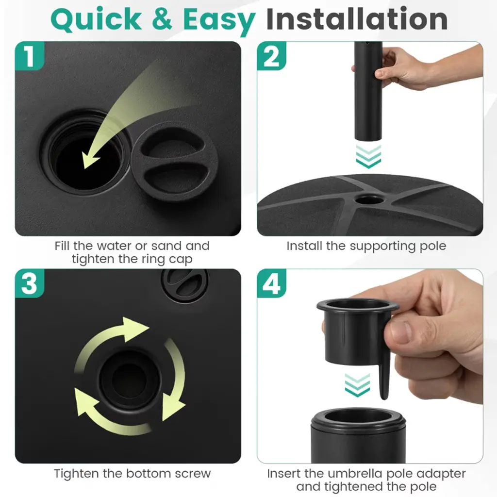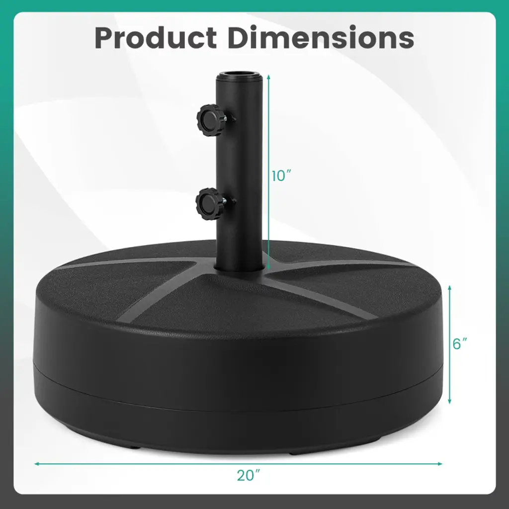 Looking for a reliable and versatile patio umbrella base? This umbrella base comes with 3 different pole adapters, ensuring compatibility with most standard 6-10 ft (180-300 cm) patio umbrellas. Besides, the refillable heavy-duty reservoir can be weighted with up to 57lbs (26kg) of water, 66 lbs (30 kg) of sand, or a combination of 88 lbs (40 kg) of sand and water. The fixing pole is constructed with robust powder-coated metal pipes that are rust-proof and resistant to the elements. The base itself is crafted from selected HDPE material, offering excellent waterproof and wear-resistant properties. Weighing only 5.5 lbs (2.5 kg) and measuring 20" x 16" / 50 x 40 cm (L x W), this patio umbrella base is easy to carry and position in various outdoor scenarios such as restaurants, poolside areas, garden patios, and beside beach loungers. It's the ideal choice for enhancing your outdoor space with stability and convenience.Features3 pole adapters fit Φ 1.4-1.9 inch umbrellas2 adjustable knobs included ensure extra stabilityRefillable reservoir holds 57lbs water or 66 lbs sand for enhanced stabilityPowder-coated metal pipes are rust-proof and fit long time outdoor useThis umbrella base is made of high-quality HDPE, which is sturdy and reliableSpecifications: Color: Black Material: HDPE, Metal Product Dimensions: 20" x 16"/50 x 40 cm (Dia. x H) Fill Capacity of the Water: 57 lbs/26 kg Fill Capacity of the Sand: 66 lbs/30 kg Fill Capacity of the Water & Sand: 88 lbs/40 kg Suitable Umbrella Pole Diameters: 1.89"/1.5"/1.42", 48/38/36 mm Net Weight: 5.5 lbs/2.5 kg Package Includes: 1 x Patio Umbrella Base 3 x Adapters 1 x User’s Manual