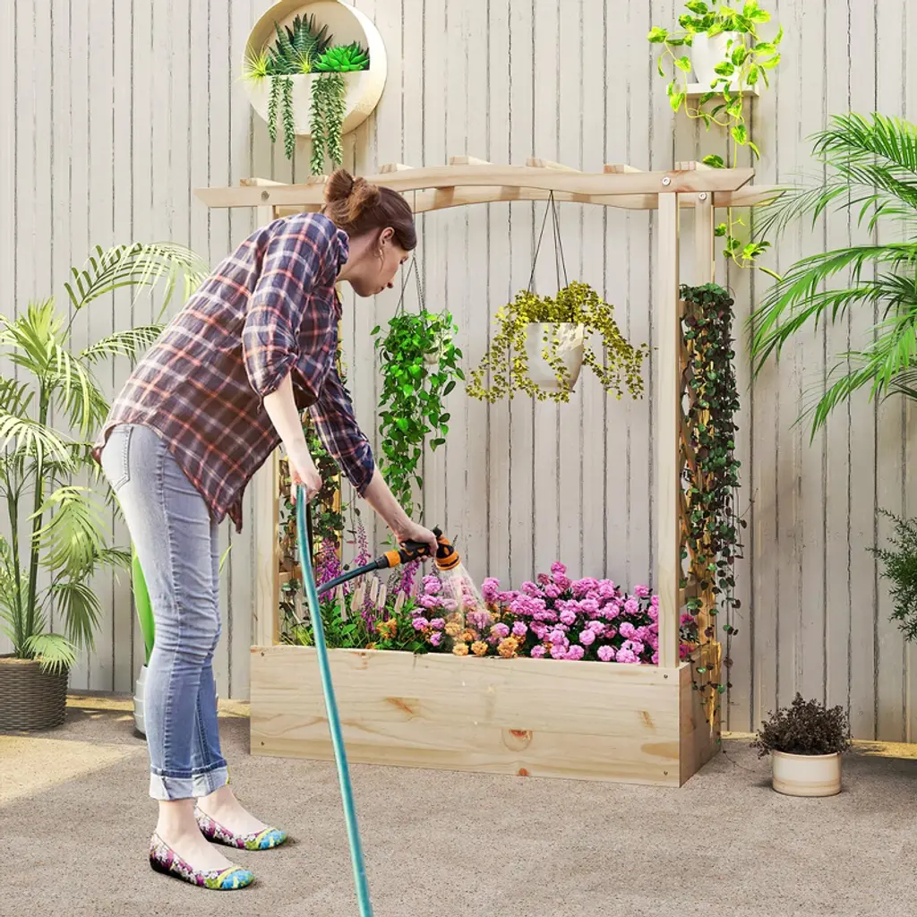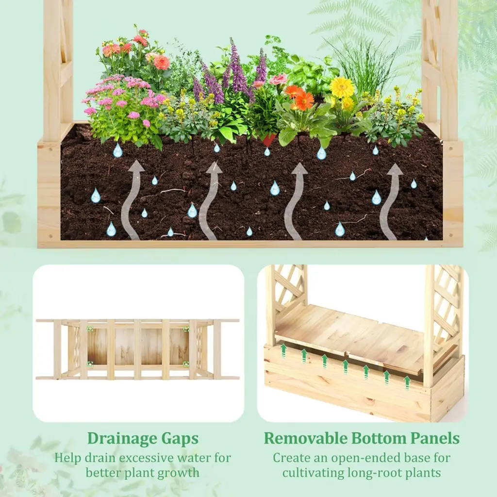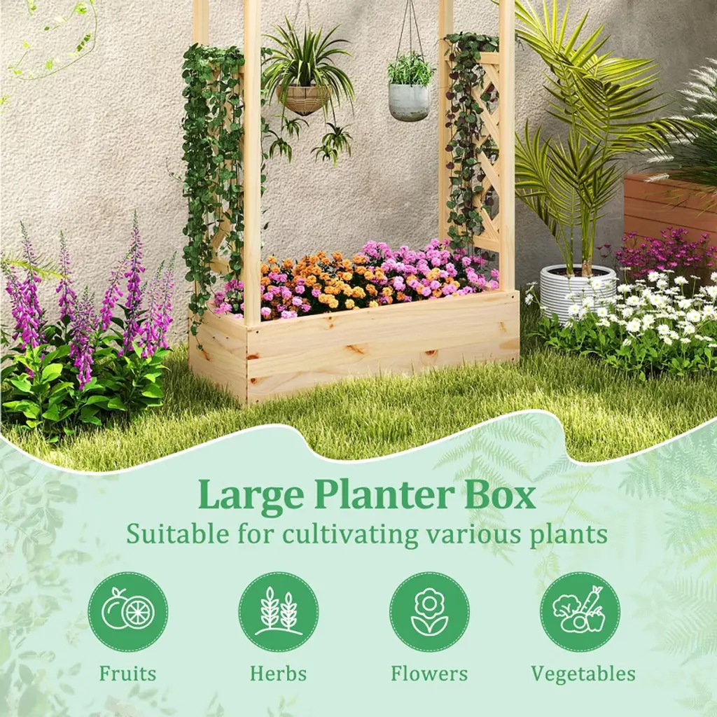 Crafted with solid pine wood, ensure great sturdiness, not easy to deform or crack Stylish: easily painted or stained, match your existing decoration The combination of the planter box, trellis, and hanging roof, stylish and elegantFeaturesEmbrace the Beauty of Nature and Unleash Your Creativity with This Versatile and Functional Gardening Solution! Our wooden raised garden bed measures 44" x 14" x 45"/110 x 35 x 113 cm (L x W x H) and comes with a large planter box measuring 33" x 14" x 8"/84 x 35 x 20.5 cm (L x W x H). Plus, it includes 2 side trellis that allow climbing plants to grow vertically, and a hanging roof with extended design for hanging flower baskets and decorations. Made of 100% natural solid wood, this garden bed not only ensures longevity and robust support but also provides a charming rustic look.Features:Crafted with solid pine wood, ensure great sturdiness, not easy to deform or crack Stylish: easily painted or stained, match your existing decoration The combination of the planter box, trellis, and hanging roof, stylish and elegantSpecifications:Color: Natural Material: Pine Wood Product Dimensions: 44" x 14" x 45" (W x D x H) Exterior Size of the Planter Box: 33" x 14" x 8"(L x W x H) Interior Size of the Planter Box: 31" x 11.5" x 7" (L x W x H) Weight Capacity of the Planter Box: 44 lbs Net Weight: 31 lbs Package Includes: 2 x Wooden Raised Garden Bed 1 x User's Manual