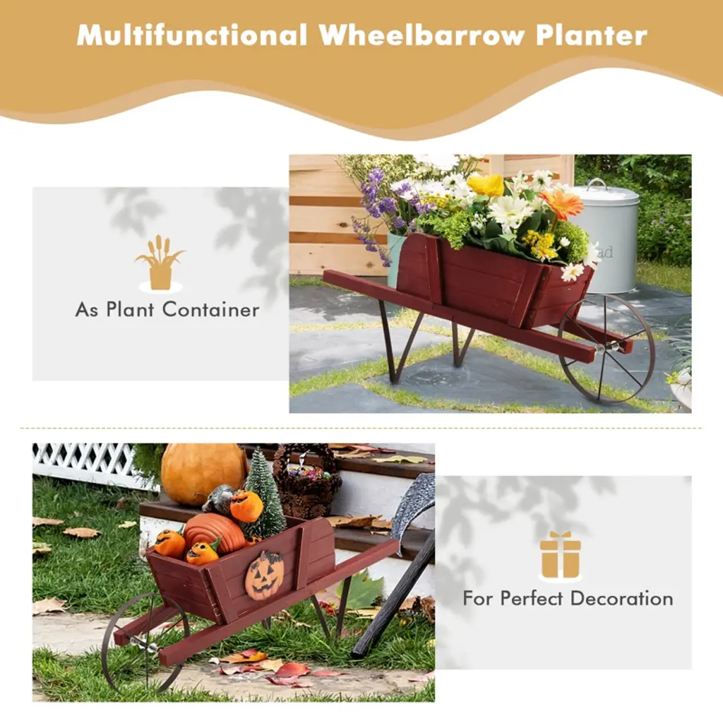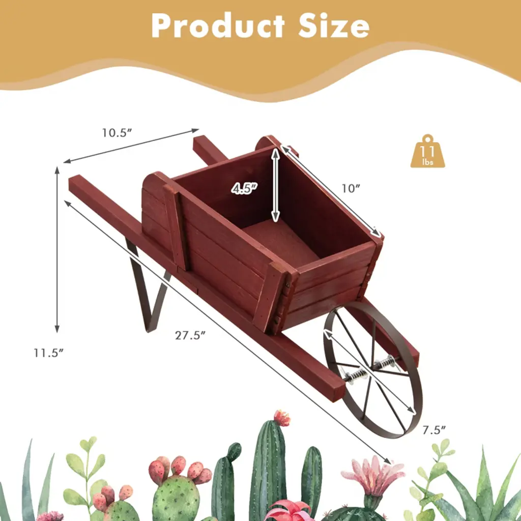 Showcase your favorite plants with our natural and rustic wagon! This versatile wagon planter combines 2 different usages for flower planting and holiday display and decoration. The wagon cart can be easily pushed back or pulled forward with wheels and 2 handles. Made of selected pine wood, the wooden planter box is solid and robust, ensuring a long service life. The wagon planter displays a rustic charm to blend naturally with a variety of plants and flowers, which is definitely the perfect addition to your backyard or garden!FeaturesMulti-functional wheelbarrow planter acts as a plant container or holiday display shelfMade of solid pine wood, durable for a long service lifeWheel has iron reinforcement for long-lasting useStable metal triangular design provides additional support2 wooden handles for easy use and movementWith the detail instruction for easy assembly in minutesCrafted edge and slats prevent hands from scratching Specifications: Color: Walnut/Red Material: Pine Wood, Metal Overall Dimensions: 27.5" x 10.5" x 11.5" (W x D x H) Diameter of the Wheel: 7.5" Weight Capacity: 11 lbs Net Weight: 2.5 lbs Package Included: 1 x Wooden Wagon Planter 9 x Magnetic Accessory 1 x User's Manual