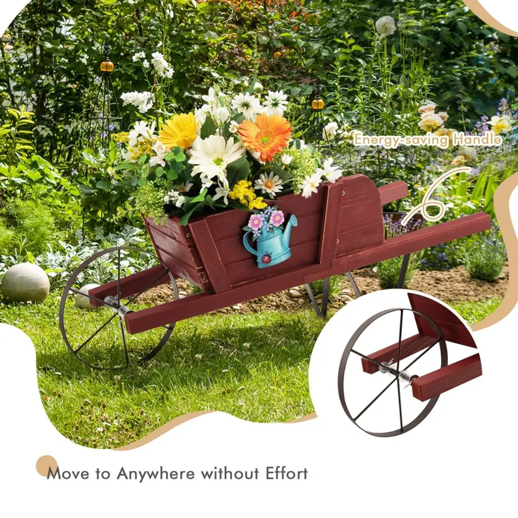 Tangkula Flower Pot Wheelbarrow Planter Solid Pine Wood Wagon Planter W/ Triangular Metal Support 2 Energy-saving Handles Movable Whee Red