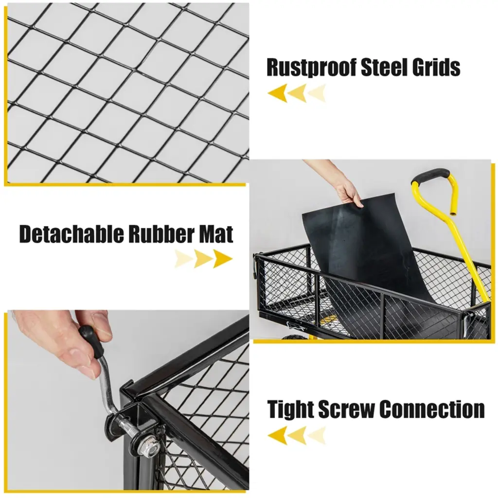Our utility garden cart is designed to simplify your outdoor tasks with outstanding features tailored to your gardening and utility needs. This robust garden cart boasts a spacious storage area, optimized for heavy-duty usage with a considerable load capacity. Crafted with rustproof steel grids and equipped with a detachable rubber mat, it promotes longevity and stable movement, making it suitable for carrying a diverse range of items effortlessly. Equipped with four side panels that are both foldable and detachable, this cart has 3 in 1 multiple uses design. Navigate with ease using our rotating handle. The all-terrain wheels are ready to conquer diverse landscapes. Transform your outdoor tasks with a reliable, adaptive, and effortless solution!Features3 in 1 Multifunctional Design to contain items of different sizes4 side panels can be effortlessly put down or detachedSturdy enough to hold up to a large load capacityWear-resistant, non-slip tires ensure noise reduction Reliable tires offer exceptional traction on different road surfacesSpecifications: Color: Yellow, Black Material: Steel, Rubber Overall Dimensions: 43" x 21" x 36" / 109 x 52 x 92 cm(L x W x H) Size of Bucket: 38" x 21" x 9" / 96.5 x 52 x 22 cm(L x W x H) Net Weight: 39.5 lbs / 18 kg Maximum Load: 900 LBS / 450 KG Package Includes: 1 x Utility Garden Cart 1 x User's Manual