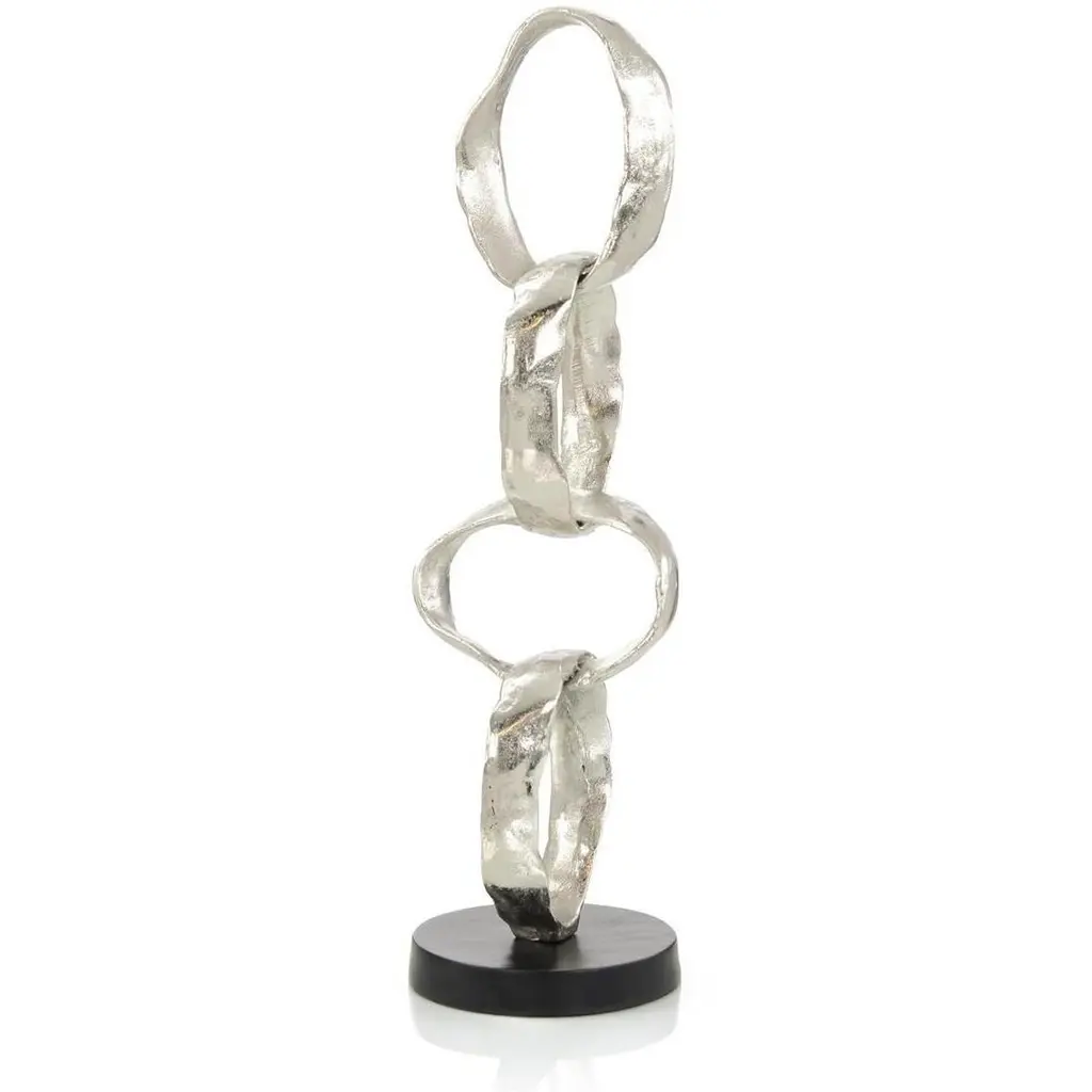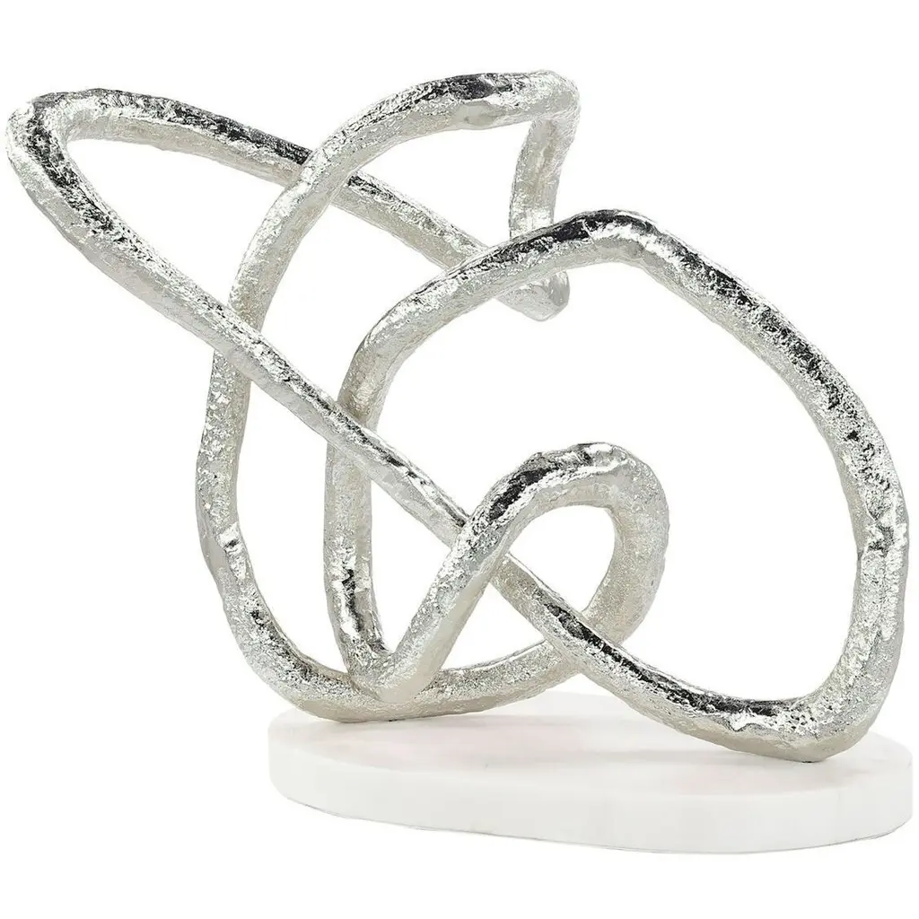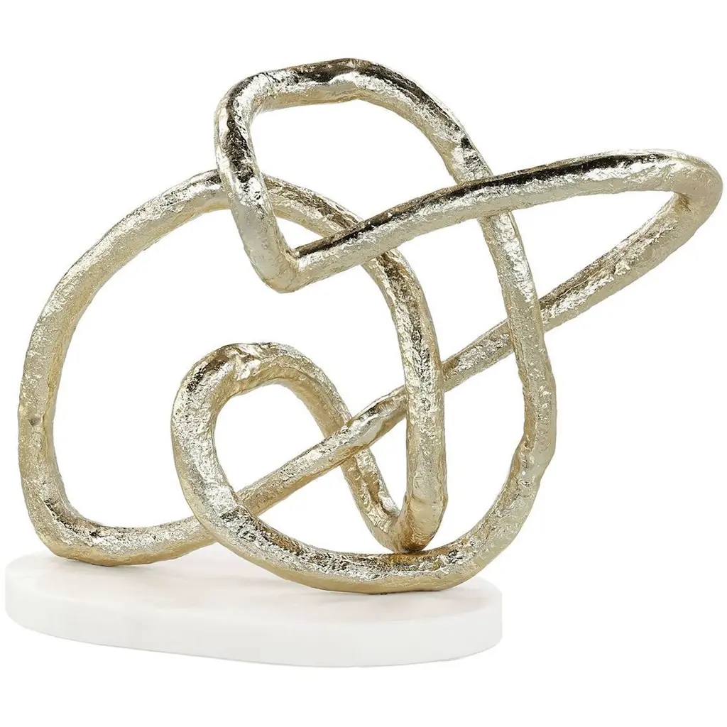 The Tangled Sculpture is a chic design statement that blends majestic flourishes with metallic tones. Crafted from aluminum adorned in a Champagne finish, the piece depicts an abstract, tangled form that sits atop a rounded base of white marble.