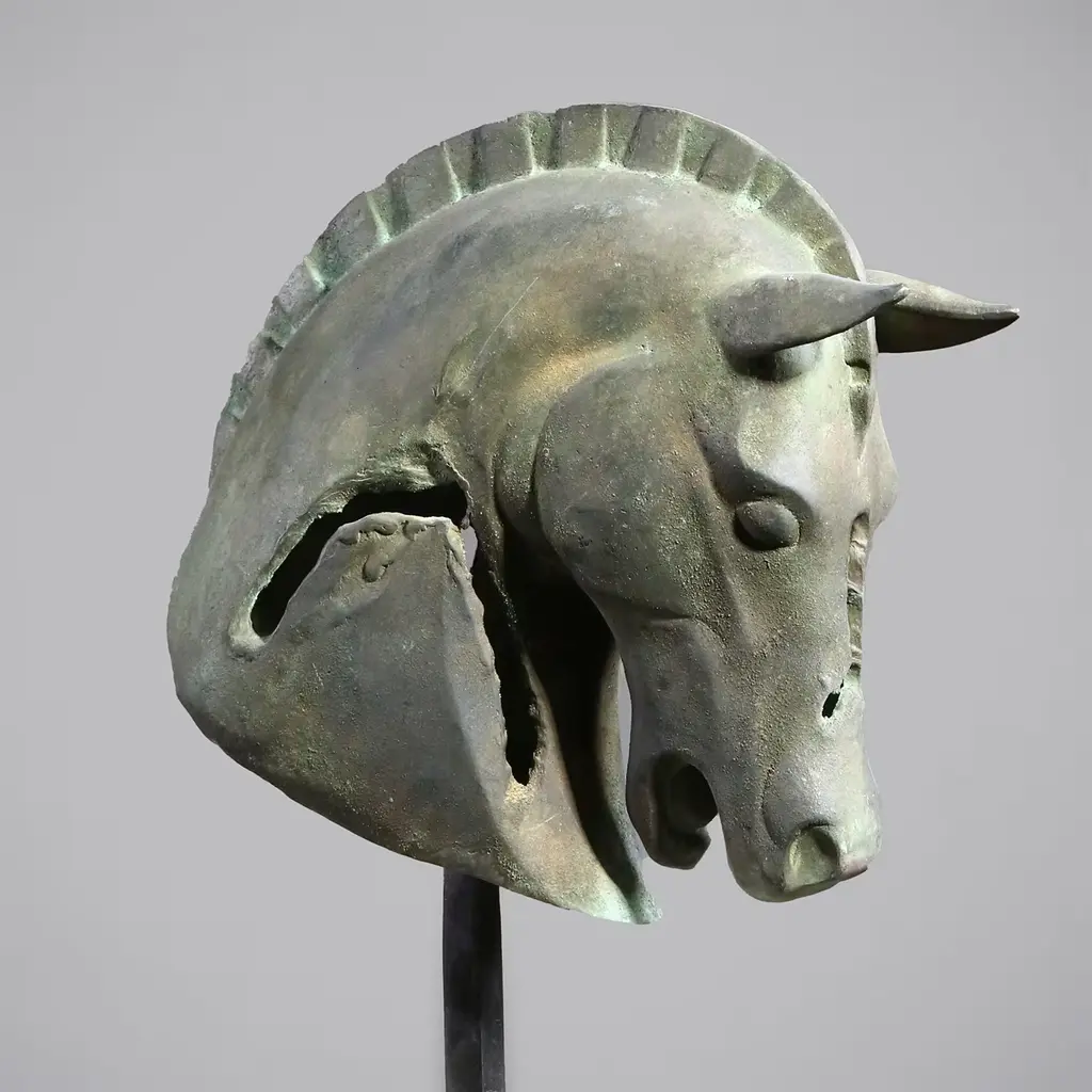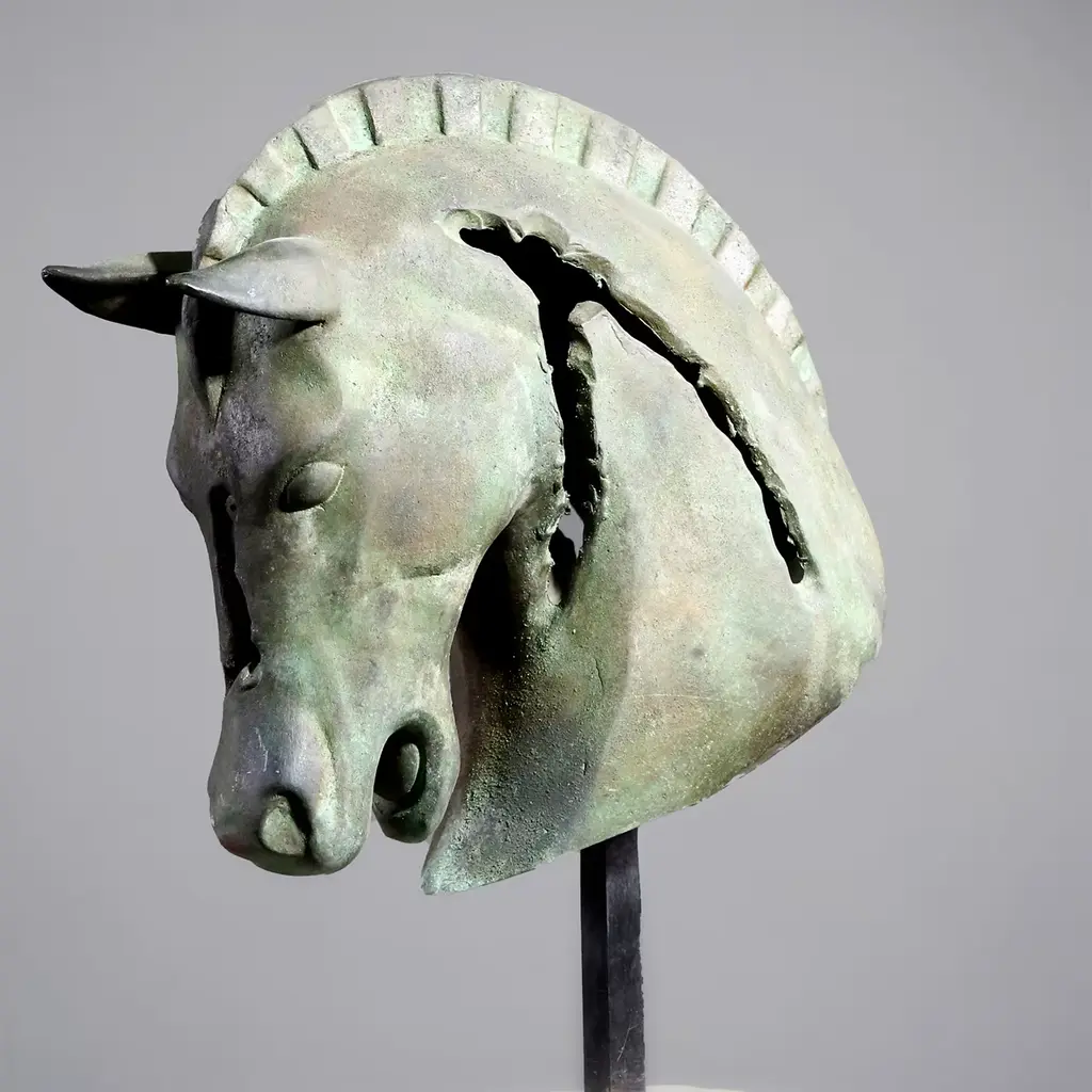 This stunning sculpture portrays the head of a horse, cast in bronze using the lost-wax technique with a green excavation finish. It sits atop a base of Roman travertine marble, adding a touch of classical elegance. A captivating piece that celebrates the beauty and grace of these majestic animals.