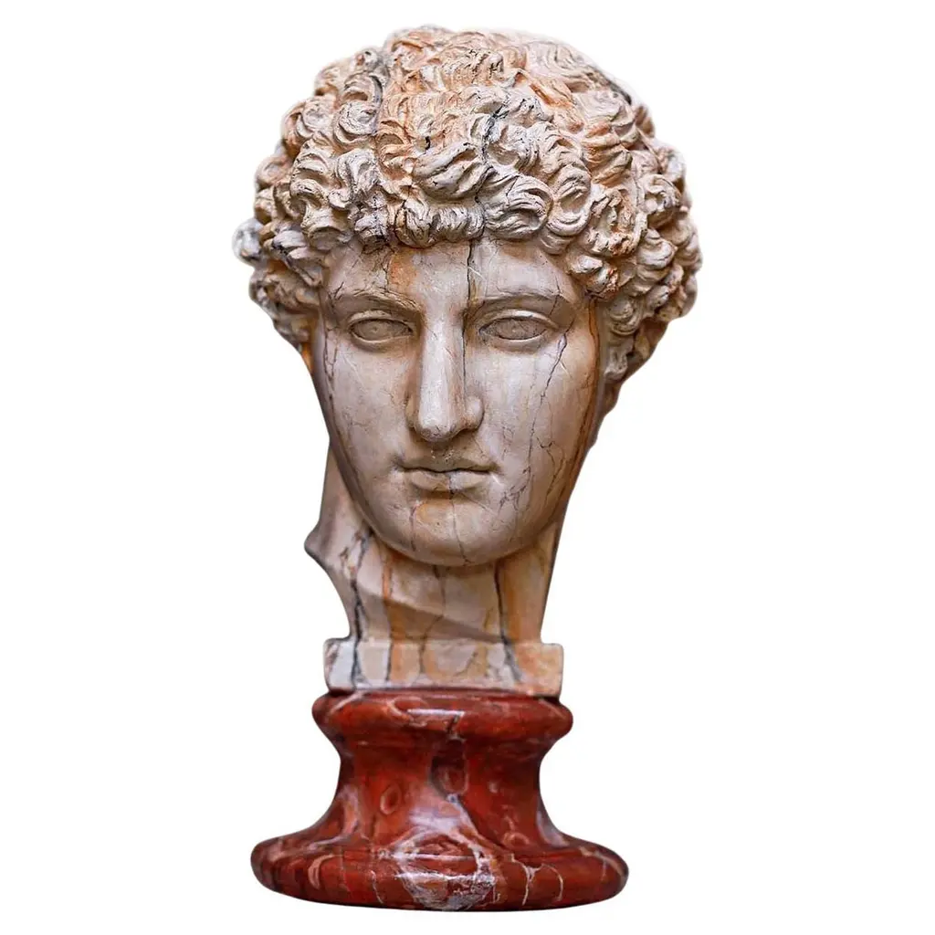 This exquisite piece represents the head of a bearded faun, clearly depicted with his goat horns and elongated ears. The faun was the Roman equivalent of the ancient Greek satyr, a mythological half human-half goat creature, manifestation of forest and animal spirits that would help or hinder humans at whim. The use of bronze with the lost-wax casting technique and a green patina resting on a marble pedestal, adds a touch of classical allure to any decor.
