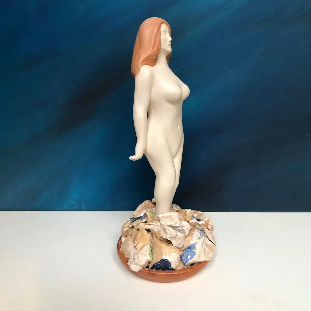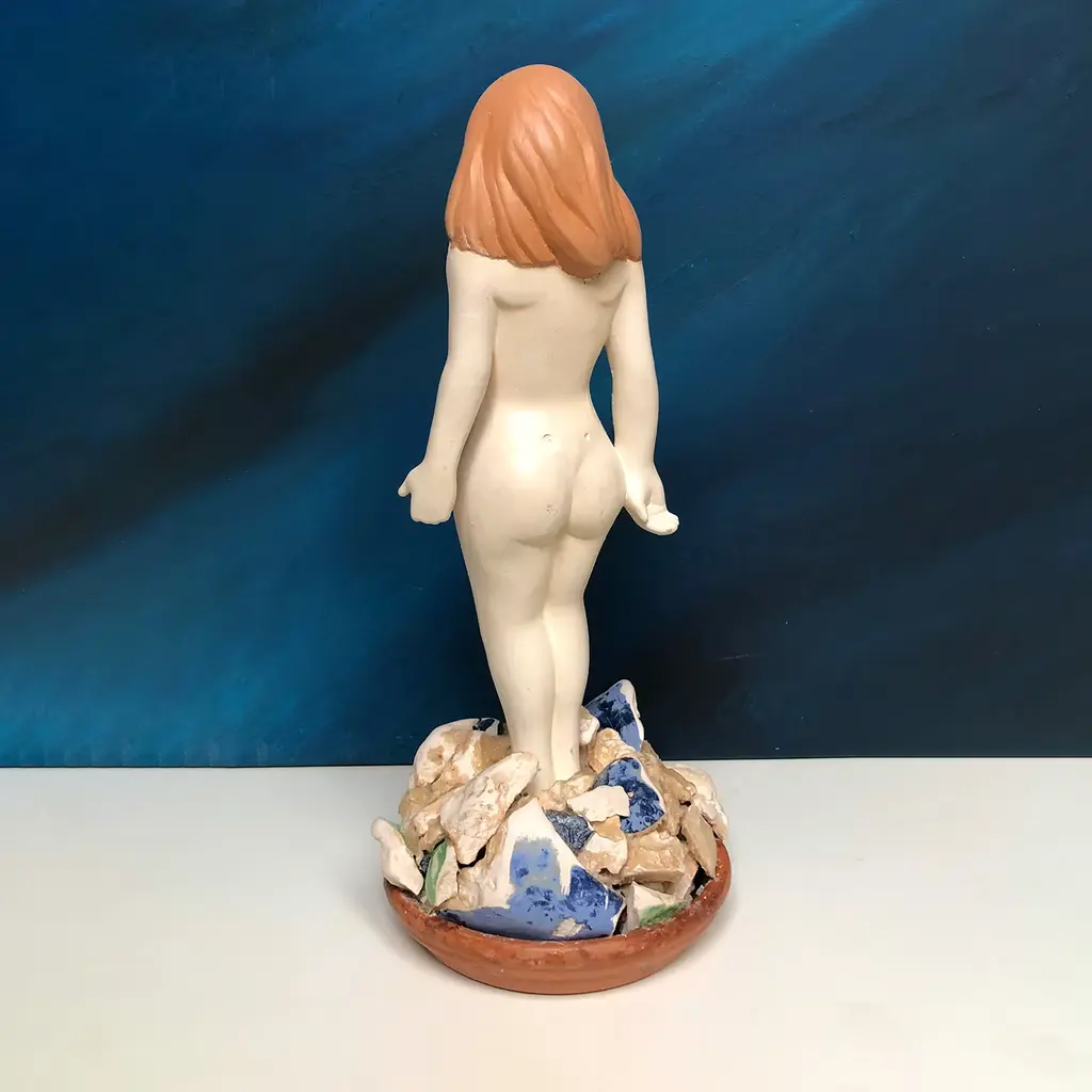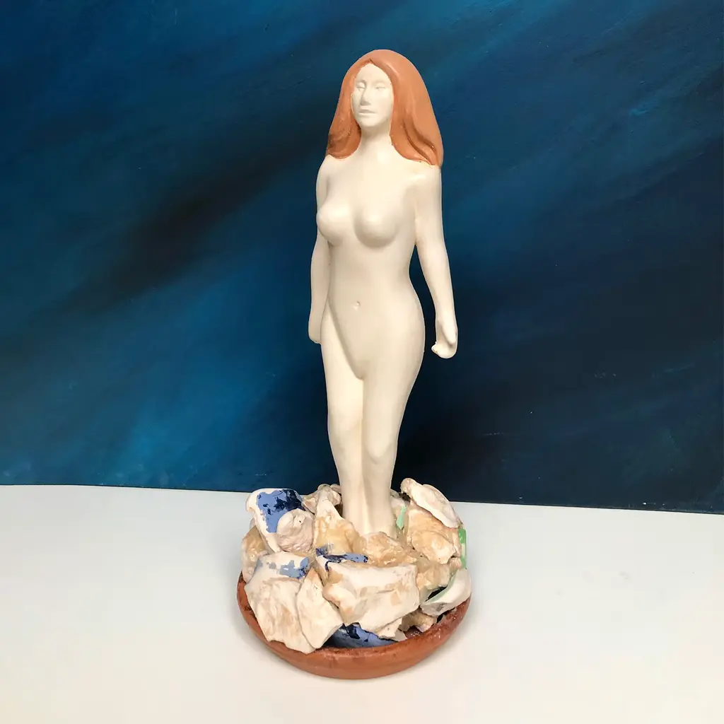 This precious ceramic sculpture depicts the birth of Aphrodite in Greek mythology, the polychrome rocks she stands are entirely handmade as also her naked body, hinting at a relative concept of beauty. Crafted from green clay and white earthenware turning red and ivory respectively after the firing, the design flaunts an artful aesthetic where Renaissance and contemporary references coexist.