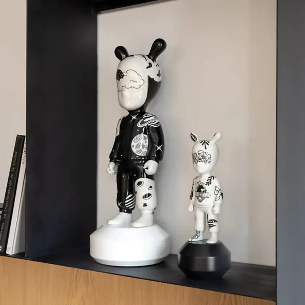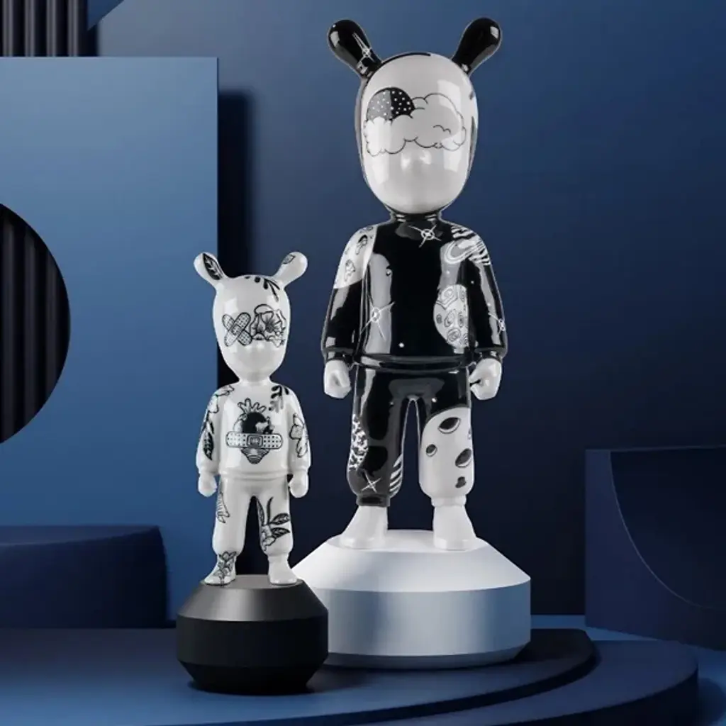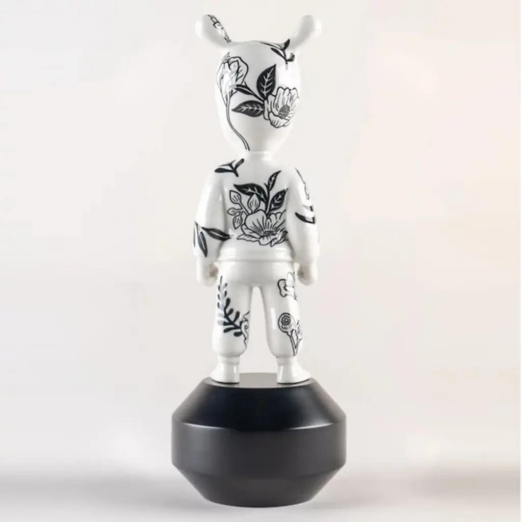 The Guest By Henn Kim Sculpture from Lladró is a striking, humanlike porcelain figure designed by Jaime Hayon and brought to life with black and white drawings across its glossy white surface by Korean illustrator Henn Kim. This whimsical, contemporary piece is part of an iconic collection inviting renowned artists to infuse their unique style. Crafted in Spain by sculptor Raul Rubio, this version of The Guest tells profound stories of emotions and personal growth across small moments, making it a captivating addition to any art collection.