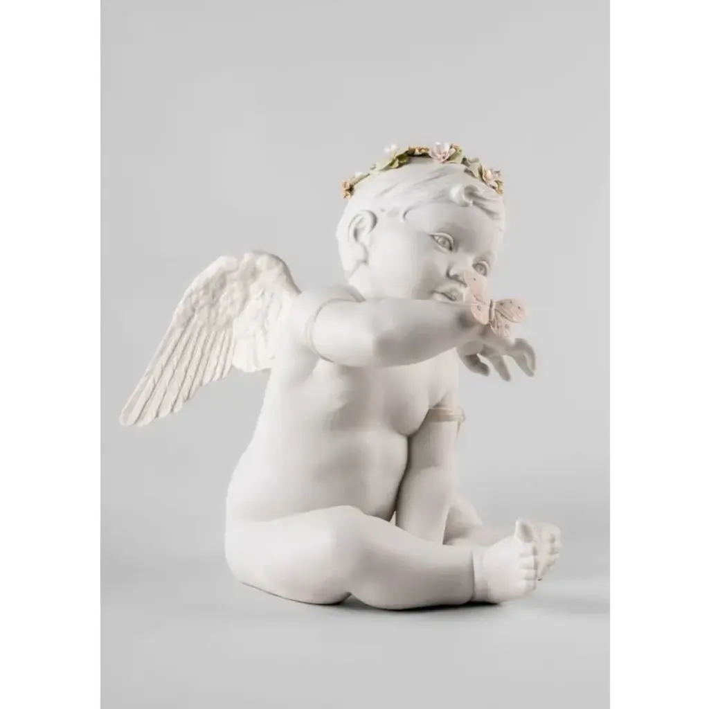 Porcelain sculpture of an angel that symbolizes nature. An iconic Spanish brand, Lladro is a world leader in the creation of porcelain art. Started by brothers Juan, Jose and Vicente Lladro in 1953, the ceramic figurines were initially inspired by the works of great European manufacturers like Meissen and Sevres. Over time, a unique style was forged, consisting of elongated lines, a revolutionary single-firing method, and soft pastel tones.
