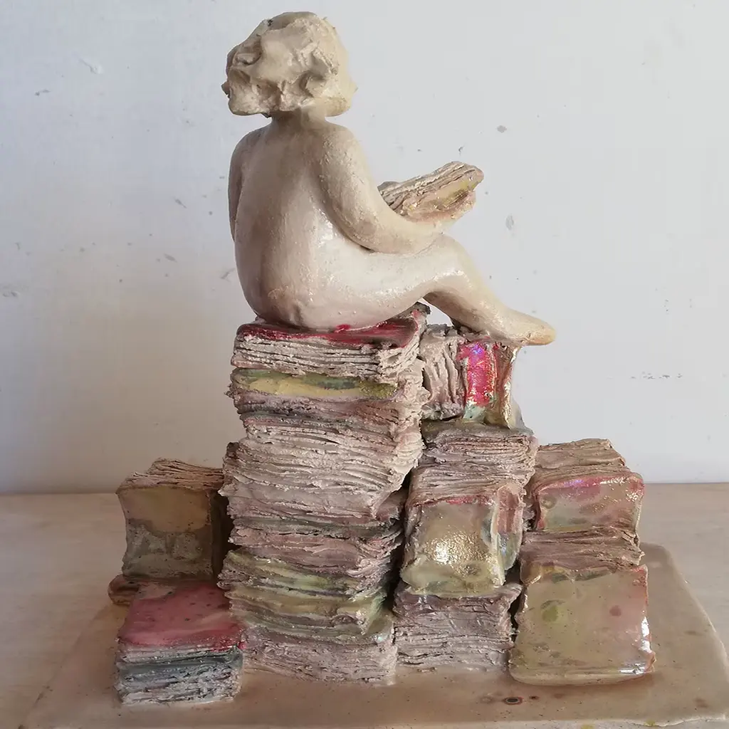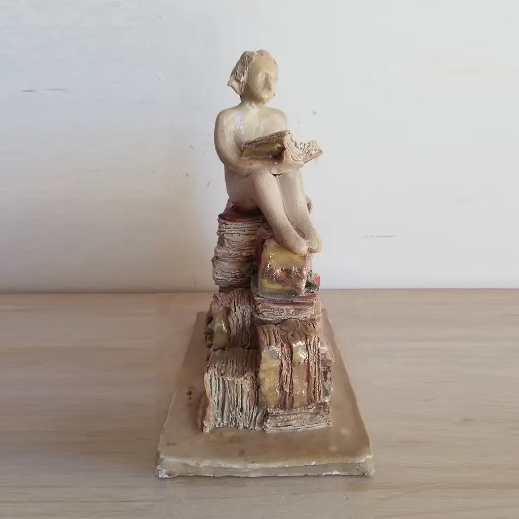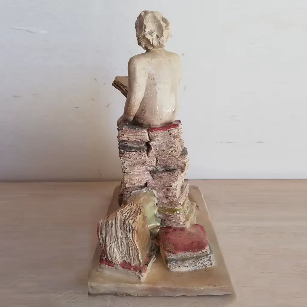 A splendid objet d'art, this sculpture will add an accent of sophistication to a living room or study filled with books. Meticulously crafted by hand of white fire clay, it depicts a young woman reading and sitting on a pile of old books. The polished finish of the piece is enhanced by colorful brush strokes.