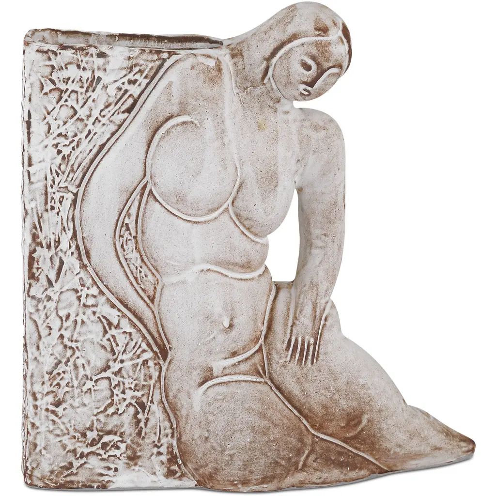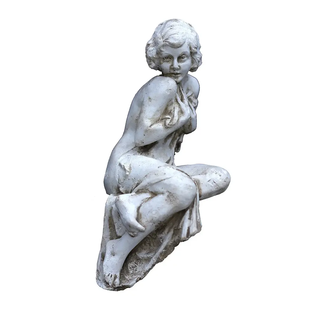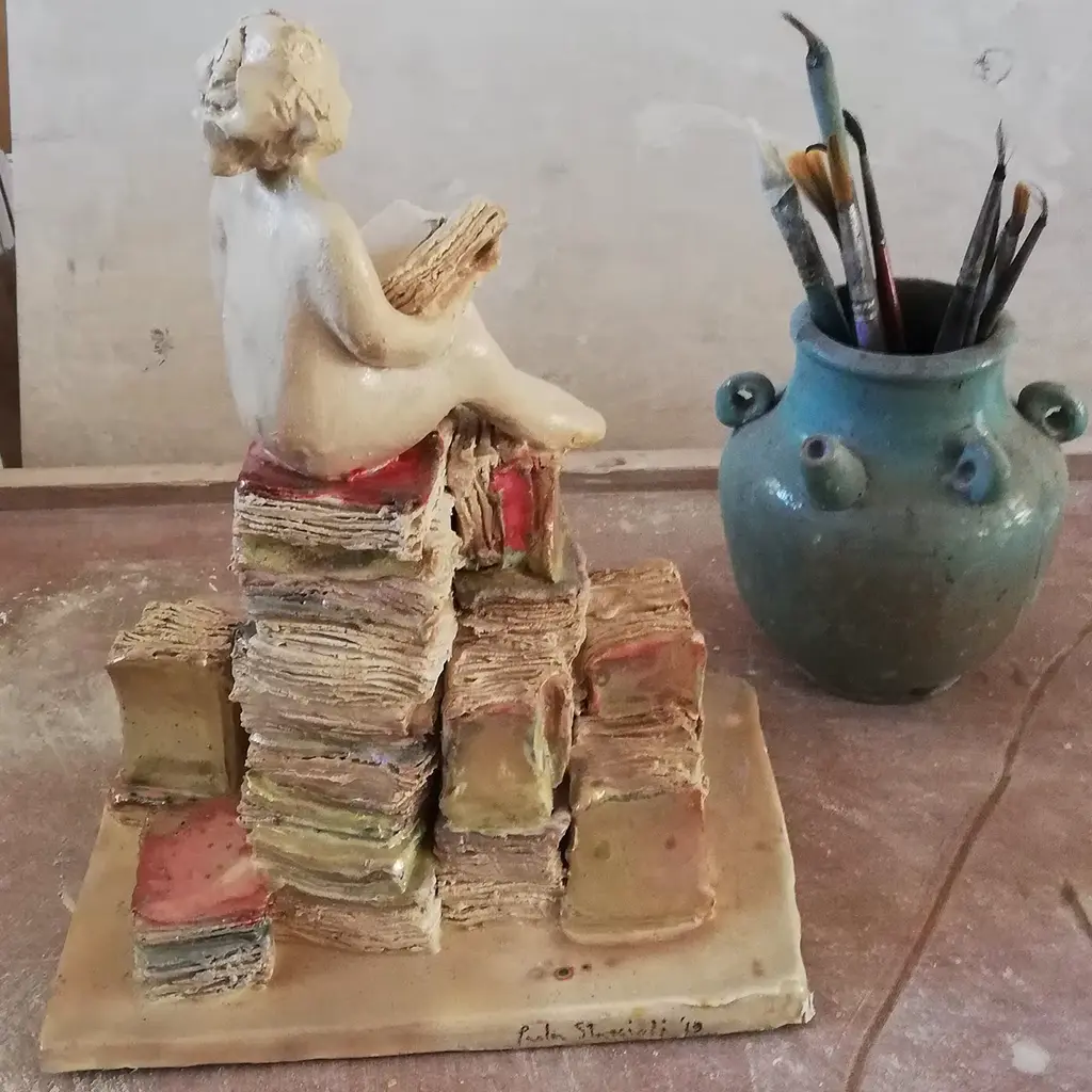 A splendid objet d'art, this sculpture will add an accent of sophistication to a living room or study filled with books. Meticulously crafted by hand of white fire clay, it depicts a young woman reading and sitting on a pile of old books. The polished finish of the piece is enhanced by colorful brush strokes.