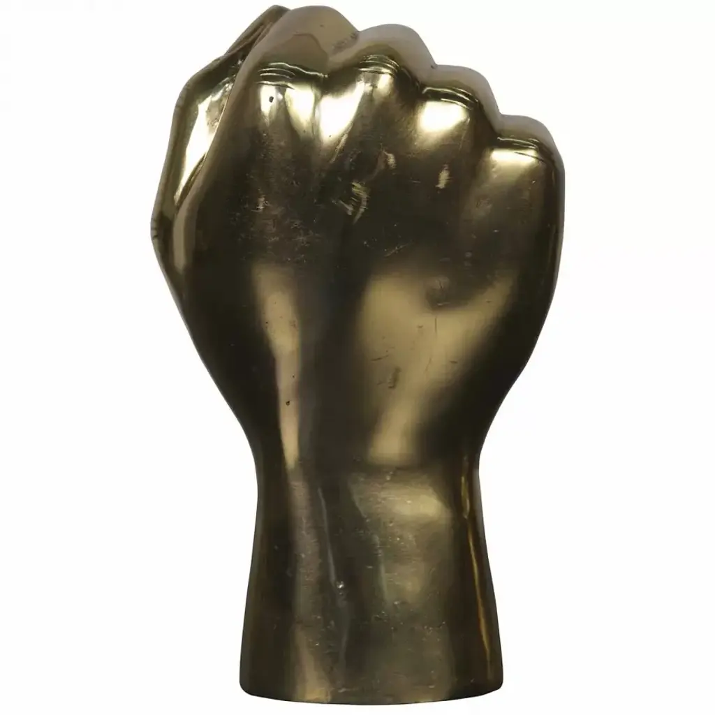 A closed fist, raised proudly, is rendered simply in an expertly weathered warm antique finish. Featuring raw, stylized lines, this intriguing brass sculpture is the perfect piece to add interest to any modern décor. Handcrafted of brass, no two will be identical.