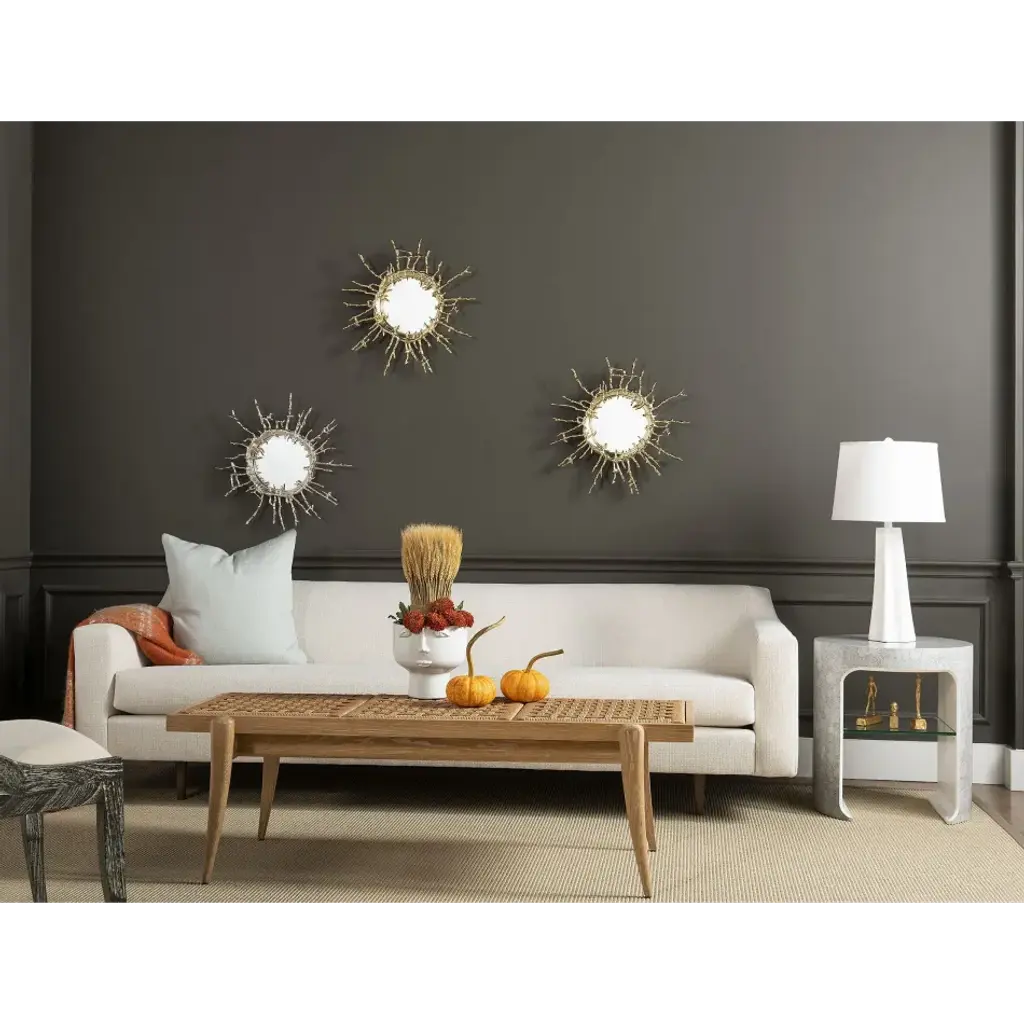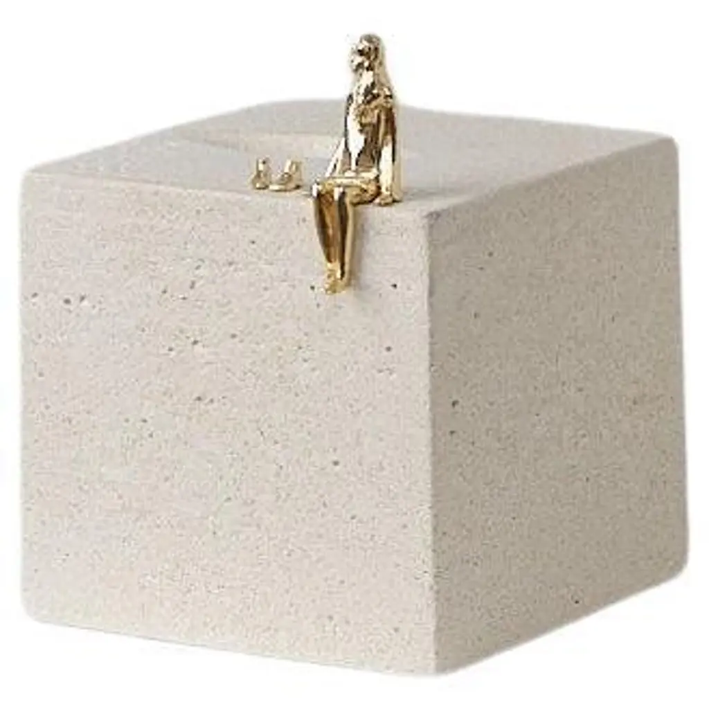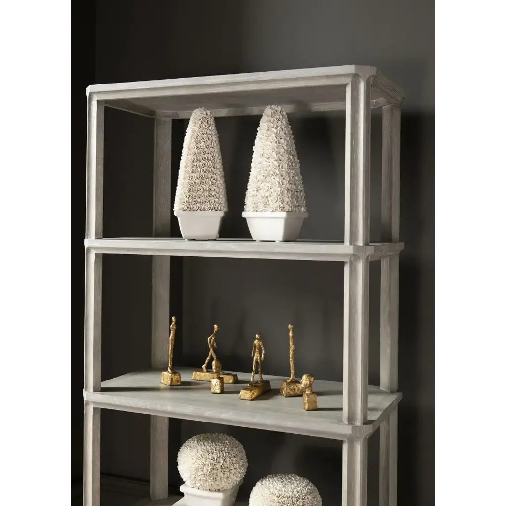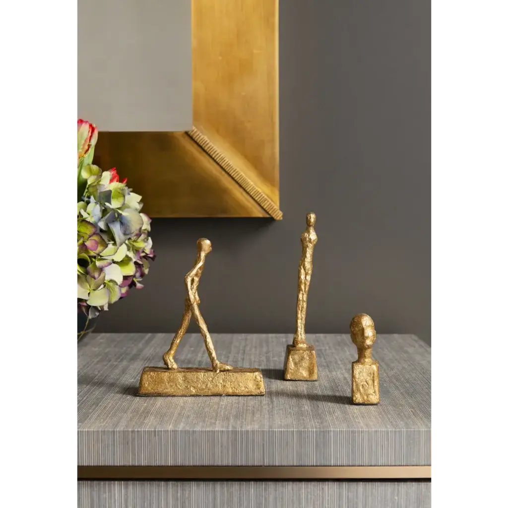The Three Forms Set is a transcendental trio, giving an otherworldly twist to the study of humanism. Raw elemental finishes and surrealist silhouettes lend each of these statues an air of mystery, as if they were artifacts discovered from an ancient civilization. The walking man and standing figure are both strikingly long and slender, representing exaggerated human bodies with ethereal presence. The third statue depicts a bust in the regal style, with artfully abstracted features. Realized in iron, the decorative pieces are topped with a layer of heavily worked gold leaf, with hand-eroded edges that make each of them appear like naturally aged treasures. Monumental as they are, the statues are petite enough to liven up a corner of a desk or console table, or fit amongst your leatherbound titles in a bookcase.