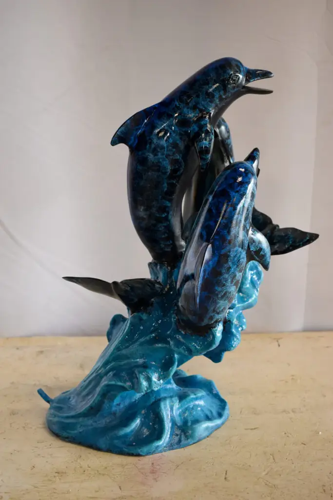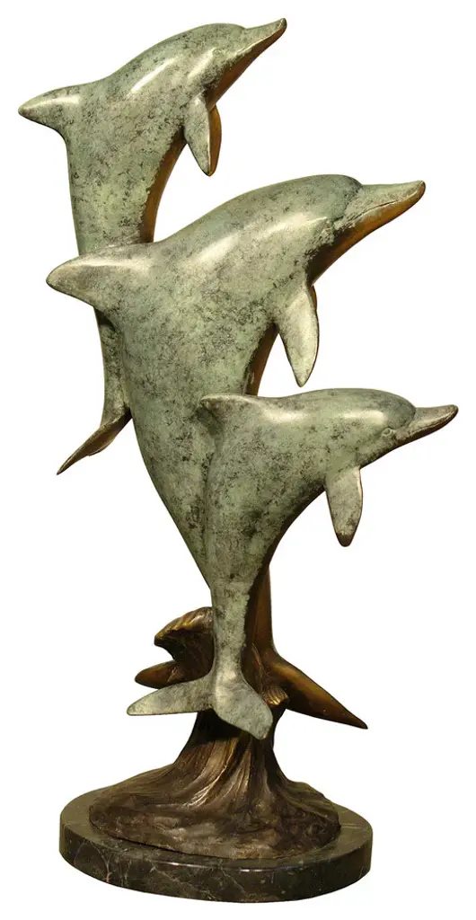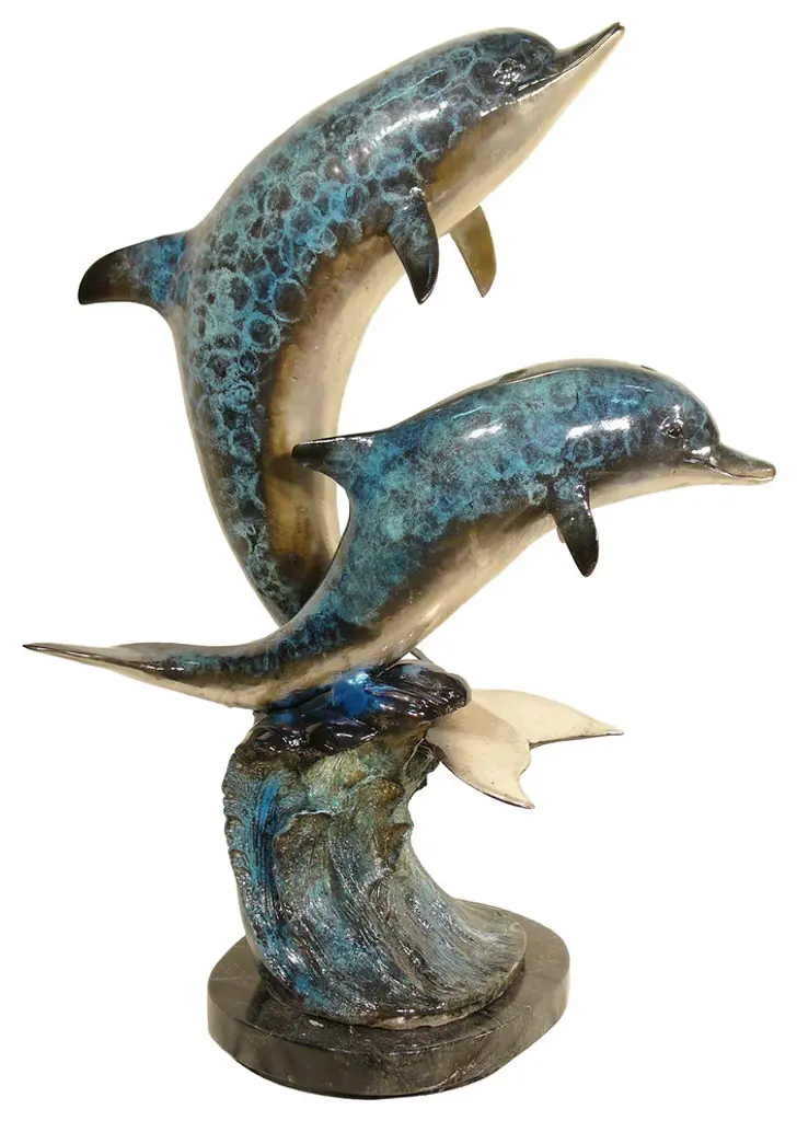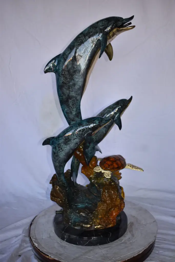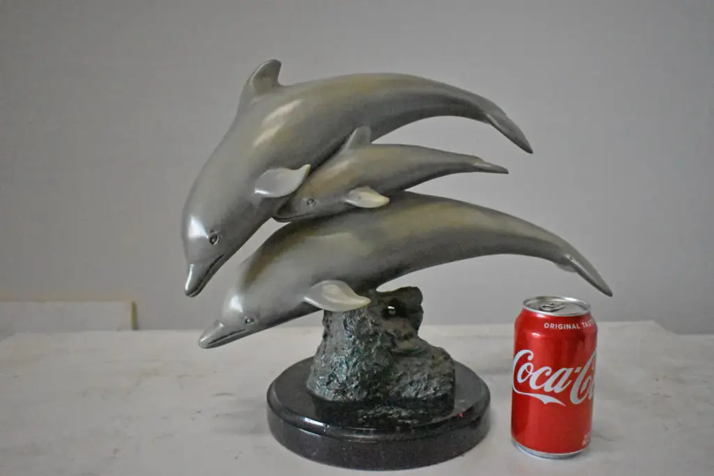 Surprise your house guests with this tabletop Bronze Statue of three Dolphins jumping out of the water providing a show to its audience. No timeless sea lover and the mysteries of the sea can resist this incredibly detailed sculpture of friendly dolphins. Handcrafted in cast brass and finished with colors deeper than the ocean itself, this breathtaking expression of the world beneath the waves beautifies any space and enhances any decor. Size: 16"L x 9"W x 13"H. Weight is: 17Lb