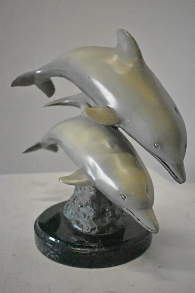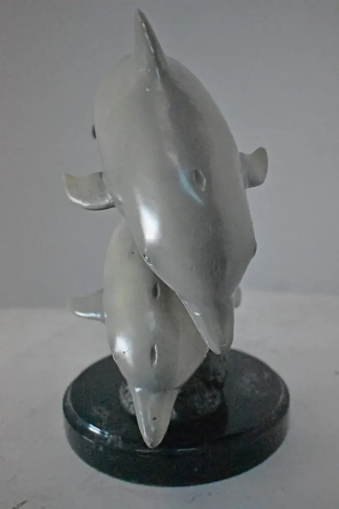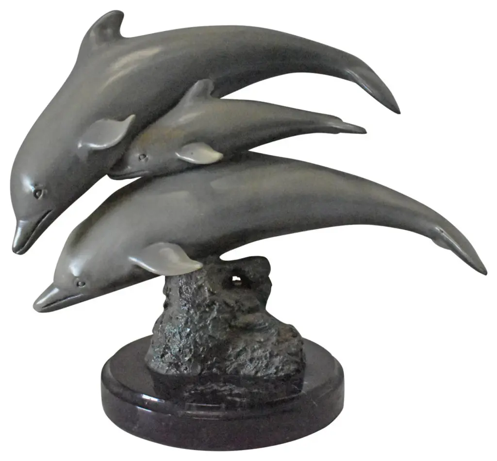 Three Grey Dolphins Swimming Bronze Statue On Marble - Size: 16"l X 9"w X 13"h
