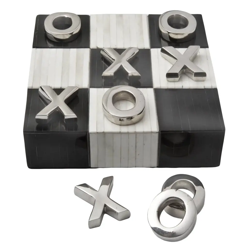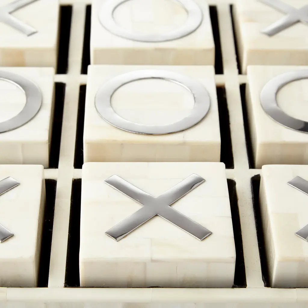 Turn a classic children`s game into a bold art piece with this tic-tac-toe bone and wood sculpture piece. Bring a dose of character and entertain friends and family in the same moment with this fully functional game of X`s and O`s.
