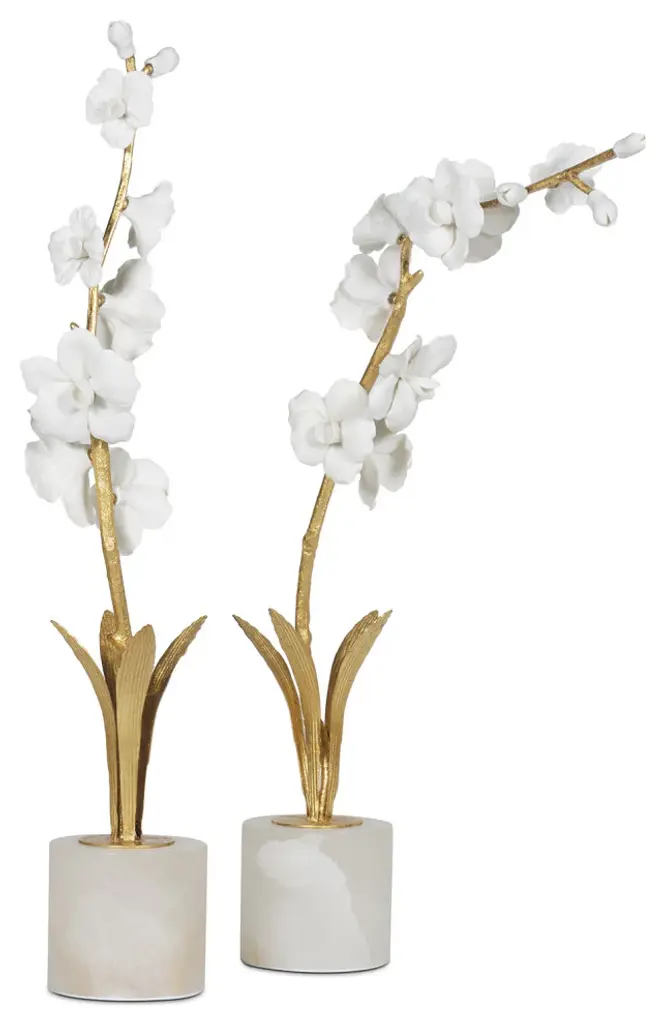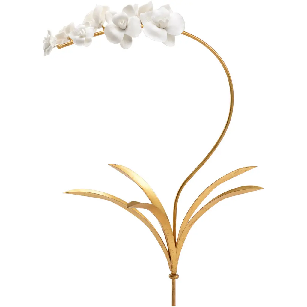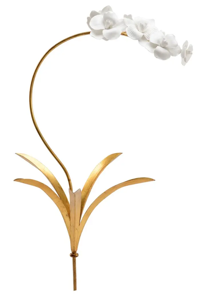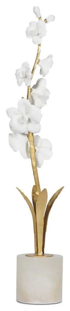 The Thylane Orchid Sculpture showcases an upright, flowing silhouette that captures the essence of an orchid in full bloom. This striking piece features porcelain blossoms and gold-leaf-stamped metal leaves, all supported by a solid alabaster base. Perfect as a standout centerpiece or a refined sculptural accent, it adds charm and elegance to any room. Regina Andrew Thylane Accessory 2; Dimensions 6W x 26H x 5D