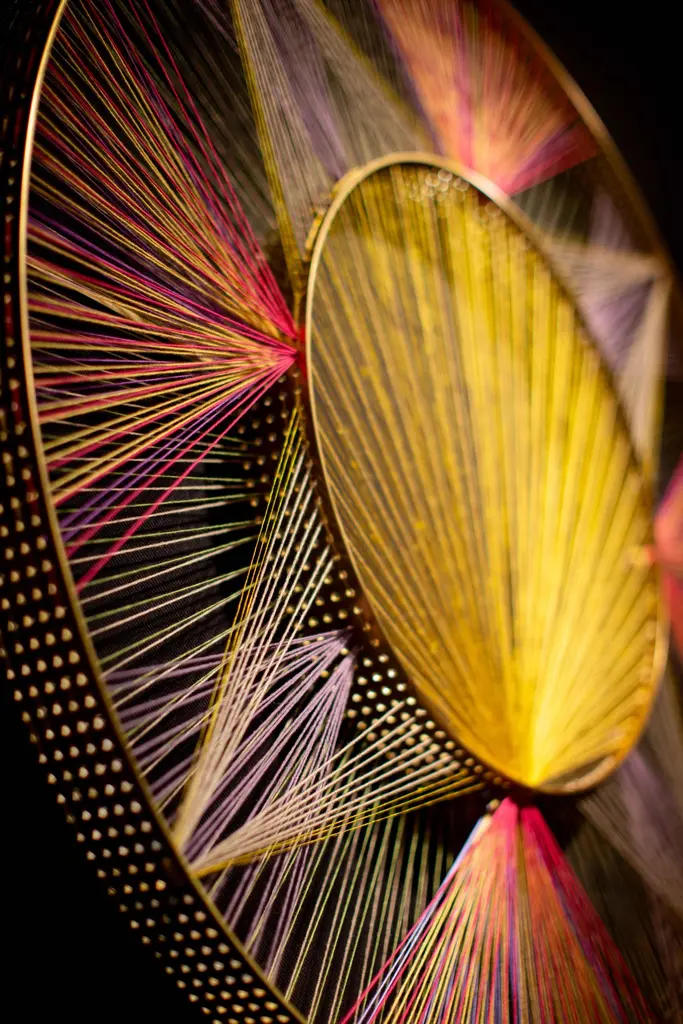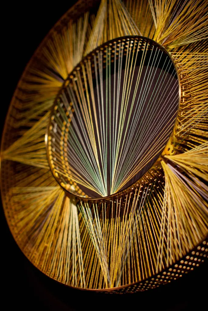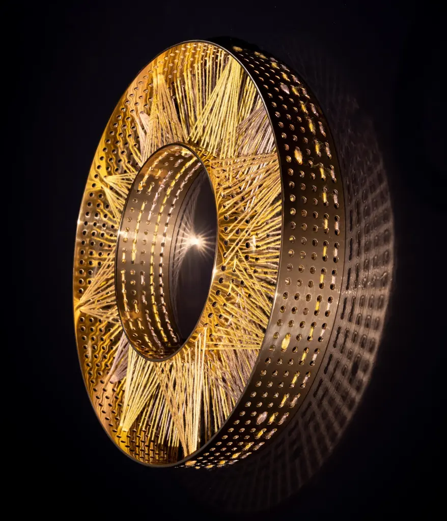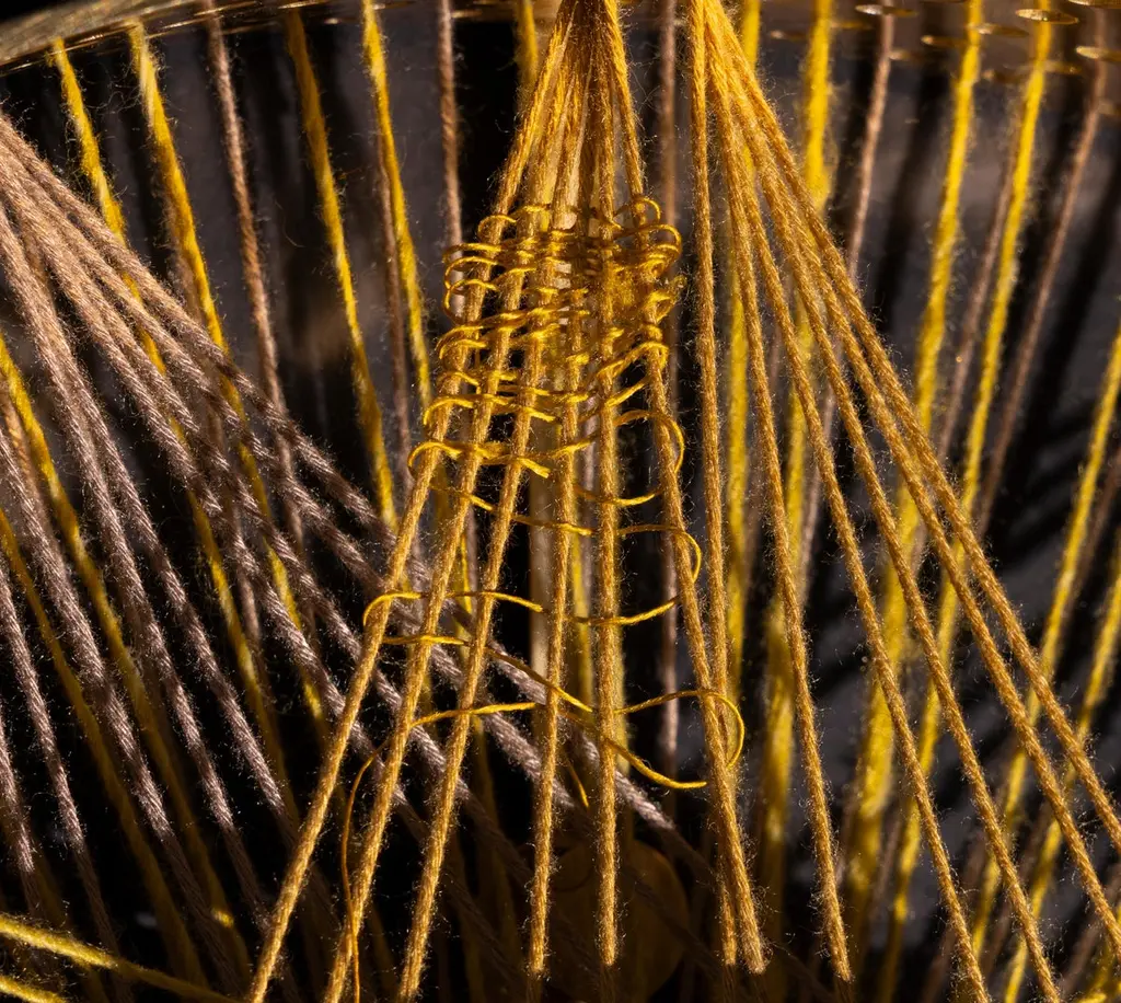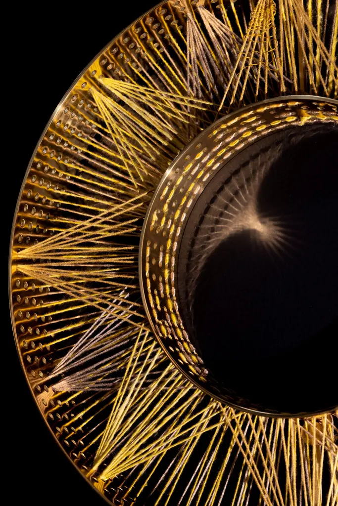 "If we knew then what we know now... all the points between a beginning and the conclusion." Polished bronze frame with hand woven patterns in threads of natural bamboo and raw silk.Models in the collection are individually hand-crafted by the skilled artisans in our studio. Custom versions tailored to a specific setting are available by commission. The Thomas Cooper Studio collection represents a multilayered, multifaceted collaboration, where Materials and techniques join forces in a search for the inner poetry of each piece: heat-formed, mouth-blown, flash-cracked glass; carved marble, alabaster, and natural stone; cast and hand-patinaed bronze; hand-polished, leaded crystal. At the same time, a study of sculptural expression creates a balance between shine and shade, density and delicacy, form and function.