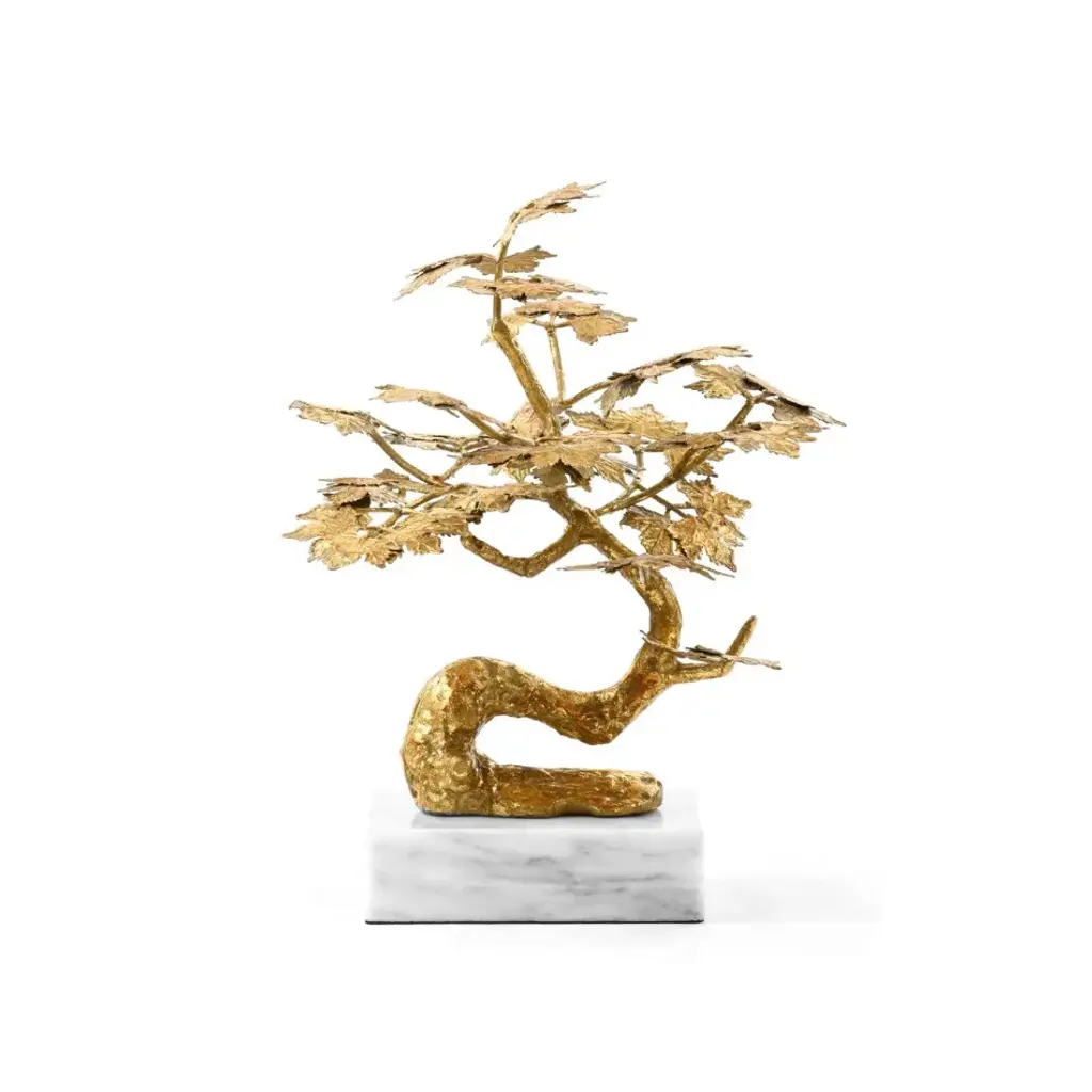 This gorgeous golden bonsai tree elevates your space and your spirit, embodying peace, harmony, and tranquility. So find your zen in the presence of the Tivoli Statue, a sumptuously detailed depiction of a mature Japanese Maple bonsai in the windblown, Fukinagashi style. In finely cast gold-leafed iron, Villa & House’s artisans have captured the whimsical, winding curves of the miniature tree trunk with an impasto finish that nods to its subject’s natural texture. Above sits a flurry of delicate leaves, each one meticulously rendered to appear strikingly realistic. The glamorous gilded finish of the statue finds elegant contrast in its white marble base, coming together to form a splendid sculptural study that brings the calm of a Japanese garden into your room.