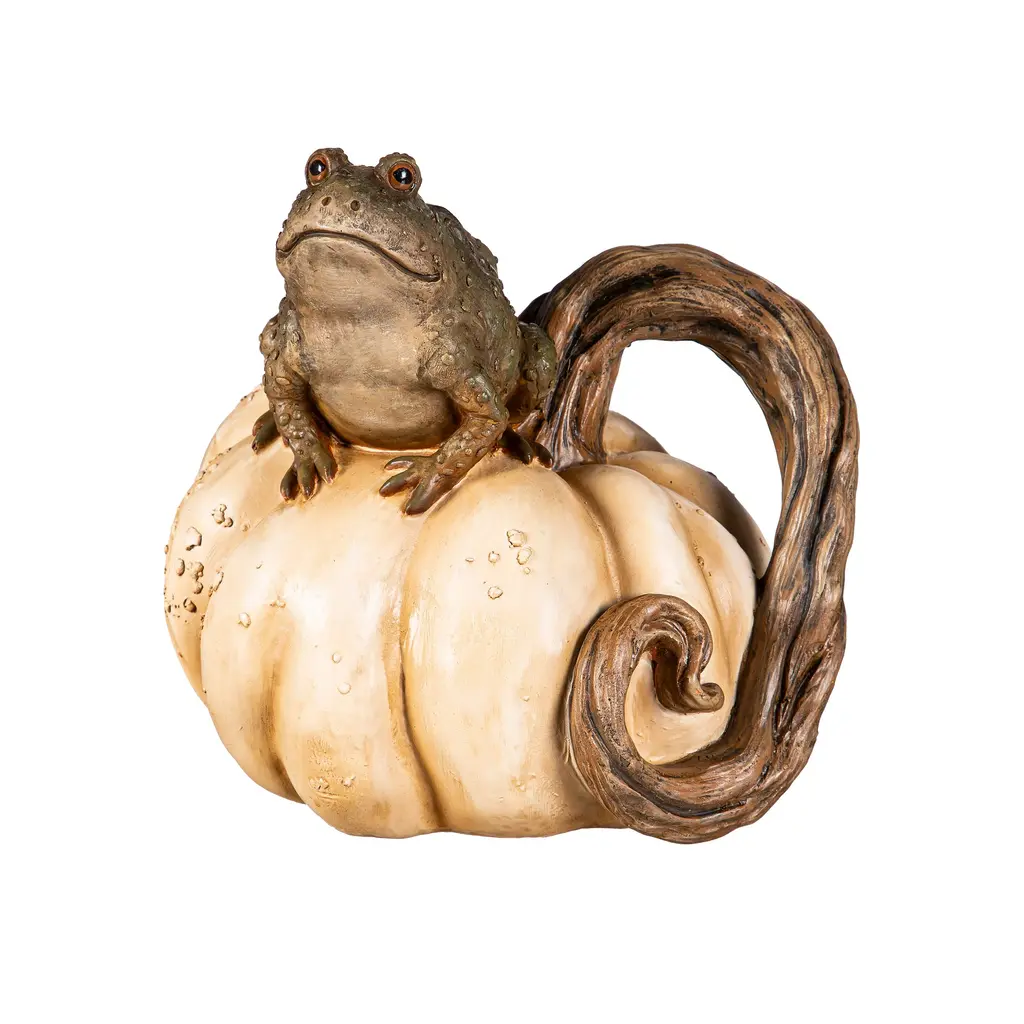 Our amusing Toad on Pumpkin Statue will transform a flower bed, porch or patio into a magical place for the fall season and beyond. This charming toad sits on a fall pumpkin with long curling vine. Standing approx. 7" tall, the figure can be nestled into a porch, patio, or garden for an earthy look or even as a part of a darker, more ominous, style. Design is painted and looks like carved stone, yet it’s crafted of weather-resistant resin, which won't crack or chip.