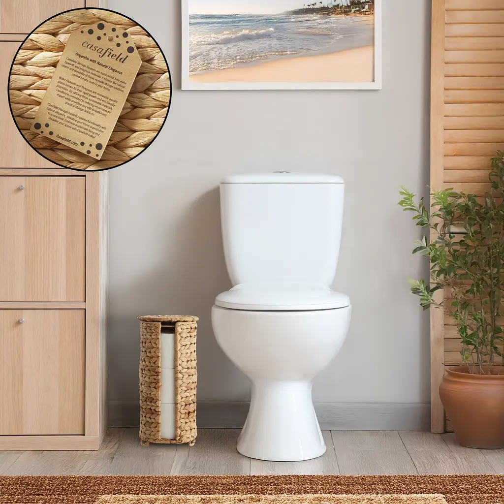 Handwoven toilet tissue holder stand: Enhance your bathroom with this elegant toilet tissue holder tower, featuring a natural, handwoven design that elevates your space. Its blend of practicality and style adds warmth and character to your decor. This tower not only keeps extra rolls organized but also serves as a charming accent, making it a must-have for any bathroom.Perfectly sized: Measuring 7-1/2" in diameter and 15" high, this holder is designed to accommodate up to 3 large toilet paper rolls, ensuring you always have a spare within reach. Its compact size helps keep your bathroom tidy and organized, while the sleek design adds a touch of style to your space, making it both a practical and aesthetically pleasing solution.Eco-friendly craftsmanship: Made from 100% water hyacinth or seagrass materials, this toilet tissue holder combines sustainability with durability, ideal for those seeking stylish organization without compromising eco-friendliness. Due to their handmade nature, slight variations in color and measurements may occur, adding to the individuality of each tower.Convenient lid design: The removable, snug-fitting lid ensures your toilet paper stays clean and dry, providing extra protection from dust and moisture. This added layer of defense makes the tissue holder a practical and hygienic choice, while also serving as a stylish addition to your bathroom decor.Versatile use: This toilet tissue holder is ideal for bathrooms, powder rooms, or guest suites. Its natural design effortlessly complements a wide range of decor styles, from farmhouse and boho to coastal and beyond. This versatile toilet paper storage organizer adds both functionality and charm to any space in your home. Elevate your bathroom's style with Casafield's stunning toilet tissue holder, handcrafted from 100% water hyacinth or seagrass materials. Measuring 7-1/2" in diameter and 15" high, it easily holds up to three large-sized toilet paper rolls, ensuring you're always well-stocked. Its charming design brings a unique flair, making it a perfect fit for farmhouse, bohemian, coastal, or any decor style. Not only does this tissue holder serve a functional purpose, but it also emphasizes sustainability with its eco-friendly materials. Water hyacinth and seagrass are known for their durability, allowing you to enjoy this beautiful piece for years to come. The convenient removable lid not only enhances the aesthetic but also keeps your toilet paper rolls protected from dust and moisture, ensuring a hygienic experience. Ideal for any setting, whether it's a bustling family bathroom or a peaceful guest suite, this holder enhances your space while keeping it organized. Combining elegance with practicality, it's a must-have accessory for elevating your bathroom decor. Embrace both style and functionality with this beautiful water hyacinth tissue holder, designed to add charm and convenience. Care Instruction: To clean, gently dust with a soft cloth or duster. To ensure you enjoy the benefits of this functional and stylish piece for years to come, please avoid exposure to water. Designed for indoor use only. Dimensions: 7-1/2" L x 7-1/2" W x 15" H Due to its handmade nature, slight variations in color and measurements may occur, adding to the individuality of each item. Casafield is an industry leader in affordable home accessories and organizational solutions perfect for any style and budget.