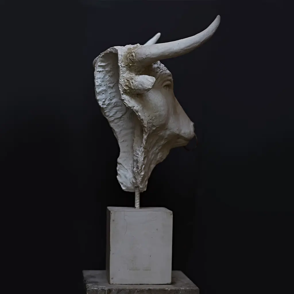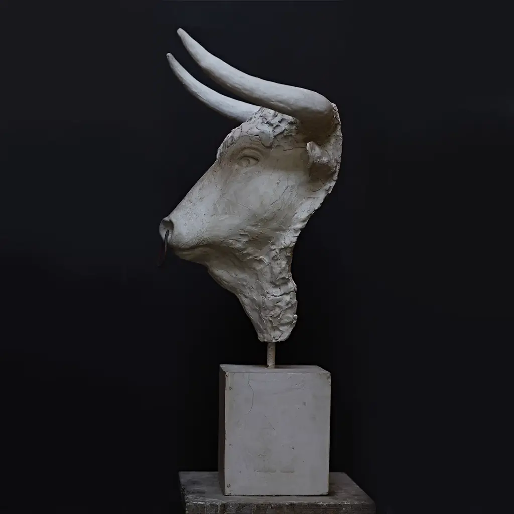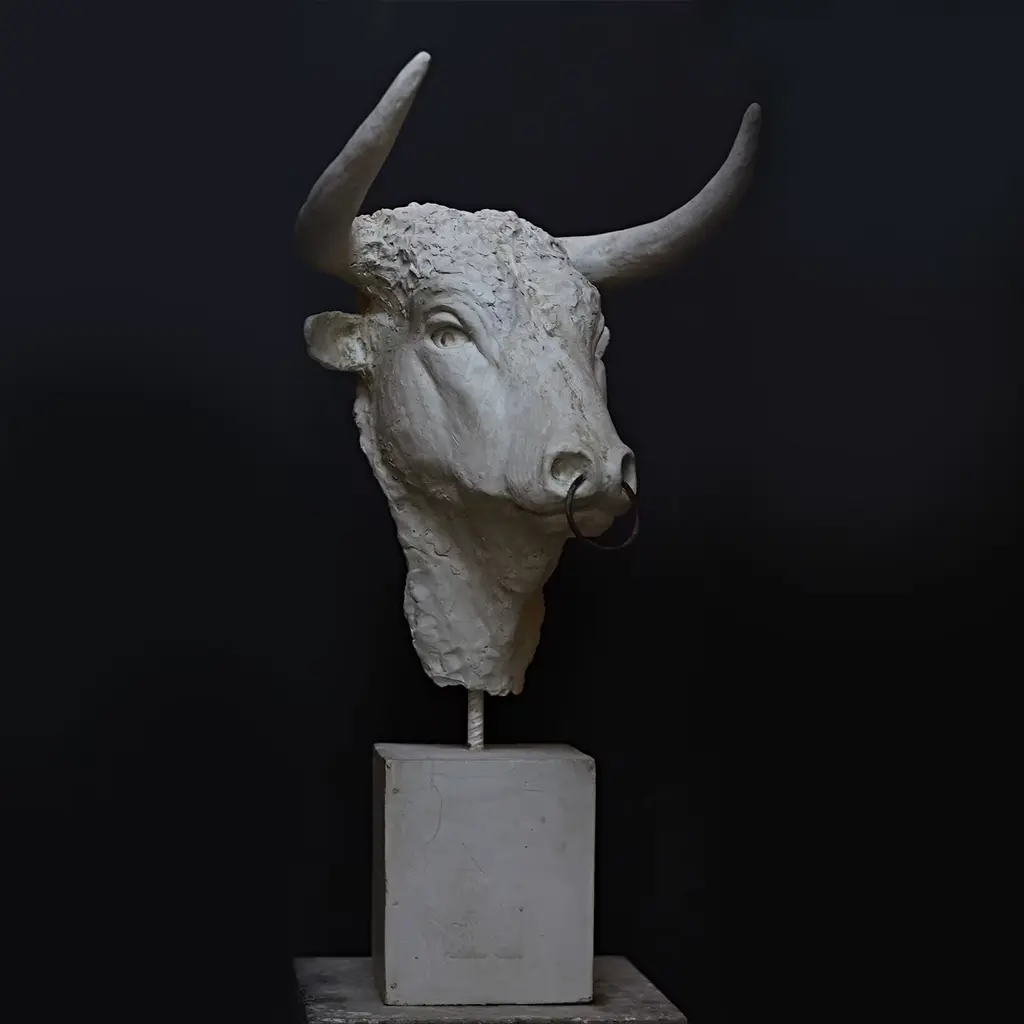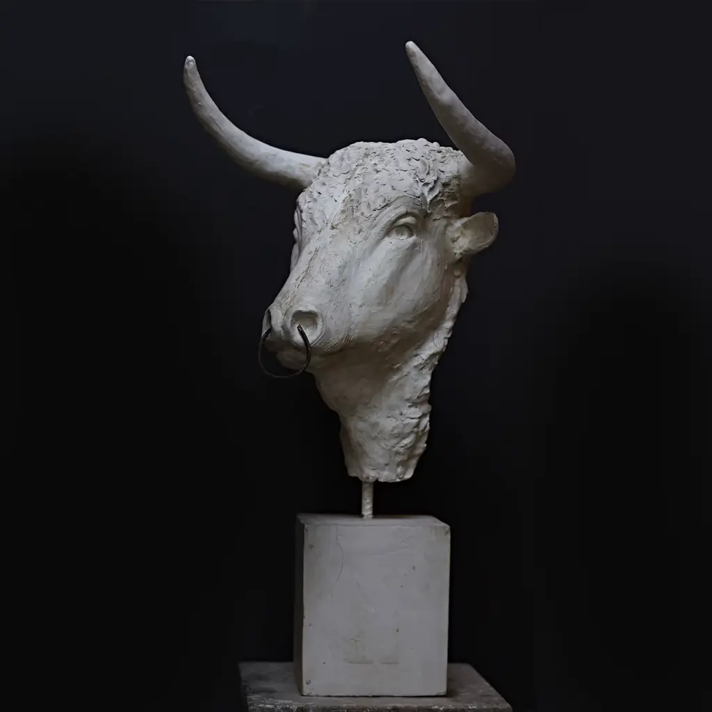 Symbol of strength and virility, the bull is a staple in ancient Roman figurative art. The majestic head of the animal, animated by a powerful look and masterfully rendered musculature, is accessorized with a pair of magnificent horns. The piece rests on a plaster cubic base made up of two parts held together with an iron rod. The iron occurs again in the ring hanging off the bull's nose - a symbol of docility that strikingly contrasts with the forceful allure of the piece. This one-of-a-kind sculpture will make a statement in any classically or traditionally furnished home or patio.