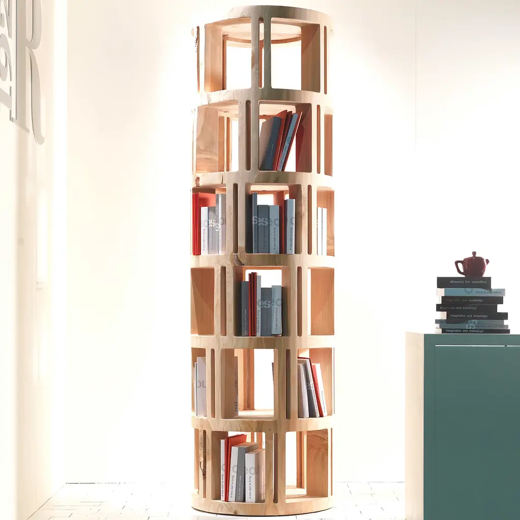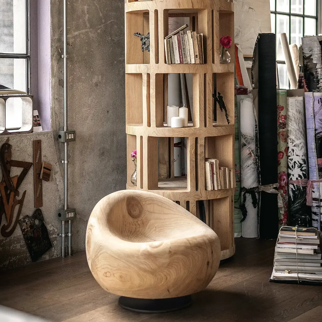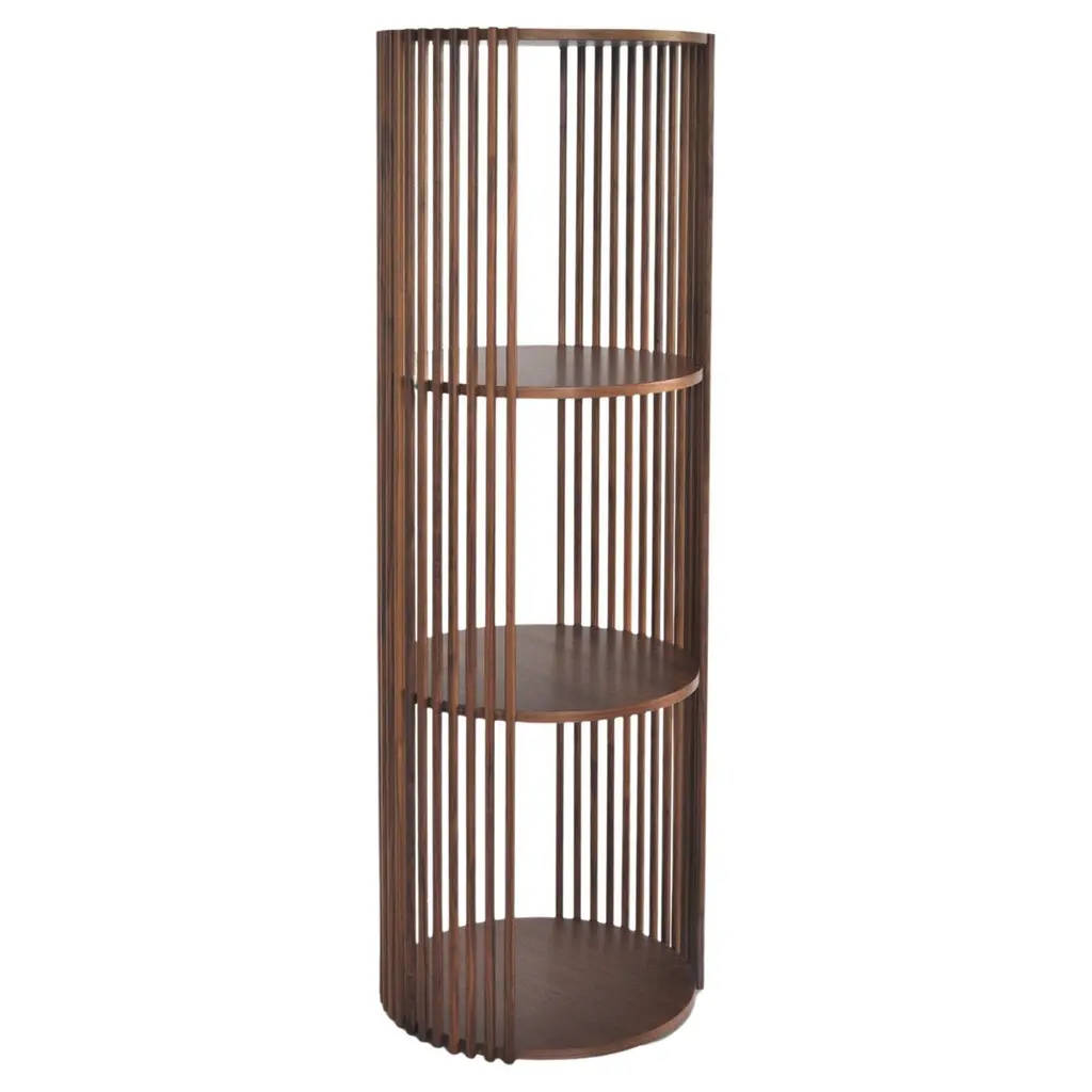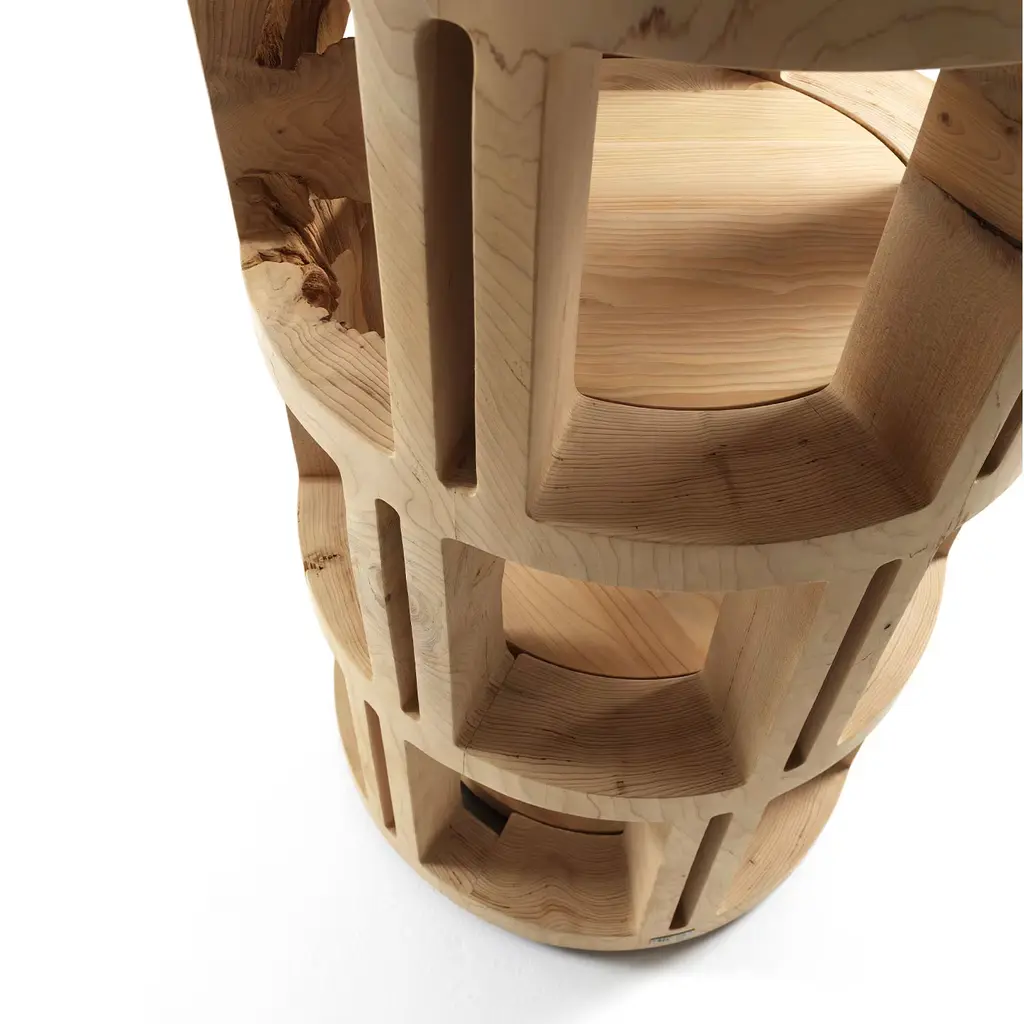 Whimsically inspired by a tower, this cylindrical bookcase makes for an artful solution where to display books, photo frames, and sculptures on a likewise sculptural body. The natural-finished cedar structure boasts an extensive openwork design that also plays a visually lightening function that adds to mere functionality. A black-stained variant is available in the Artemest catalog.