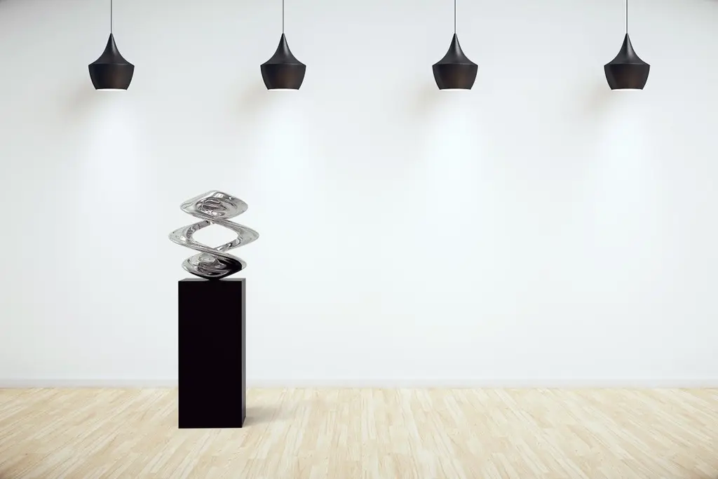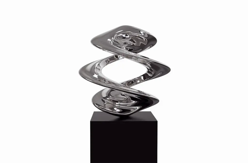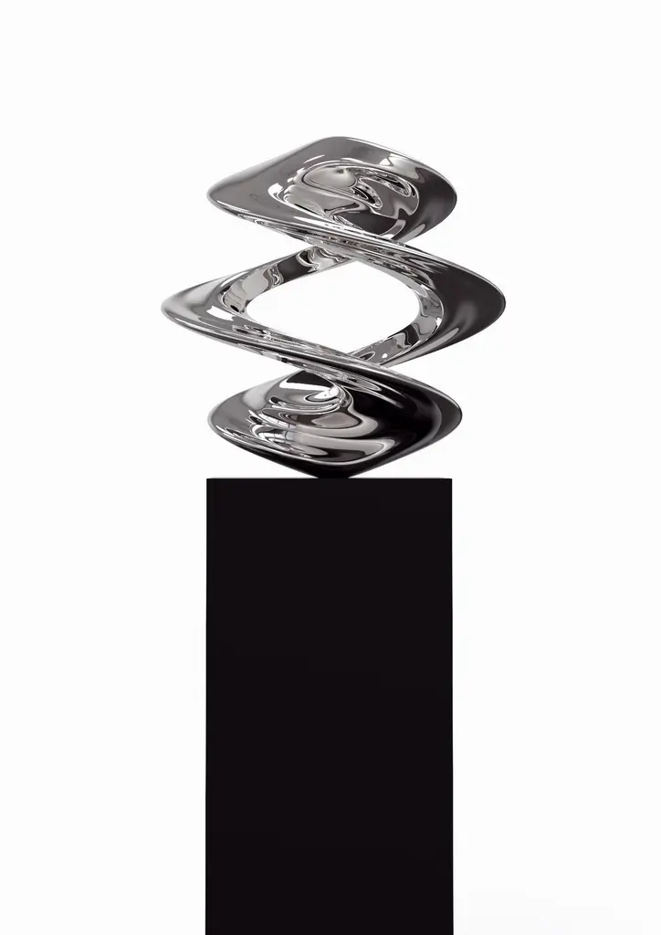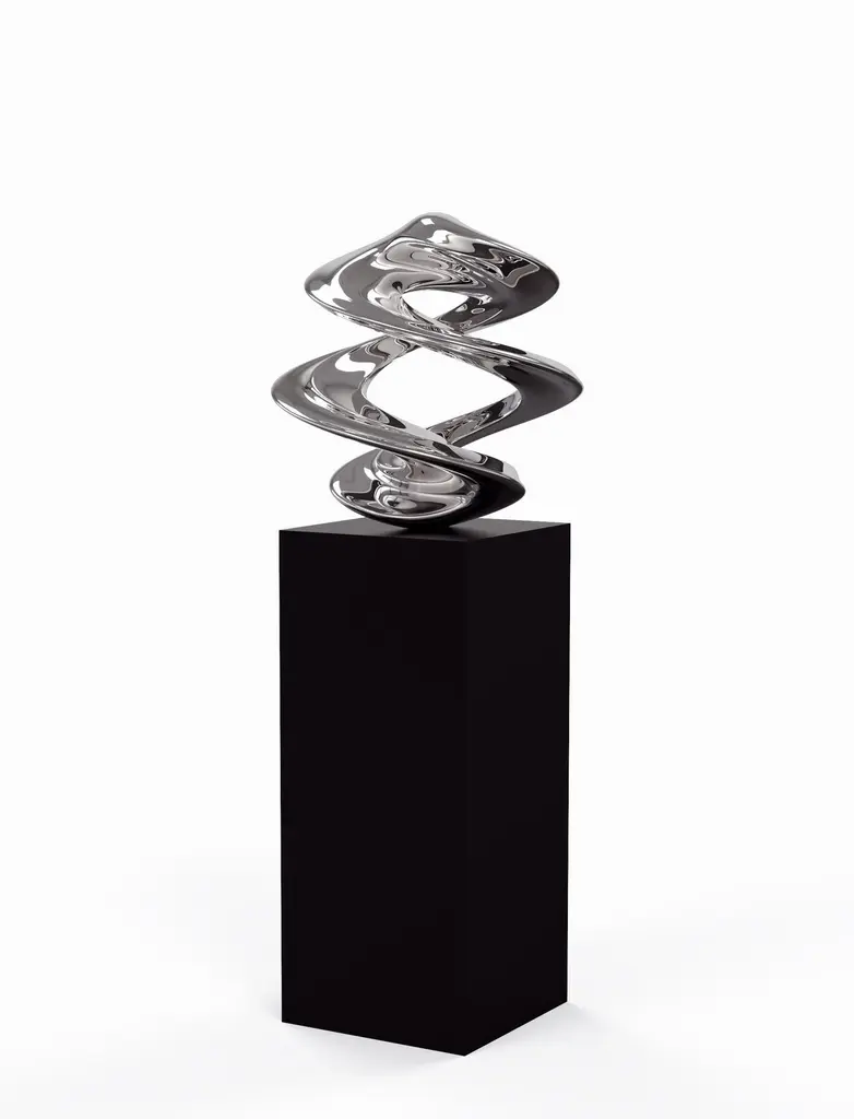 Torus Spiralis from the Geometra Collection is a striking sculptural piece that embodies the intersection of mathematical precision and organic fluidity. Crafted from Katz Studio's proprietary resin and finished with a high-gloss chrome-like surface, the sculpture captures and reflects light in captivating ways. The highly polished metallic exterior creates an illusion of liquid metal frozen in motion. The fabrication process involved advanced 3D modeling to achieve the complex, interwoven geometries. The resin is then carefully produced via additive manufacturing and polished to a mirror-like sheen, showcasing the studio's mastery of their signature material.Aesthetically, Torus Spiralis presents a captivating visual paradox. Its solid form conveys a sense of weighty presence, yet the curving lines and negative spaces imbue it with a feeling of lightness and movement. As viewers move around the piece, shifting reflections and shadows create an ever-changing interplay of light.Conceptually, the work explores themes of infinity, interconnectedness, and the convergence of mathematics and nature. The spiraling, interlocked forms evoke DNA helixes, Möbius strips, and other naturally occurring spiral patterns. There's a meditative quality to following the continuous flow of the curves with one's eyes.Torus Spiralis exemplifies Katz Studio's core philosophy of revealing the extraordinary beauty inherent in mathematical and geometric forms. It pushes the boundaries of what's possible with their resin medium, achieving a mesmerizing balance between structure and fluidity.As with many Katz Studio works, this piece is available in various finishes to suit different environments. While the chrome-like surface creates striking contrasts, options like brushed metal or matte finishes could offer a more subdued presence. The black pedestal provides an elegant, minimalist base that allows the sculptural form to take center stage.Torus Spiralis stands as a testament to Katz Studio's unique vision - creating works that are at once intellectually engaging and sensuously beautiful, bridging the realms of fine art, design, and scientific exploration.