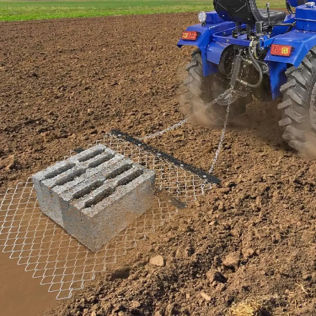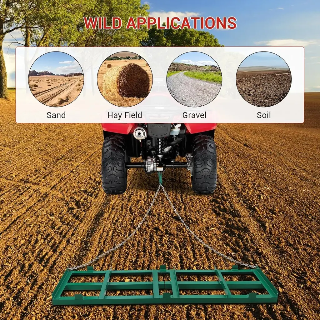 【Simple and Quick Attachment】Meet our Land Leveler - designed for hassle-free attachment with a user-friendly mechanism that allows for a swift and secure connection to a wide range of ATVs and UTVs. Spend less time fumbling with setups and more time achieving that smooth, even terrain you desire! Plus, you can enhance weight and plow depth by easily adding bricks or stones, giving you the flexibility to customize your tool for any specific land leveling project you have in mind.【Versatile for Every Outdoor Task】Our Land Leveler is the versatile solution you've been looking for! Whether you're preparing a hay field for planting or maintaining gravel driveways and pathways, this adaptable tool can tackle a broad spectrum of outdoor applications without breaking a sweat. Its efficient design means you'll be able to handle a variety of landscaping tasks with ease, making it a valuable addition to your toolkit.【Plow Deeper with Confidence】Equipped with a heavy-duty road rake, our Land Leveler is engineered to plow deeper, effortlessly handling challenging terrains. With a robust weight capacity of 50lbs, this rugged rake is perfect for heavy-duty jobs, ensuring you can efficiently level and smooth various surfaces. Experience the power of deep plowing that enhances your workflow and delivers exceptional results every time.【Built for Efficiency and Durability】Crafted with premium-grade steel and a sturdy construction, our Land Leveler is meticulously engineered for quick and effective land leveling that stands the test of time. The impressive wide drag level design allows you to cover larger areas in less time, making your landscaping tasks more efficient than ever. Prepare to tackle your projects with a tool that's as tough as the jobs you take on!【Assembly Made Easy】Getting started with your Land Leveler is a breeze! Just follow these simple steps: 1.Place the Land Leveler on the ground outside. 2.Align and securely screw in each side of the unit. 3.Attach the chain to the designated area. 4.Easily hitch the Land Leveler to your mower or tractor for immediate use. With these straightforward assembly instructions, you'll be ready to dive into your land leveling projects in no time!