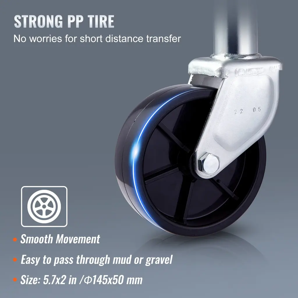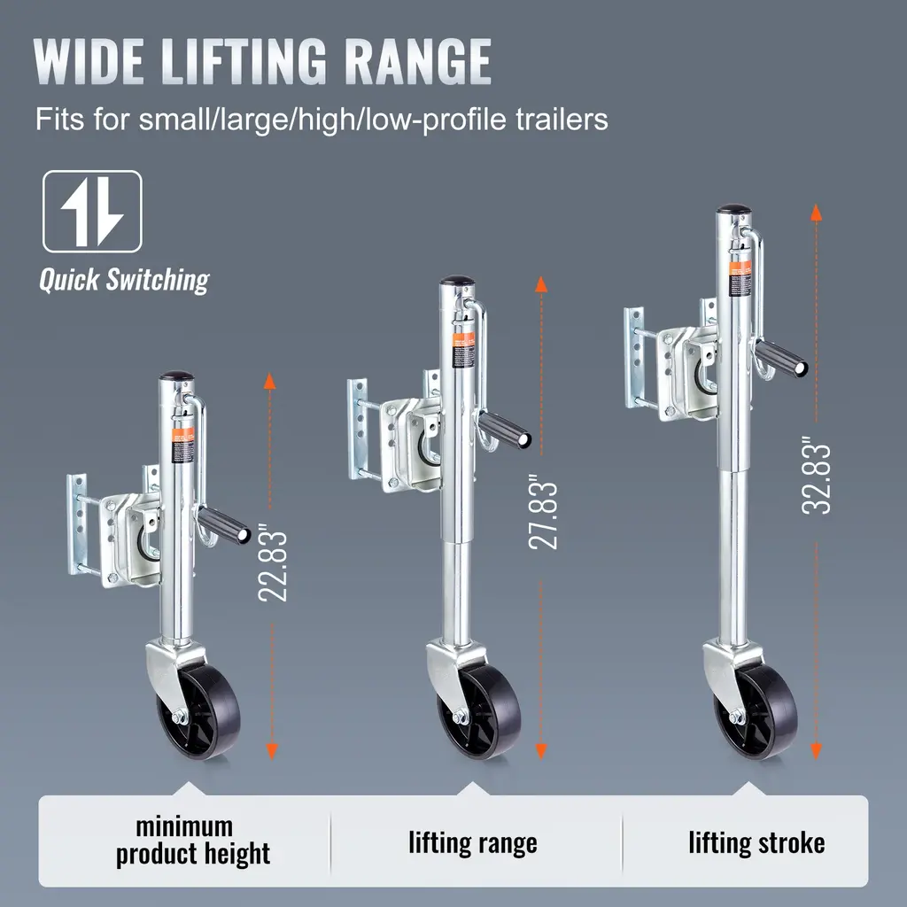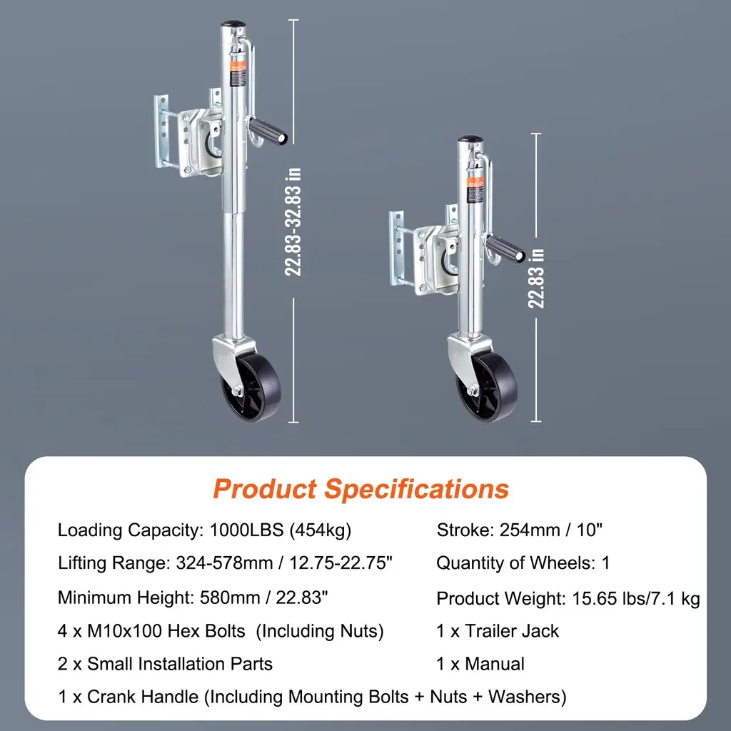 Heavy-Duty Load Capacity: The trailer jack boasts an impressive lifting capacity of 2000 lbs / 1000 lbs, making it a powerful tool for lifting tasks. With a lifting range of 12.51 to 22.52 inches (2000 lbs option) / 12.75 to 22.75 inches (1000 lbs option), it fits for no matter high-profile or low-profile trailers. Easy Installation: Our boat trailer jack comes with all the necessary parts and detailed assembly instructions. It can be bolted or welded onto the trailer tongue and has a swivel function that allows it to swing up parallel to the tongue for easy maneuverability. Designed for Stability & Durability: This trailer jack stand is engineered to deliver exceptional stability and long-lasting performance. Crafted from heavy-duty carbon steel, it offers maximum strength and rigidity. The galvanized inner and outer tubes and powder finish provide enhanced corrosion resistance. Powerful PP Tires: The trailer tongue jack is equipped with PP tires that provide a larger surface area for smooth and stable movement. The tires are more stable and less prone to sinking. They can withstand mud, gravel, and sharp rocks without getting stuck or damaged. The tread pattern helps prevent sliding on wet surfaces. Versatile Application: This powerful boat jack is ideal for a wide range of applications. Whether you're lifting travel trailers, horse trailers, or multi-purpose trailers, it offers the strength and stability you needed. It features a detachable handle that can be used for manual operation in case of power outage or emergency situations. 2000 lbs Package Content 1 x Trailer Jack 1 x Crank Handle (Including Mounting Bolts + Nuts + Washers) 4 x Outer M10x110 Outer Hex Bolt 4 x Outer Hexagon Lock Nut M10 2 x Small Installation Parts 1 x Manual 1000 lbs Package Content 1 x Trailer Jack 1 x Crank Handle (Including Mounting Bolts + Nuts + Washers) 4 x M10x100 Hex Bolts (Including Nuts) 2 x Small Installation Parts 1 x Manual