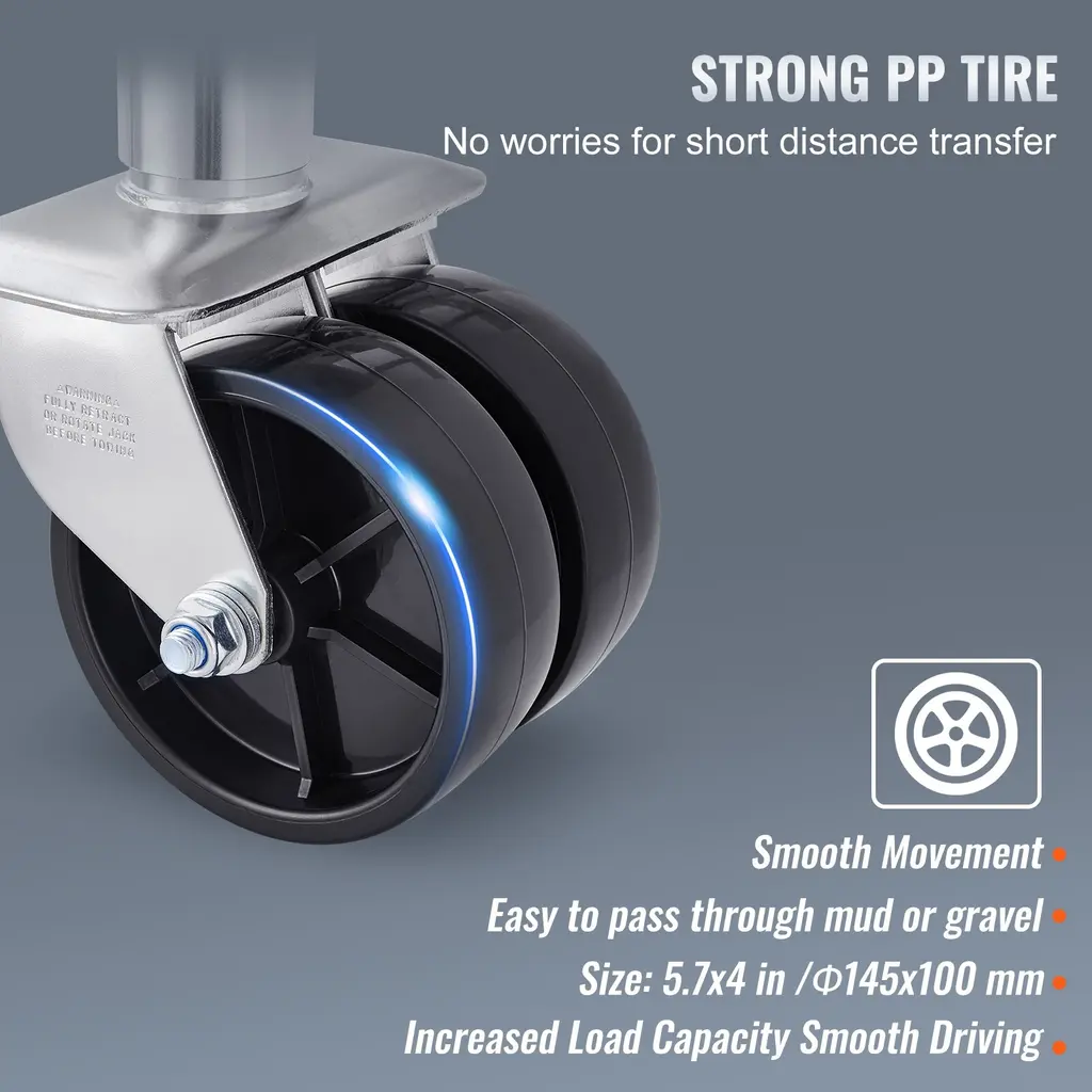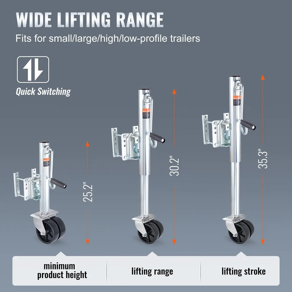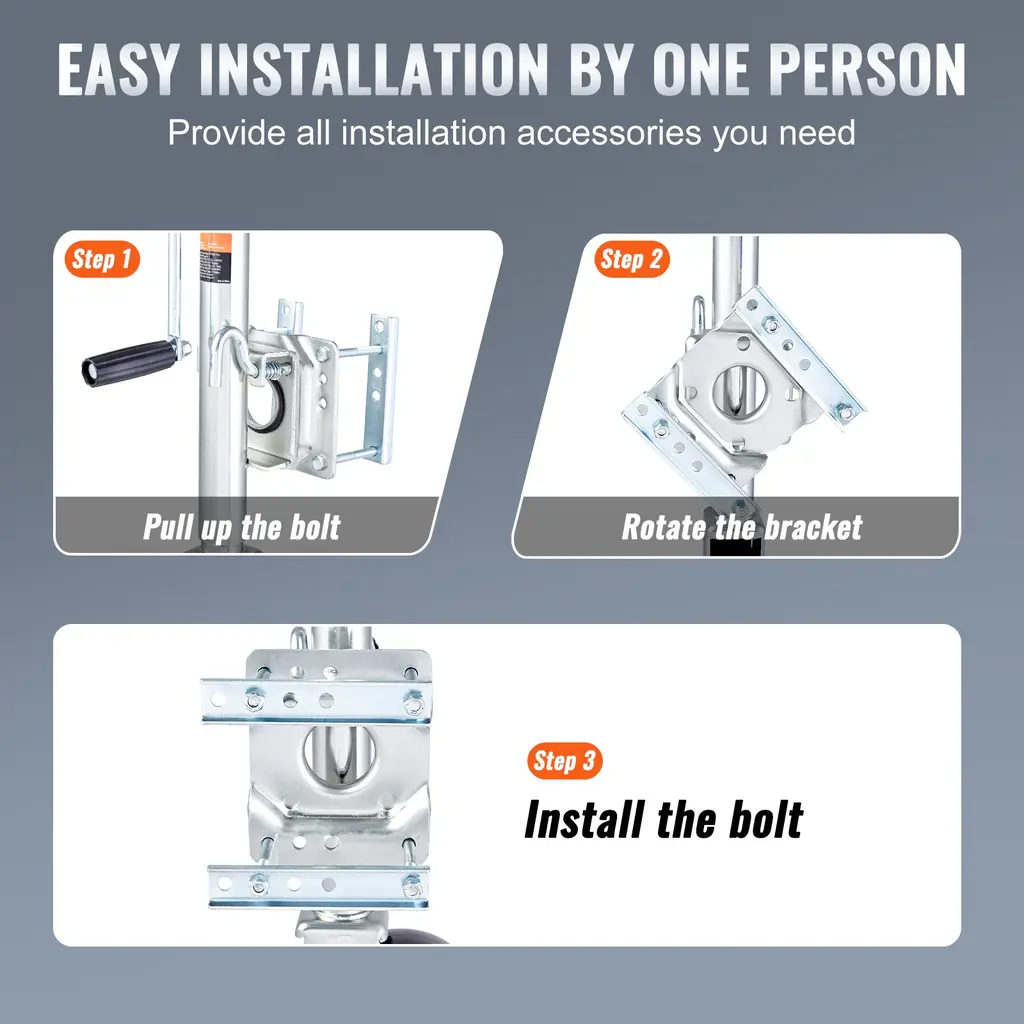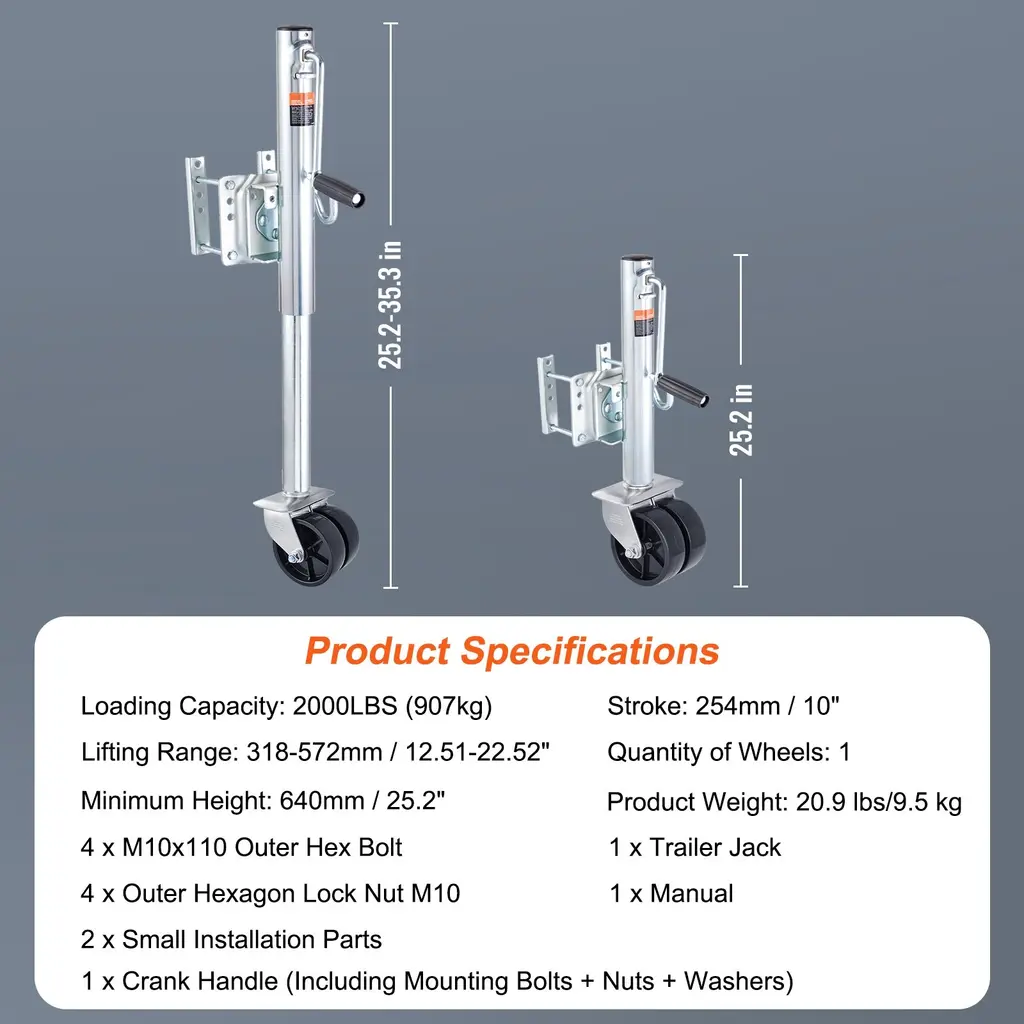Heavy-Duty Load Capacity: The trailer jack boasts an impressive lifting capacity of 2000 lbs / 1000 lbs, making it a powerful tool for lifting tasks. With a lifting range of 12.51 to 22.52 inches (2000 lbs option) / 12.75 to 22.75 inches (1000 lbs option), it fits for no matter high-profile or low-profile trailers. Easy Installation: Our boat trailer jack comes with all the necessary parts and detailed assembly instructions. It can be bolted or welded onto the trailer tongue and has a swivel function that allows it to swing up parallel to the tongue for easy maneuverability. Designed for Stability & Durability: This trailer jack stand is engineered to deliver exceptional stability and long-lasting performance. Crafted from heavy-duty carbon steel, it offers maximum strength and rigidity. The galvanized inner and outer tubes and powder finish provide enhanced corrosion resistance. Powerful PP Tires: The trailer tongue jack is equipped with PP tires that provide a larger surface area for smooth and stable movement. The tires are more stable and less prone to sinking. They can withstand mud, gravel, and sharp rocks without getting stuck or damaged. The tread pattern helps prevent sliding on wet surfaces. Versatile Application: This powerful boat jack is ideal for a wide range of applications. Whether you're lifting travel trailers, horse trailers, or multi-purpose trailers, it offers the strength and stability you needed. It features a detachable handle that can be used for manual operation in case of power outage or emergency situations. 2000 lbs Package Content 1 x Trailer Jack 1 x Crank Handle (Including Mounting Bolts + Nuts + Washers) 4 x Outer M10x110 Outer Hex Bolt 4 x Outer Hexagon Lock Nut M10 2 x Small Installation Parts 1 x Manual 1000 lbs Package Content 1 x Trailer Jack 1 x Crank Handle (Including Mounting Bolts + Nuts + Washers) 4 x M10x100 Hex Bolts (Including Nuts) 2 x Small Installation Parts 1 x Manual
