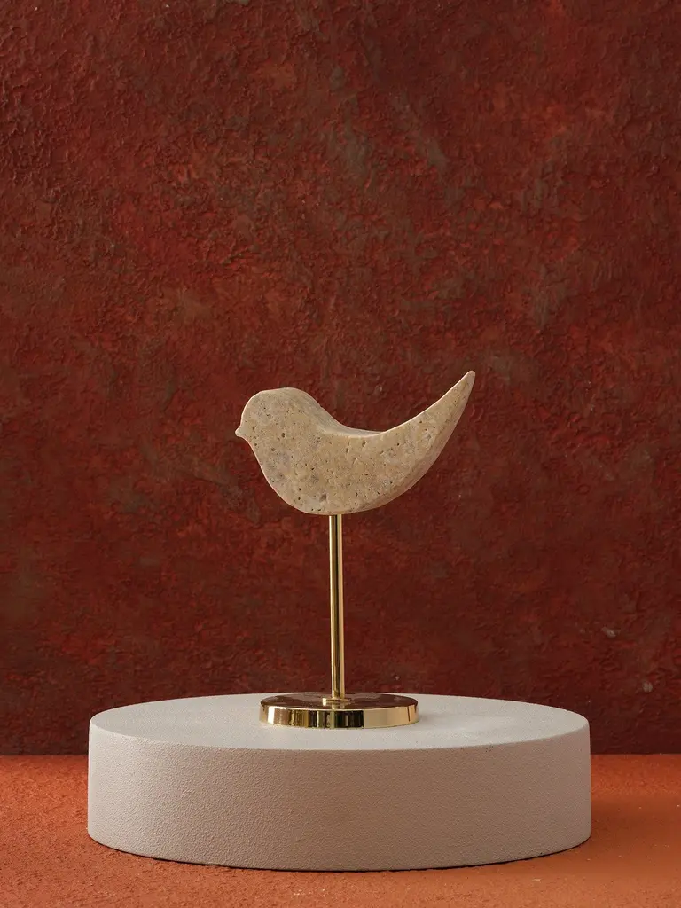 Graceful and serene, the Travertine Bird Sculpture With Brass Stand captures the essence of nature in a refined, minimalist form. Hand-carved from warm-toned travertine, the bird’s smooth contours and gently curved tail evoke a quiet sense of movement and peace. Elevated on a slender, polished brass rod and mounted on a matching base, this piece adds an airy, sculptural touch to bookshelves, desks, or mantels. It’s a thoughtful blend of organic material and modern design—perfect for lovers of quiet beauty and timeless craft.