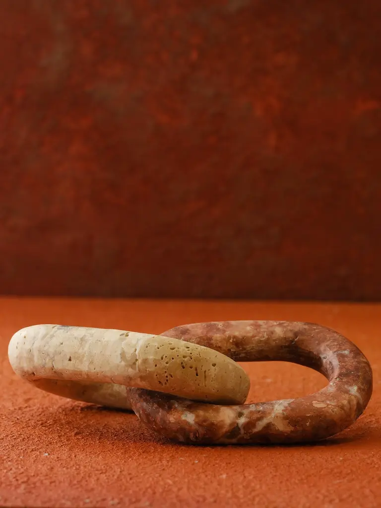 The Travertine Double Chain Sculpture brings a bold, contemporary elegance to your space. Hand-carved from rich, natural travertine, each interlocking link showcases the stone’s inherent textures and warm earthy tones. Symbolizing connection and strength, this sculptural piece offers visual interest whether displayed on a coffee table, bookshelf, or console. Its organic form and raw materiality celebrate craftsmanship and timeless design, making it a refined centerpiece for modern interiors.