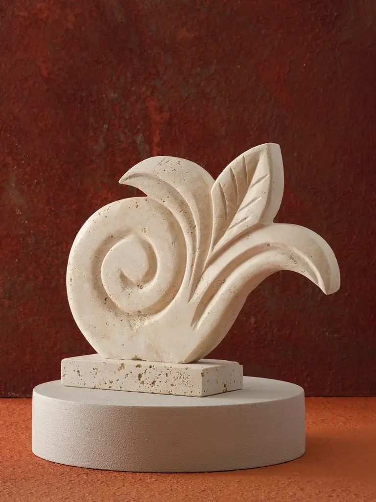 The Travertine Laurel Sculpture draws inspiration from classical motifs, reinterpreting the elegance of ancient forms through a modern, sculptural lens. Hand-carved from natural beige travertine, the design features a dynamic spiral paired with laurel leaves—symbols of growth, peace, and triumph. Resting on a solid travertine base, the piece balances softness and structure, making it a refined focal point for consoles, shelves, or mantels. Its textured surface and graceful contours catch the light beautifully, bringing depth and timeless character to any interior.