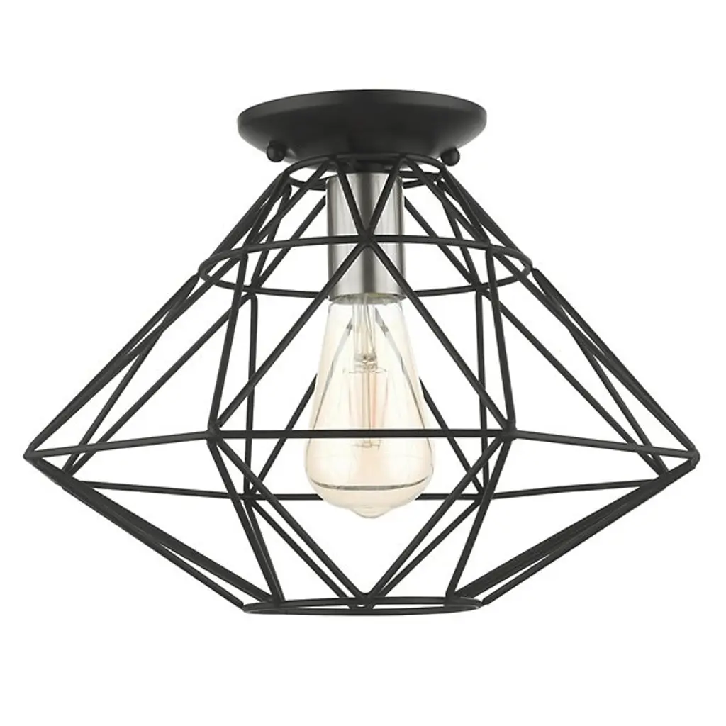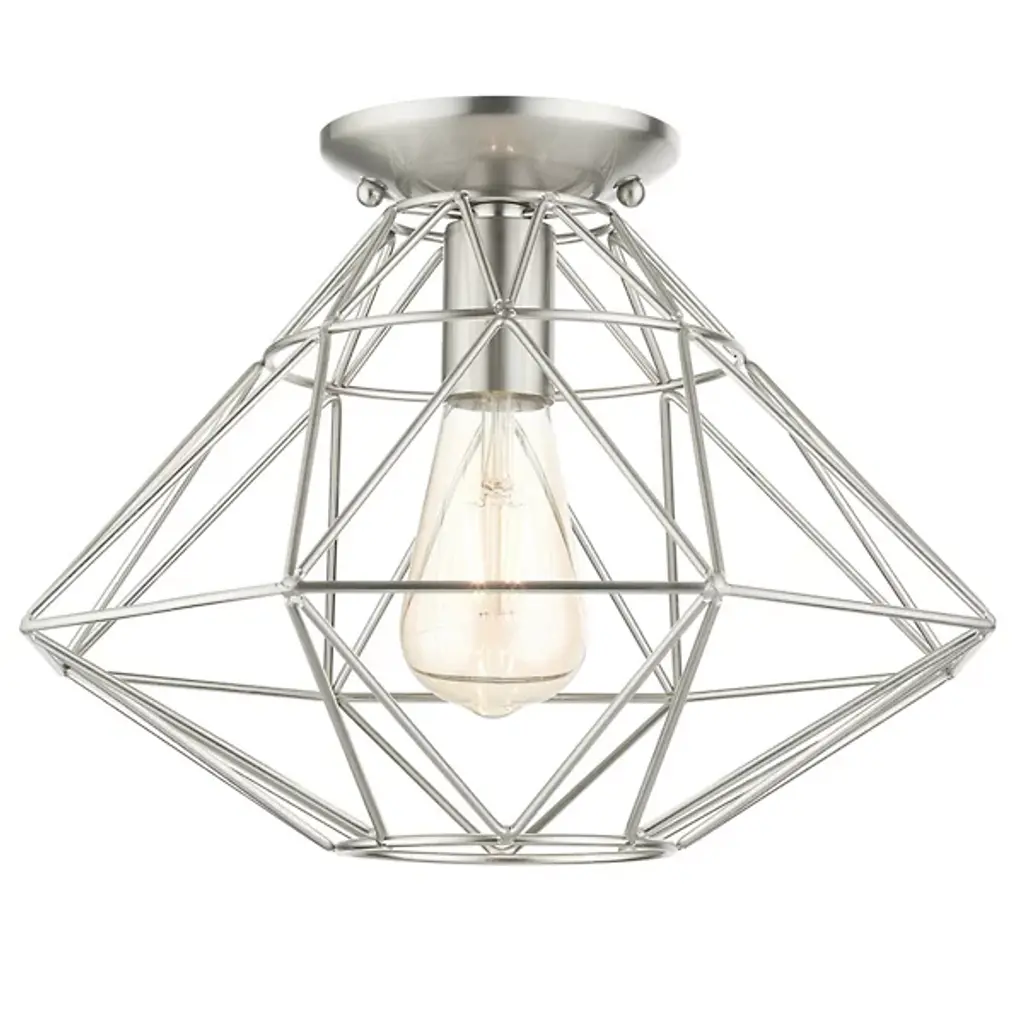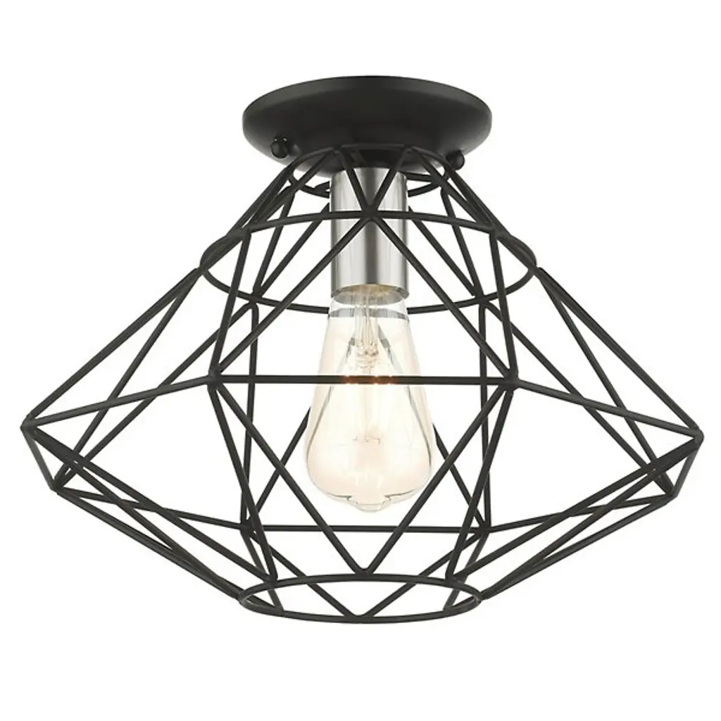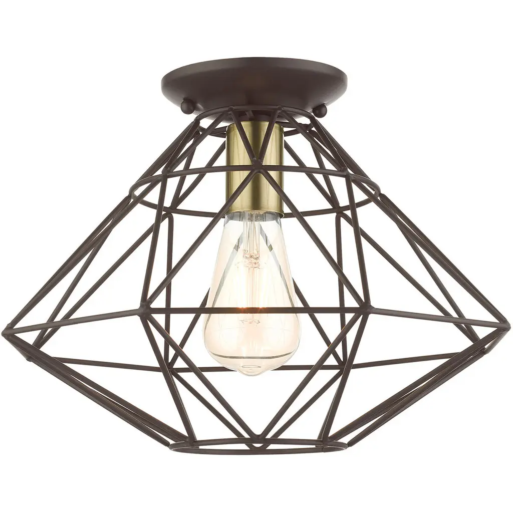 A dazzling diamond realized with pure geometry. The Trent Flushmount from Alder & Ore steps up the contemporary, high-design aesthetic of the home as a piece of functional sculpture. It sits tight to the ceiling with a low-profile canopy. The flush mount offers an impactful visual even with the lights off. Artisans hand-weld the caged structure from a bevy of dynamic shapes. Its shapes come together to create an elegant, inverted diamond, underscored by its open feeling. The open passages of the diamond showcase the delightful bulb. The flush mount turns on to create a filling glow and a wondrous silhouette.
