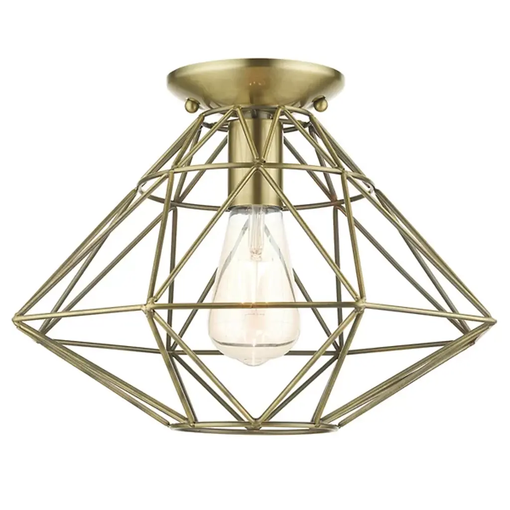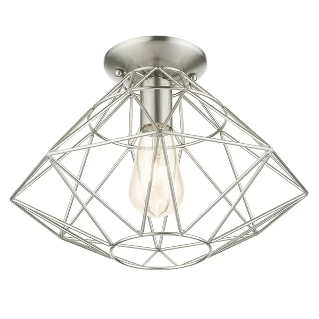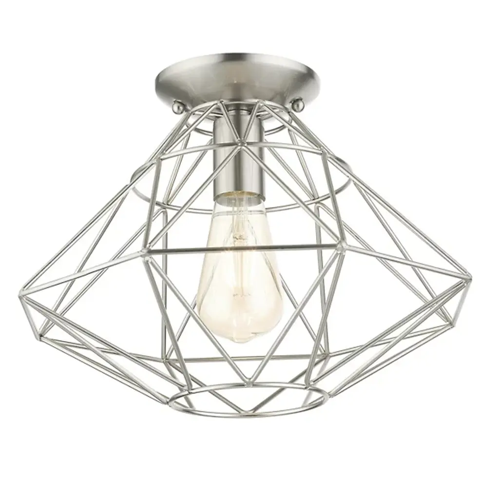 A dazzling diamond realized with pure geometry. The Trent Flushmount from Alder & Ore steps up the contemporary, high-design aesthetic of the home as a piece of functional sculpture. It sits tight to the ceiling with a low-profile canopy. The flush mount offers an impactful visual even with the lights off. Artisans hand-weld the caged structure from a bevy of dynamic shapes. Its shapes come together to create an elegant, inverted diamond, underscored by its open feeling. The open passages of the diamond showcase the delightful bulb. The flush mount turns on to create a filling glow and a wondrous silhouette.